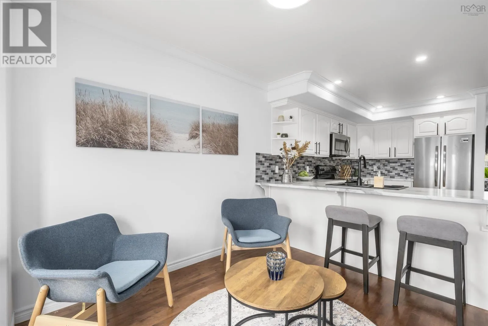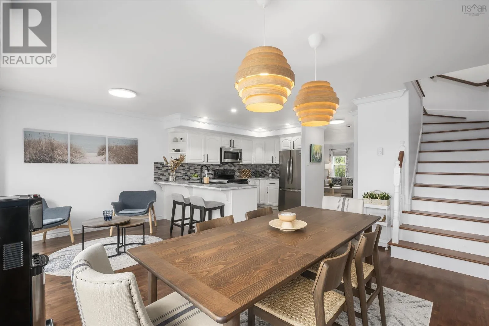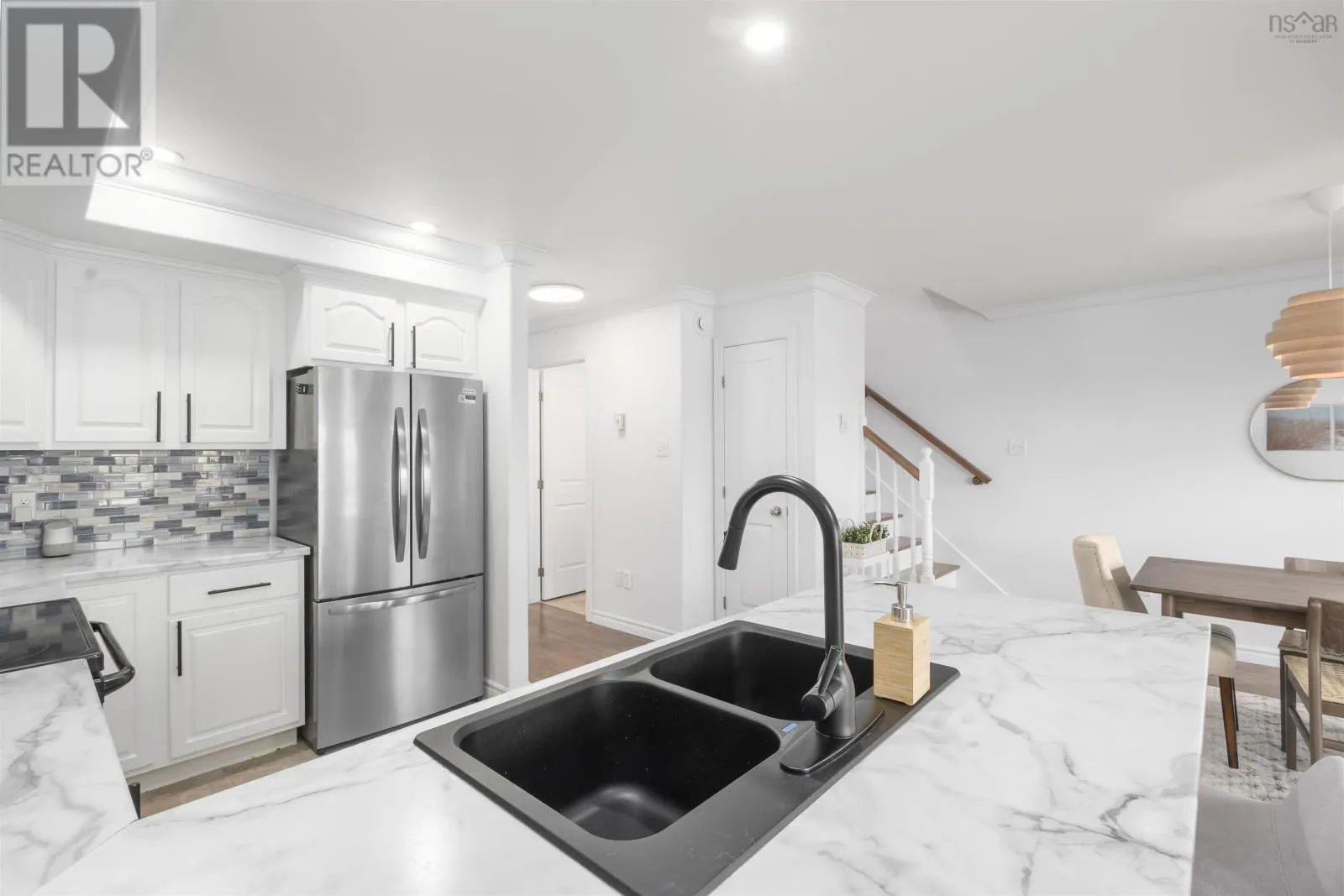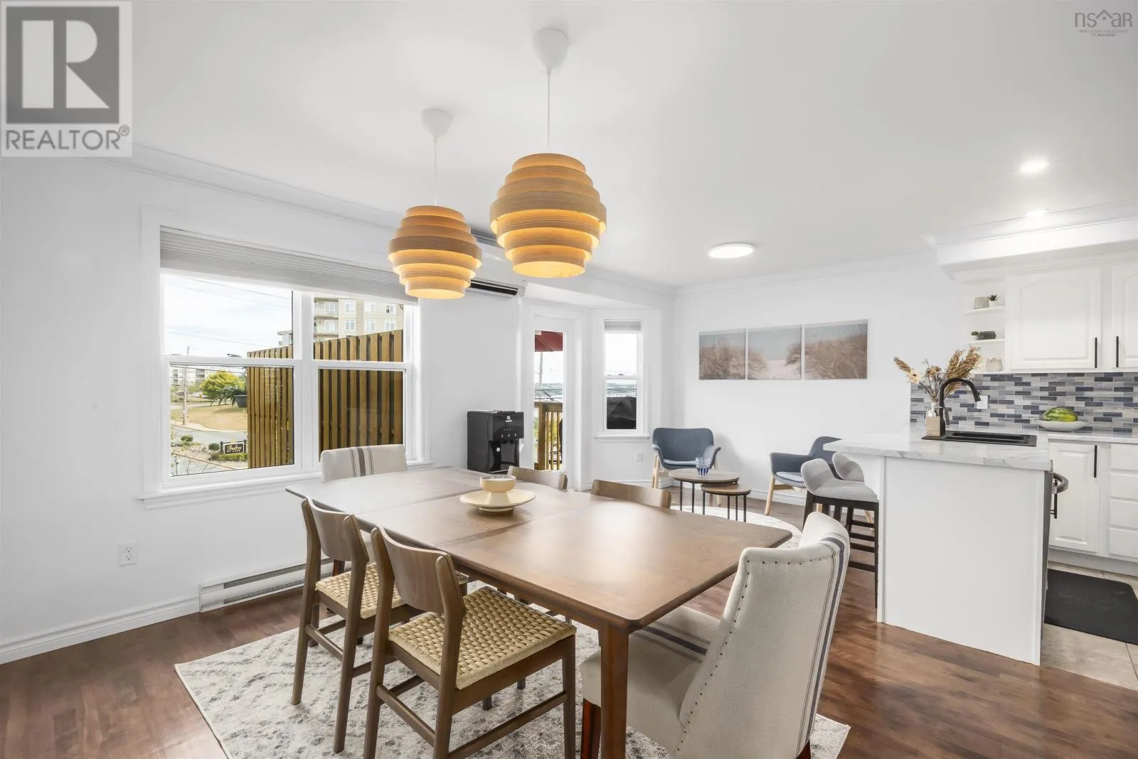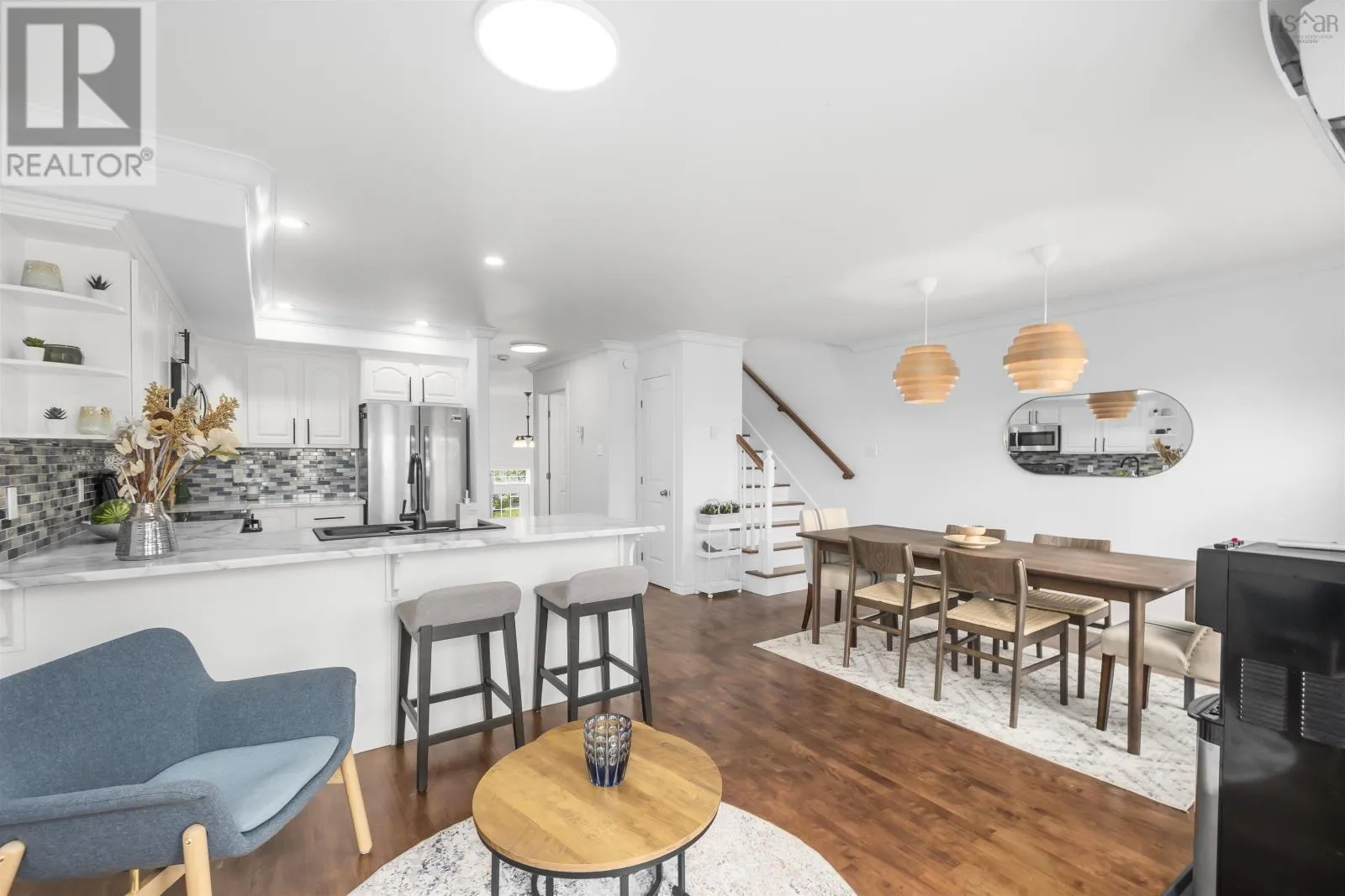 Larry Uteck left onto Starboard right onto Brigadier Welcome to 5 Brigadier Court in Larry Uteck! This beautifully maintained three-bedroom townhome offers a functional layout ideal for family living, perfectly situated near schools, parks, and a variety of amenities. Filled with natural light throughout, the spacious living room flows seamlessly into the updated white kitchen. The open concept design connects the dining and lounging areas and makes entertaining easy. The ductless heat pump provides efficient heating/cooling for year round comfort. The walkout leads to a large back deck with views of the Bedford Basin. Upstairs, the primary retreat features a full ensuite, walk-in closet, and a second ductless heat pump. Two additional bedrooms, a full bathroom and a laundry room complete this level. The lower level offers a cozy family room perfect for movie nights, a half bath, and convenient garage access. With thoughtful upgrades and meticulous care, this property is ready for you to call home. A terrific find for $569,900! (id:27476)