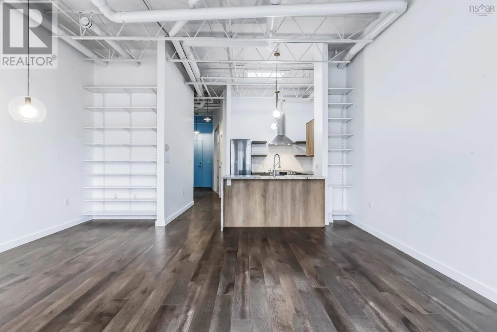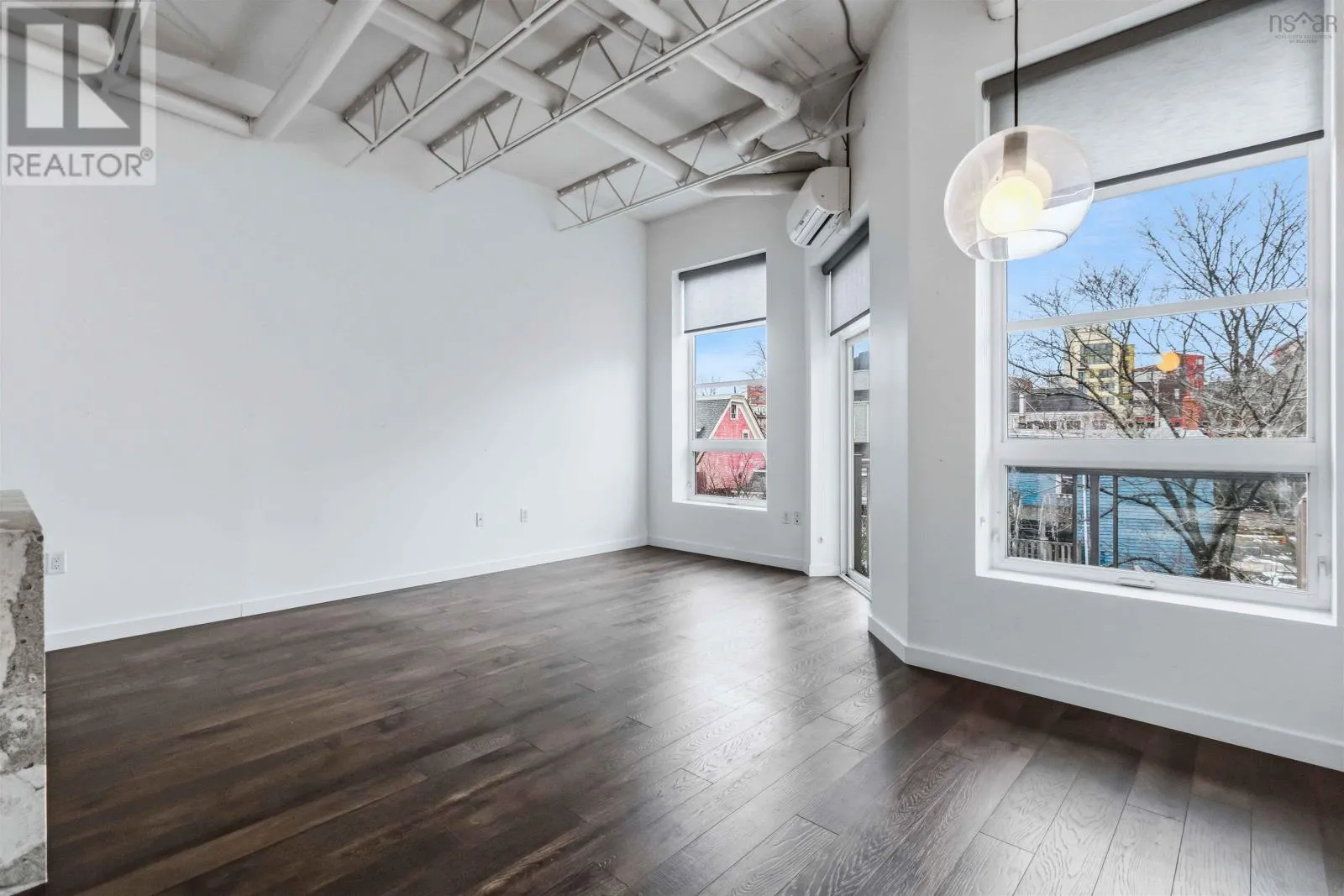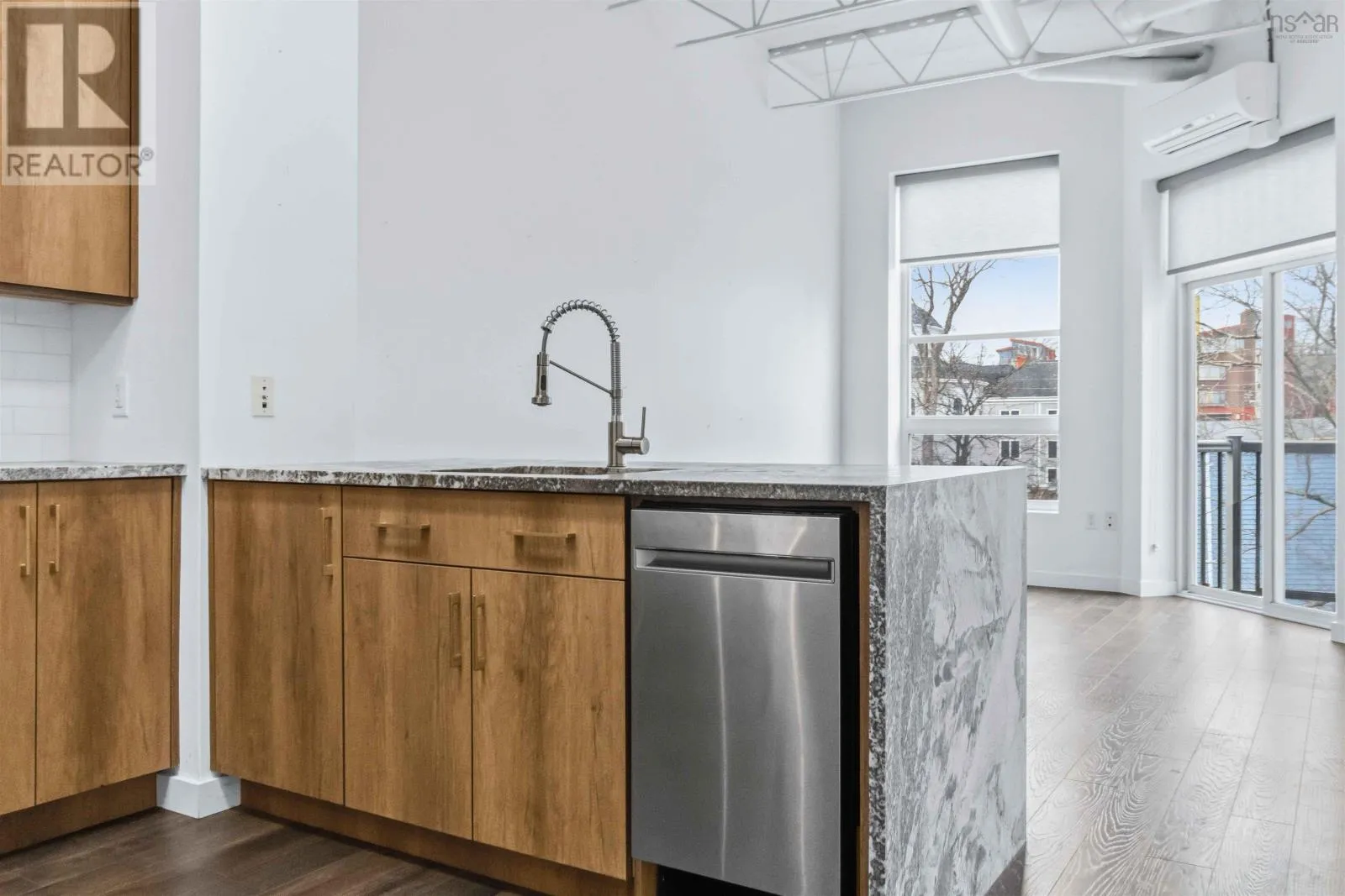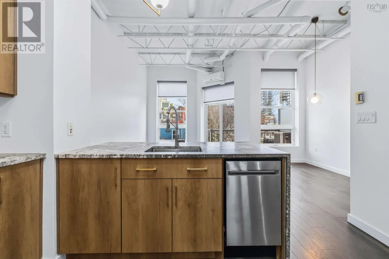 Brunswick Street to Nora Bernard Street/ Barrington Street to Nora Bernard Street. Welcome, to this modern, stunning and fully renovated condo! This top-floor west-facing suite in the coveted Spice building sits just steps from Lower Water Streets amenities and moments from downtown. Rarely available, this fifth-floor unit has been completely transformed with upgraded kitchen cabinetry and quartz waterfall counters, new flooring, a stylish new bathroom with a walk-in glass-and-tile shower, and all-new lighting. A welcoming hallway leads past the spacious skylit bedroom, in-unit laundry, and elegant bath before opening into the showstopping great room, filled with natural light from soaring windows and accented by lofted ceilings with exposed rafters and ductwork. The luxurious kitchen flows seamlessly into the expansive living and dining areas, complemented by custom built-in shelving, while the sunny, quiet balcony overlooks charming Victorian rooftops and mature trees. Additional highlights include a heat pump, in-floor heating, a deeded two-car tandem parking space, a storage unit, access to the buildings gym, and pet-friendly living of any size. This is a rare chance to own one of the buildings most desirable top-floor suitesbe sure to explore the videos and 3D tour, and book your private showing today. (id:27476)
