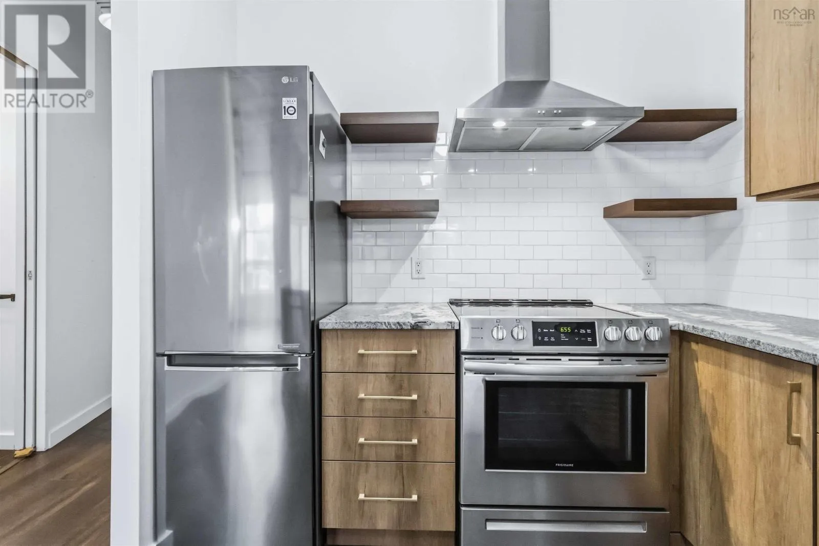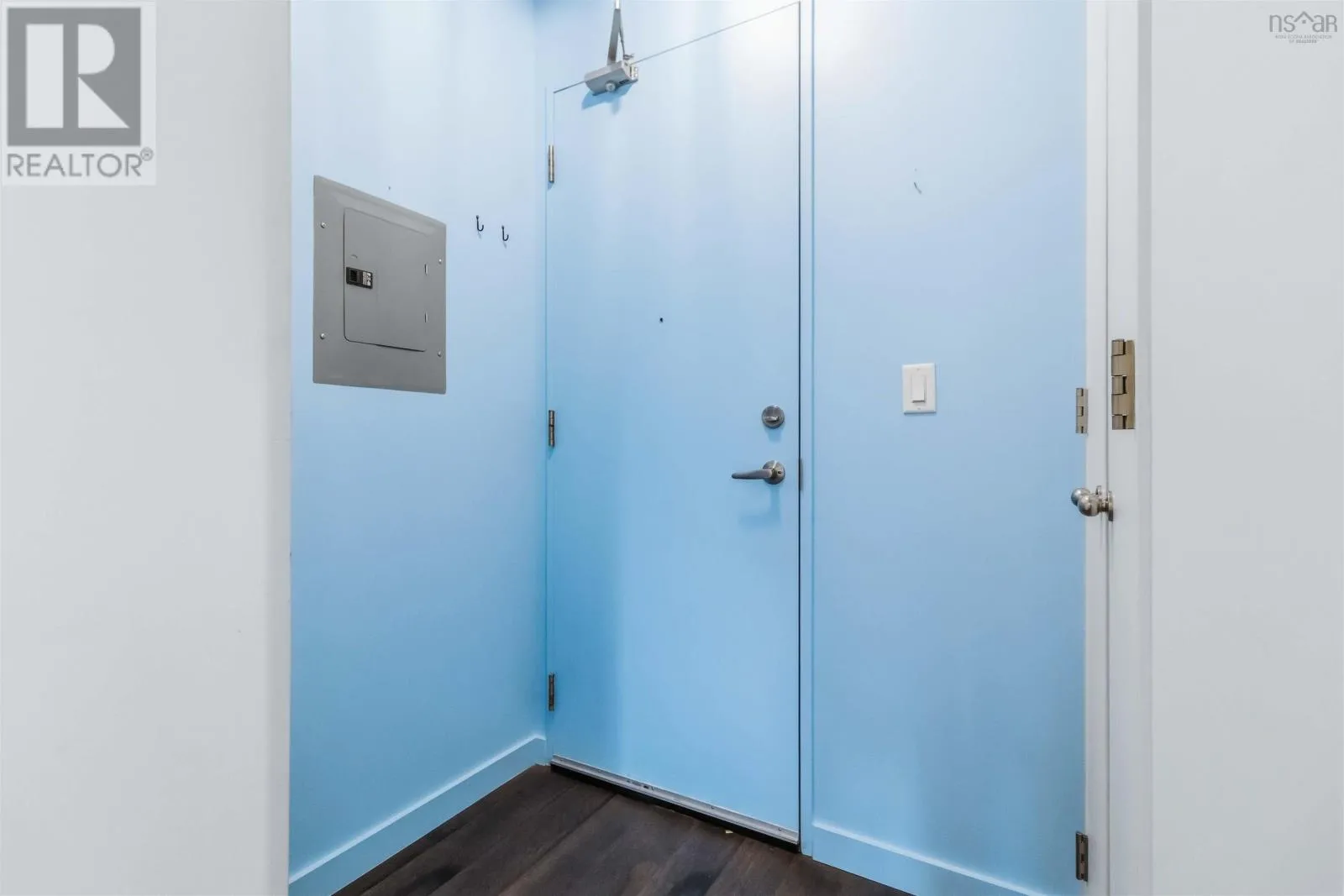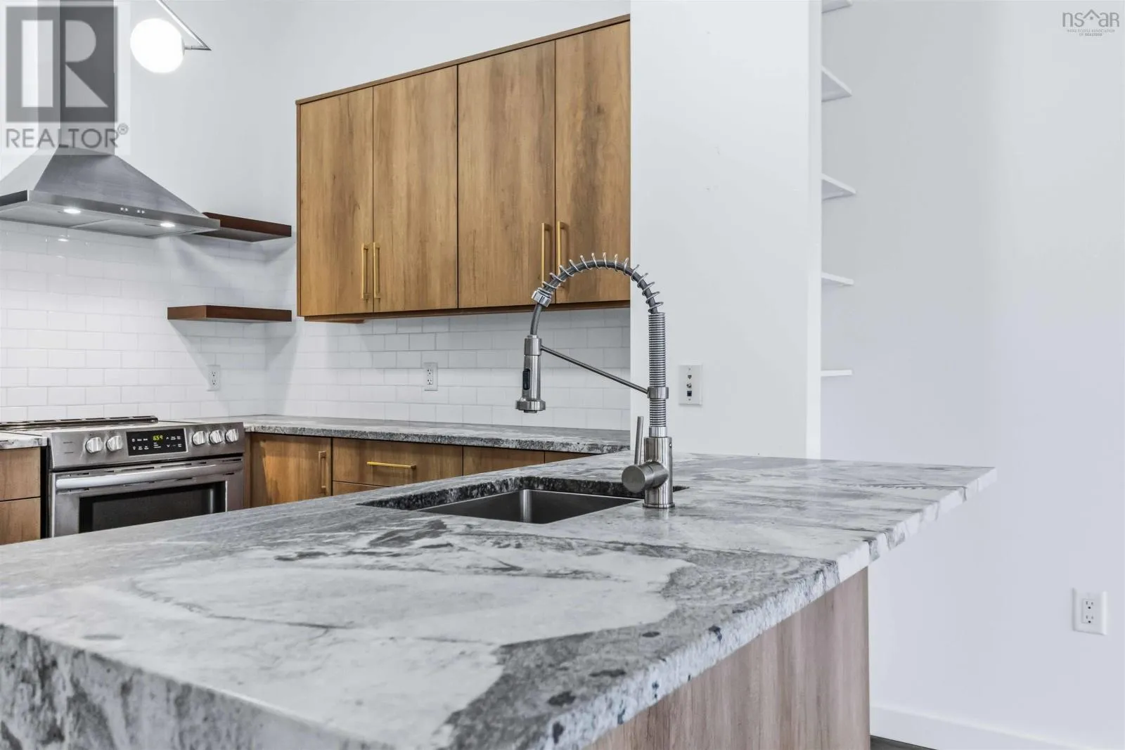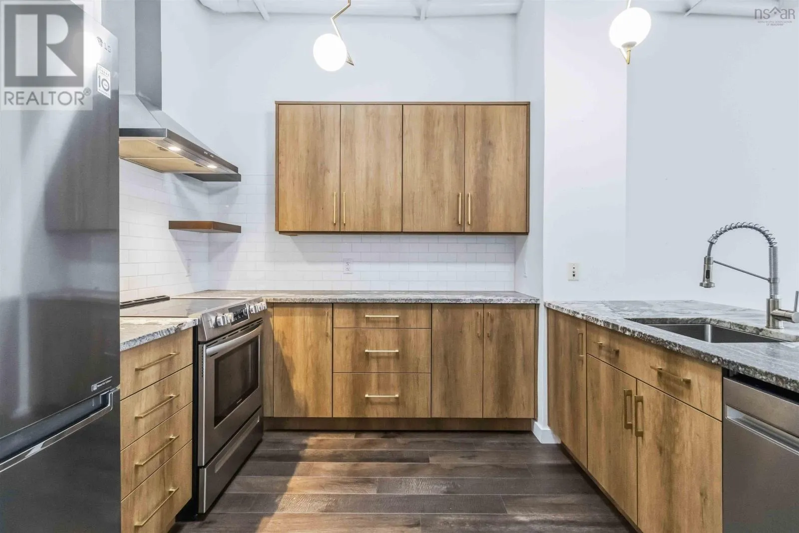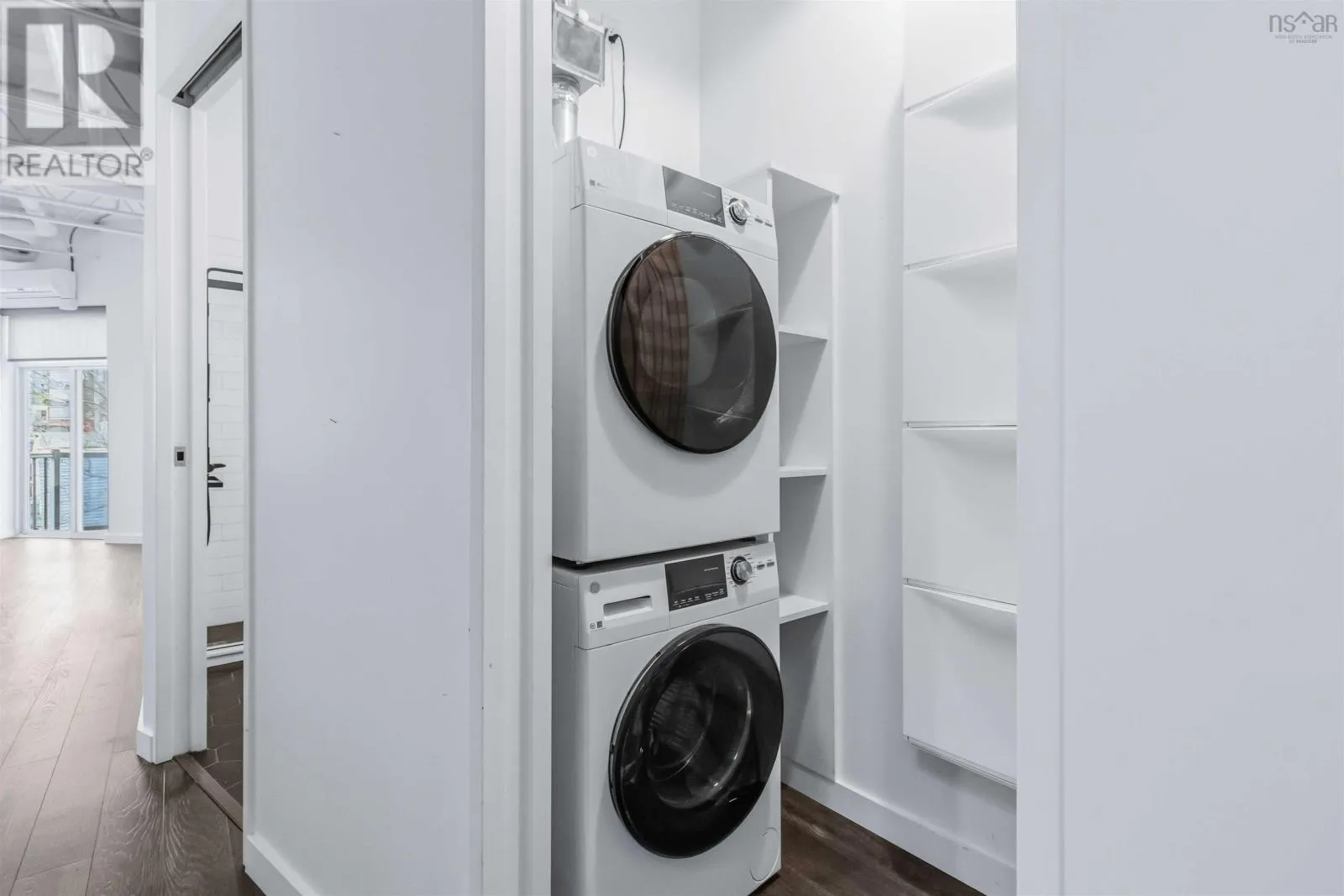 Brunswick Street to Nora Bernard Street/ Barrington Street to Nora Bernard Street. Welcome, to this modern, stunning and fully renovated condo! This top-floor west-facing suite in the coveted Spice building sits just steps from Lower Water Streets amenities and moments from downtown. Rarely available, this fifth-floor unit has been completely transformed with upgraded kitchen cabinetry and quartz waterfall counters, new flooring, a stylish new bathroom with a walk-in glass-and-tile shower, and all-new lighting. A welcoming hallway leads past the spacious skylit bedroom, in-unit laundry, and elegant bath before opening into the showstopping great room, filled with natural light from soaring windows and accented by lofted ceilings with exposed rafters and ductwork. The luxurious kitchen flows seamlessly into the expansive living and dining areas, complemented by custom built-in shelving, while the sunny, quiet balcony overlooks charming Victorian rooftops and mature trees. Additional highlights include a heat pump, in-floor heating, a deeded two-car tandem parking space, a storage unit, access to the buildings gym, and pet-friendly living of any size. This is a rare chance to own one of the buildings most desirable top-floor suitesbe sure to explore the videos and 3D tour, and book your private showing today. (id:27476)