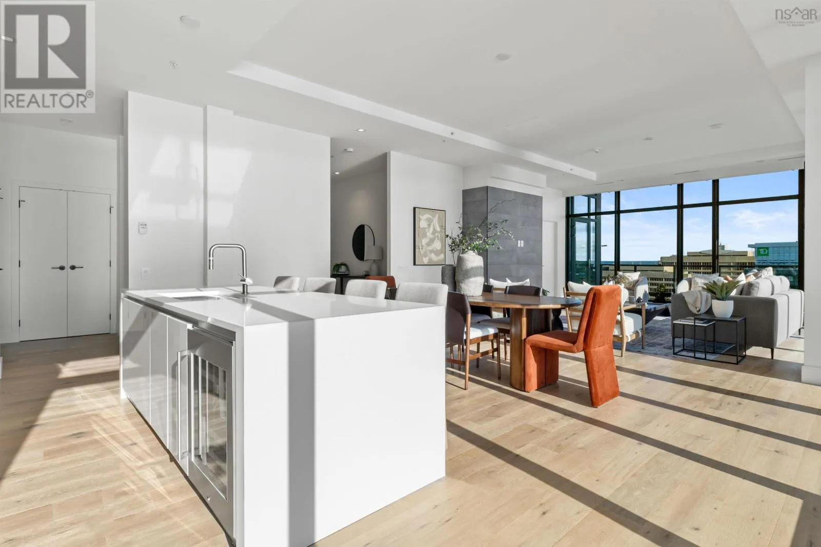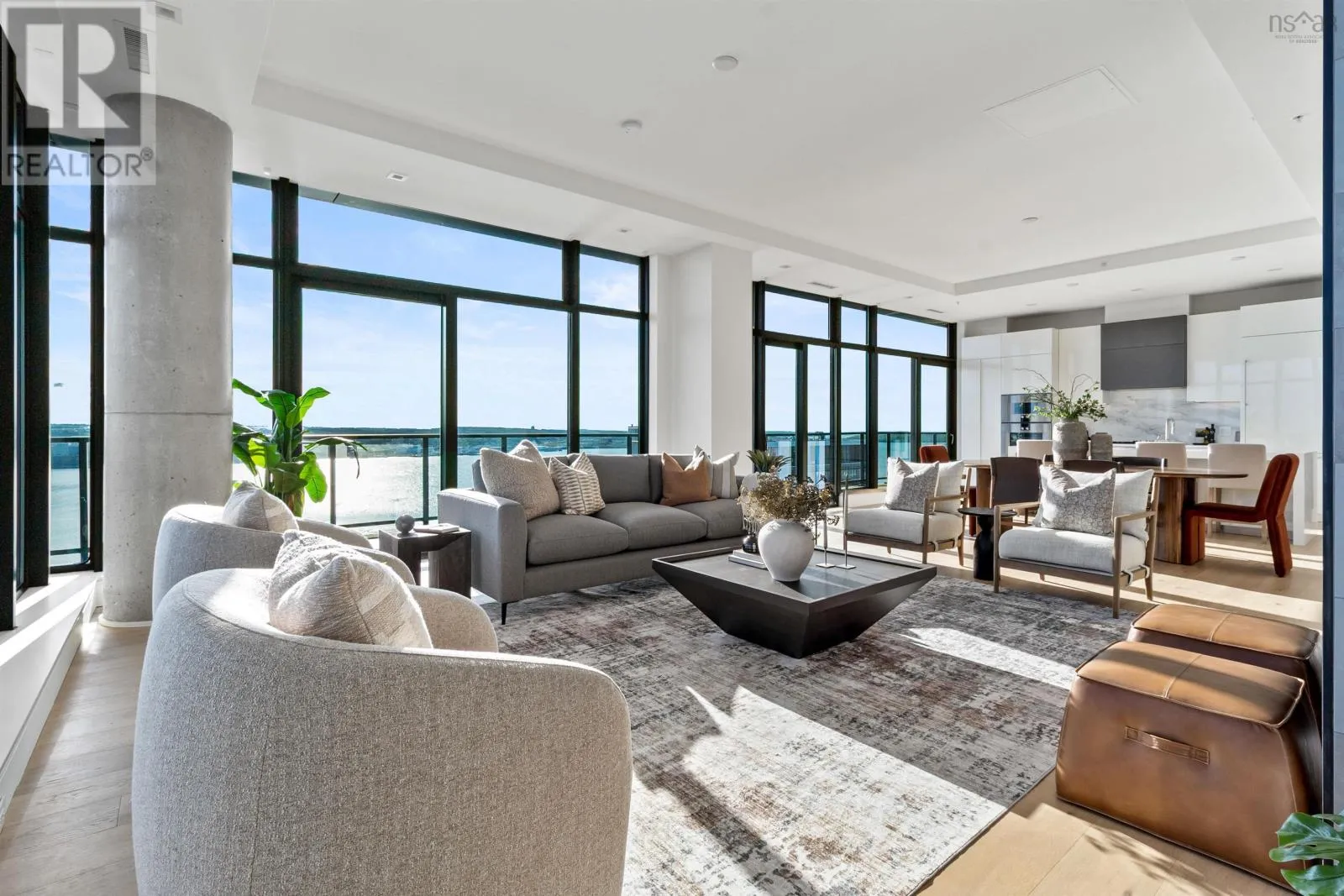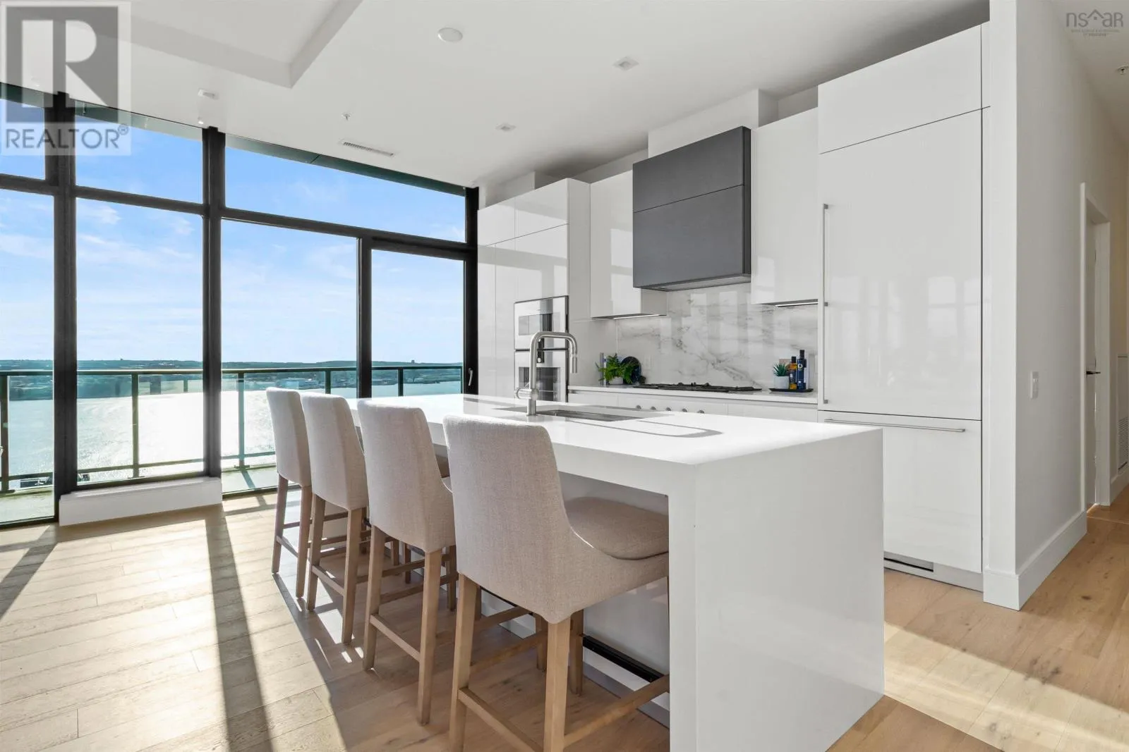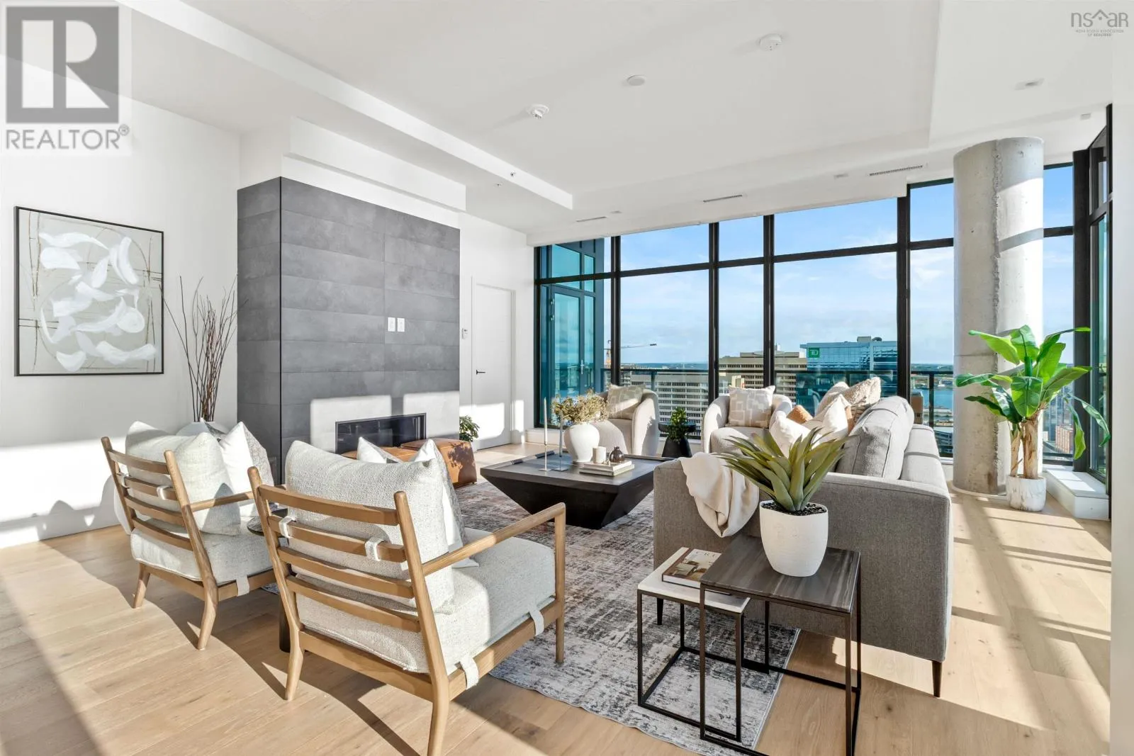 The lobby is on the corner of Sackville and Granville Street. Welcome to The Apex a newly offered penthouse that blends elevated design with breathtaking Halifax Harbour views at The Roy, the citys ultimate luxury residence. This thoughtfully designed 2,120 sq. ft. home offers a bright, modern layout that maximizes flow and functionality. Wall-to-wall windows frame the ever-changing waterfront, filling the great room with natural light and stunning views. The heart of The Apex is its contemporary kitchen, outfitted with premium Gaggenau appliances, crisp white quartz surfaces, and a striking Calacatta marble backsplash perfect for casual meals or elegant entertaining. The open-plan living and dining areas extend seamlessly to a generous 545 sq. ft. wraparound balcony, where mornings begin with sunrise coffee and evenings end with sunset cocktails over the harbour. Your tranquil primary suite includes a walk-in closet and spa-inspired ensuite with floating tub and heated floors. A spacious second bedroom, complete with its own ensuite, ensures comfort for guests or family. An elegant powder room, in-suite laundry, and ample storage round out this well-planned penthouse. Life at The Roy is designed for those who appreciate exceptional service: arrive via a state-of-the-art car elevator to secure indoor parking, while a dedicated 24-hour concierge handles the rest, from personal bookings at The Roy Club to everyday tasks. The amenity floor features everything you need: an indoor pool, steam room, sauna, gym, yoga studio, conference facilities, private theatre, library with billiards, and a stylish party room. At The Roy, everything for a life of luxury is right at home. But when youre ready to explore, Halifax secure, vibrant, and on the rise is waiting with acclaimed dining, lively shopping, the waterfront, and Citadel Hill just steps away. Step into this uppermost example of sophisticated living, where comfort, design, and views reach their zenith. (id:27476)