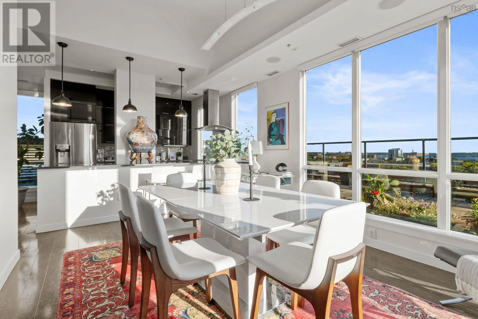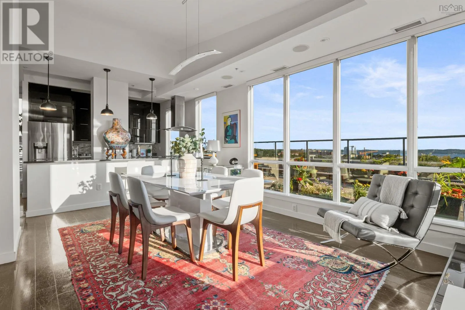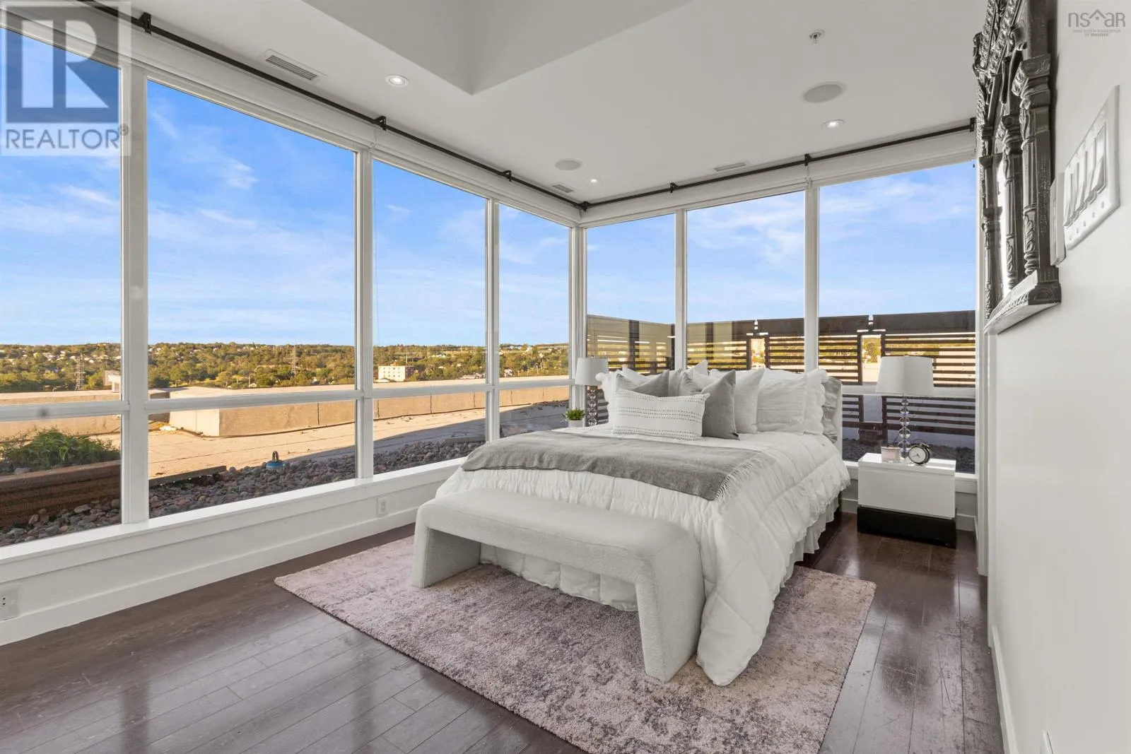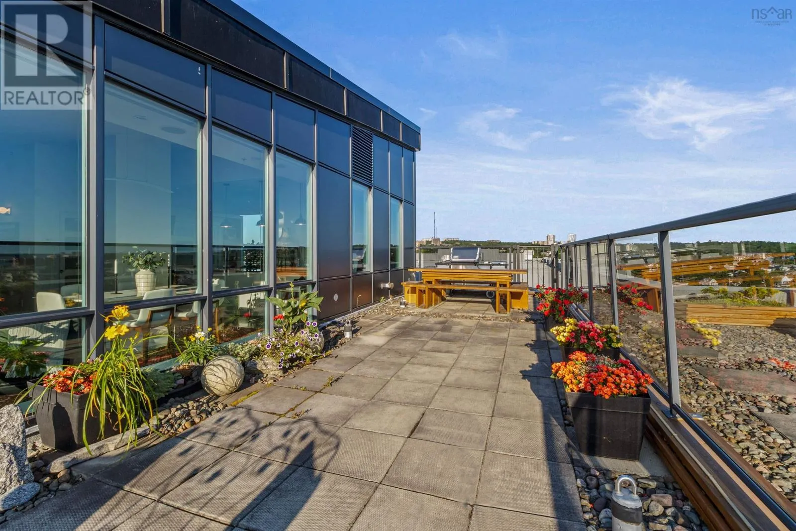 Joseph Howe to Dutch Village. Welcome to elevated city living in a rare rooftop penthouse residence offering approximately 750 sq. ft. of private outdoor terrace space and the ease of refined condo living. Perched atop the iconic St. Lawrence Place, this top floor home offers exceptional privacy with no shared walls and sweeping 360 degree views of the Bedford Basin, Northwest Arm, and city skyline. The residence spans just under approx. 1,400 sq. ft. of thoughtfully designed interior space plus a wraparound terrace and was designed by the current owner, a renowned Halifax architect responsible for over 140 buildings, ensuring every detail reflects intention and quality. Sun filled living and dining areas feature custom millwork, curated finishes, in unit laundry, and beautiful ensuite. The primary bedroom showcases floor to ceiling glass that fills the space with natural light and city views. The kitchen is streamlined and stylish with stainless appliances, glass tile backsplash, and stone countertops. The expansive private terrace is ideal for outdoor dining, relaxing, or entertaining. Building amenities include a fitness room, social room, underground parking, and large storage locker. Conveniently located just off the Peninsula with quick access downtown and close to major routes, Shoppers Drug Mart, the Superstore, banks, and the Chain of Lakes Trail, this is a truly special offering for buyers seeking privacy, design, and lifestyle. (id:27476)