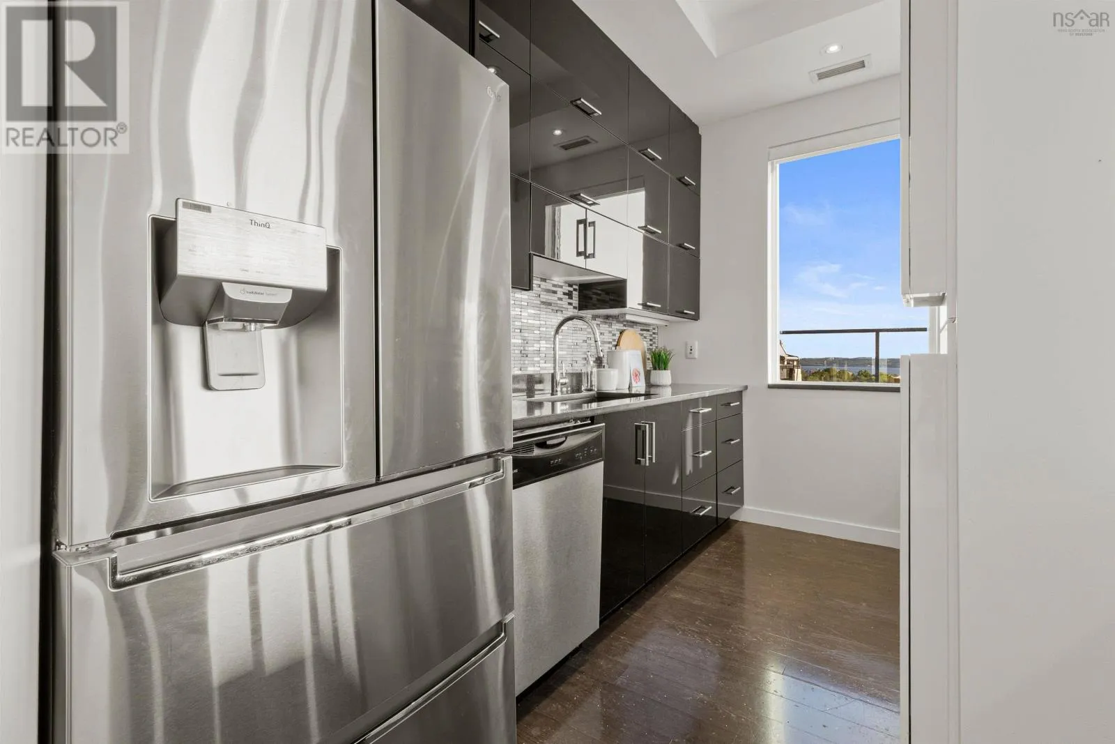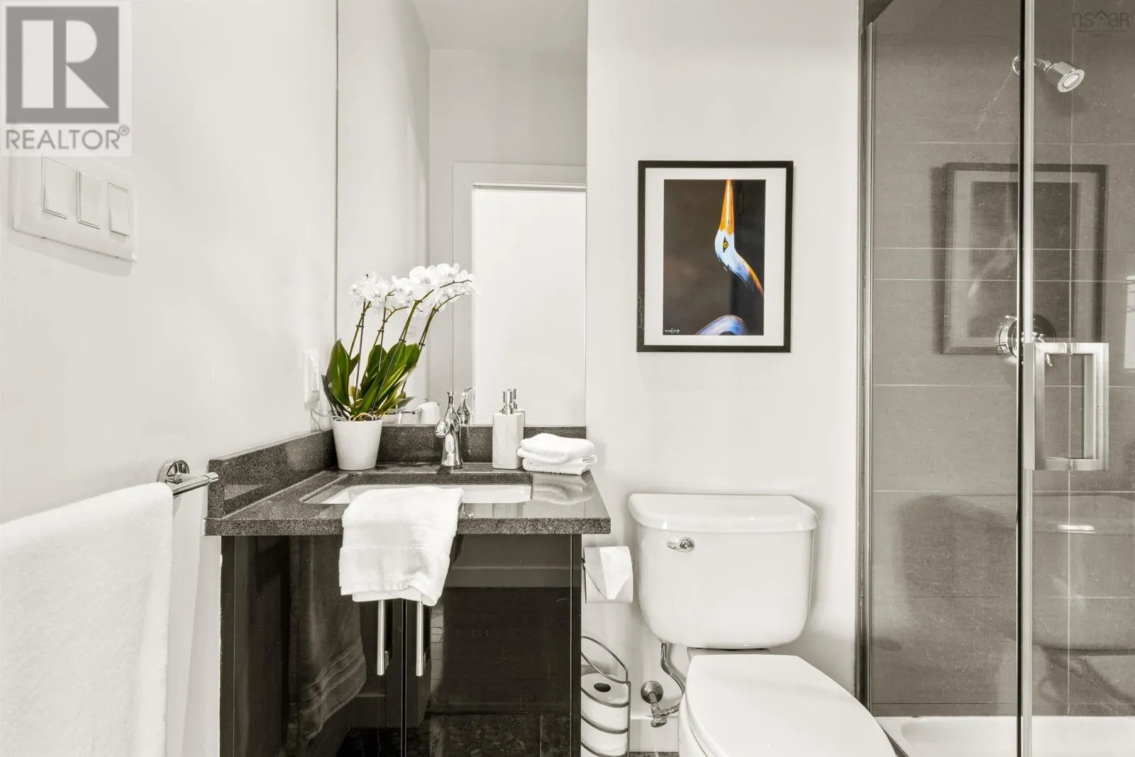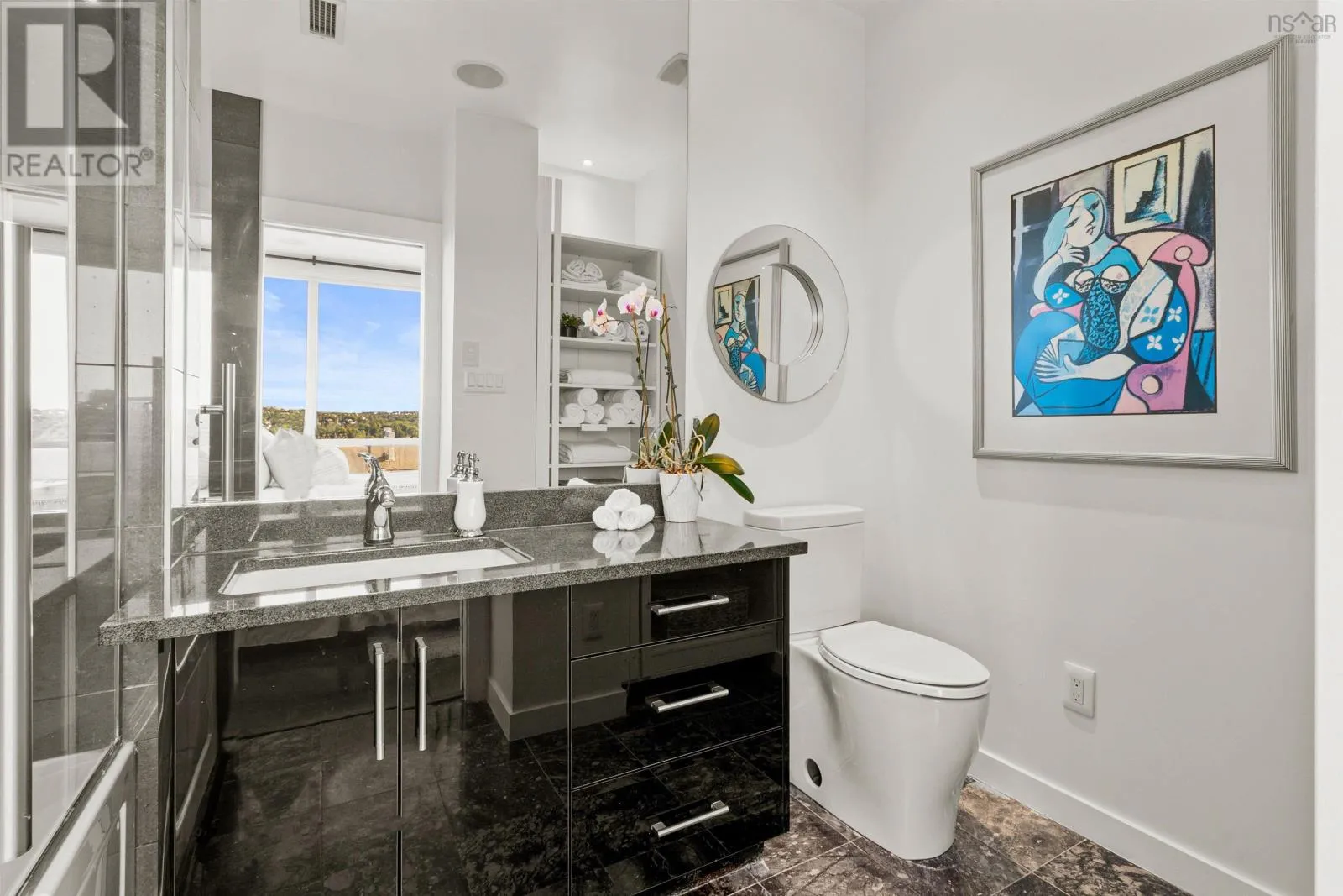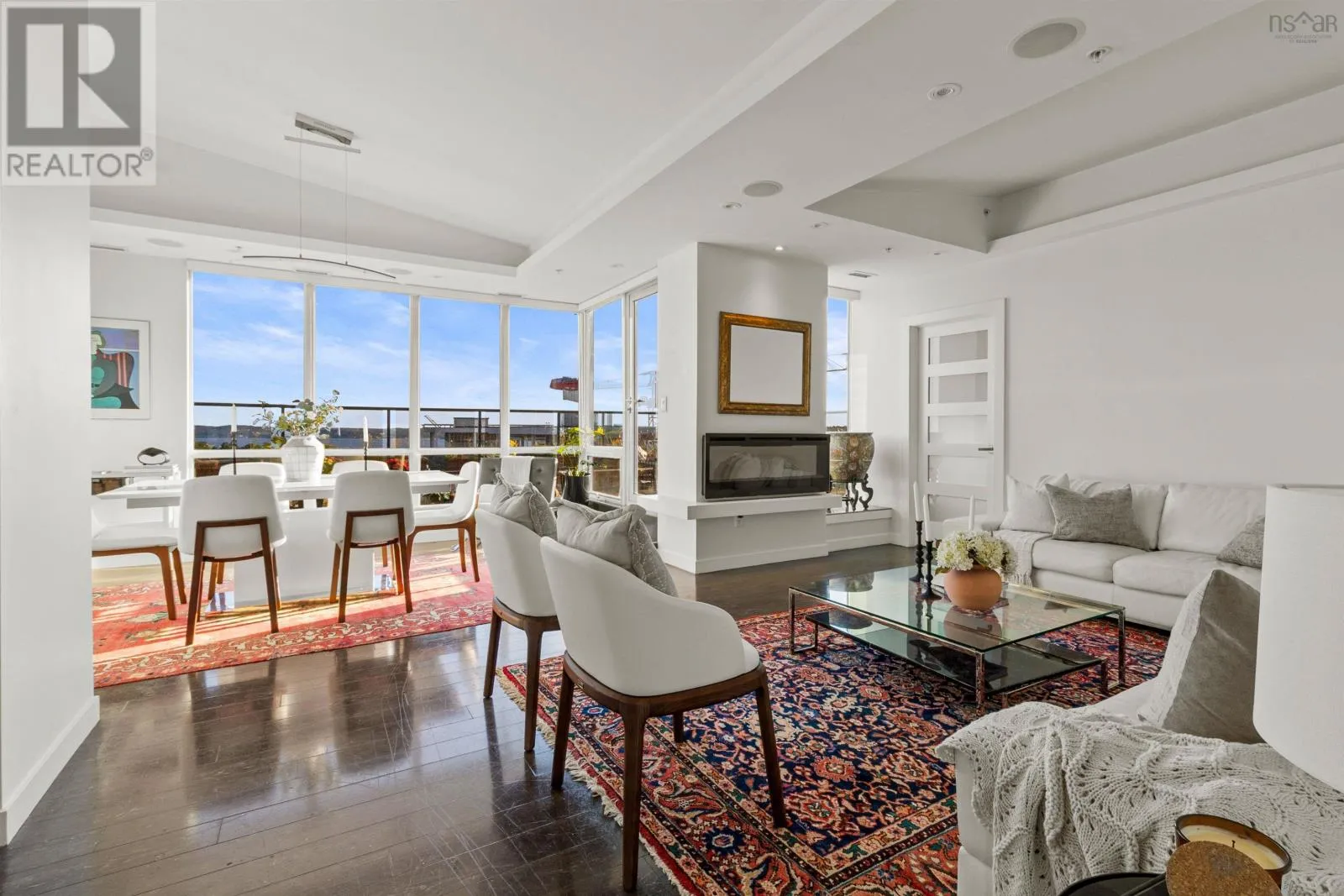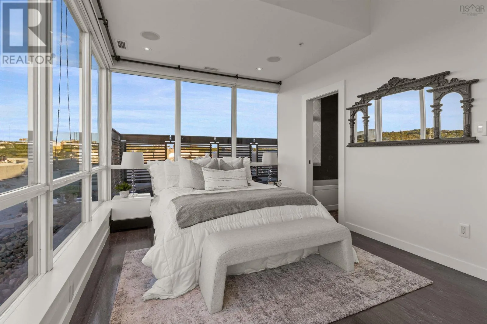 Joseph Howe to Dutch Village. Welcome to elevated city living in a rare rooftop penthouse residence offering approximately 750 sq. ft. of private outdoor terrace space and the ease of refined condo living. Perched atop the iconic St. Lawrence Place, this top floor home offers exceptional privacy with no shared walls and sweeping 360 degree views of the Bedford Basin, Northwest Arm, and city skyline. The residence spans just under approx. 1,400 sq. ft. of thoughtfully designed interior space plus a wraparound terrace and was designed by the current owner, a renowned Halifax architect responsible for over 140 buildings, ensuring every detail reflects intention and quality. Sun filled living and dining areas feature custom millwork, curated finishes, in unit laundry, and beautiful ensuite. The primary bedroom showcases floor to ceiling glass that fills the space with natural light and city views. The kitchen is streamlined and stylish with stainless appliances, glass tile backsplash, and stone countertops. The expansive private terrace is ideal for outdoor dining, relaxing, or entertaining. Building amenities include a fitness room, social room, underground parking, and large storage locker. Conveniently located just off the Peninsula with quick access downtown and close to major routes, Shoppers Drug Mart, the Superstore, banks, and the Chain of Lakes Trail, this is a truly special offering for buyers seeking privacy, design, and lifestyle. (id:27476)