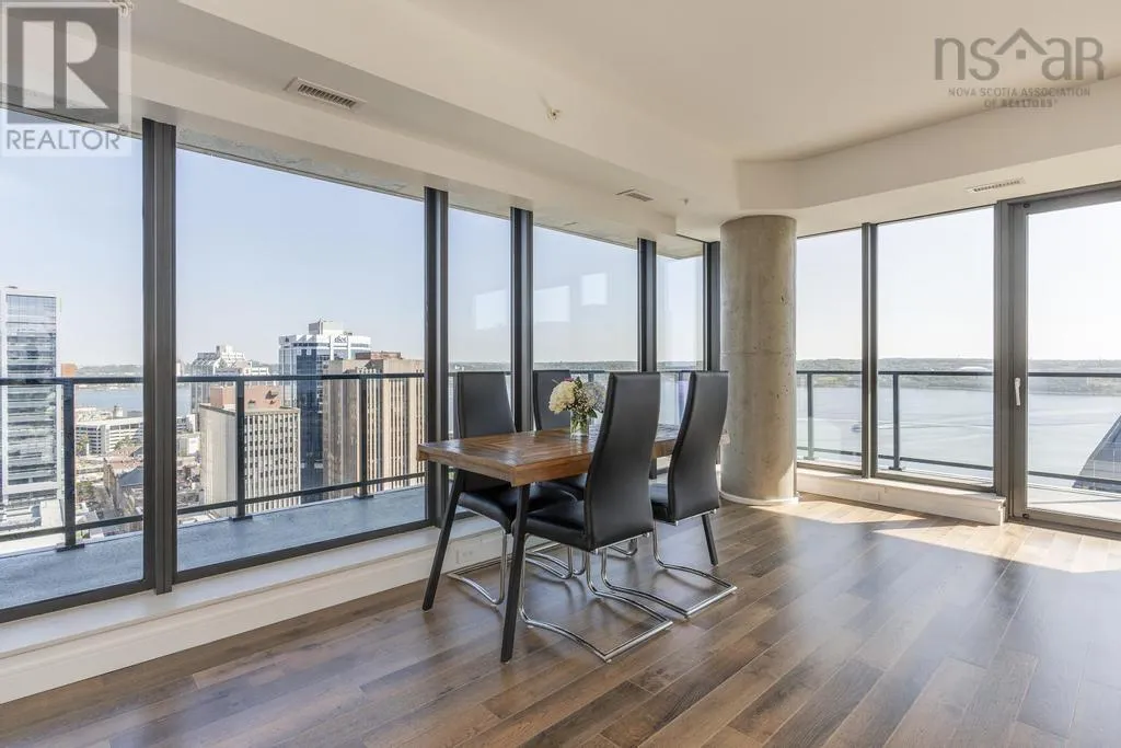 Sackville Street to Granville Welcome to the pinnacle of downtown Halifax living. Perched high above the city on the 19th floor of The Roy, this stunning 2-bedroom plus den, 2.5-bath residence offers unmatched views of the Halifax Harbour from every room. Both bedrooms have their own ensuite bathrooms! At over 1300 square feet, and with over 400 feet of wrap around decking, you will love the spaciousness and feel of this gorgeous unit. Designed for those who appreciate refined urban living, this elegant suite boasts floor-to-ceiling windows, sophisticated finishes, and a thoughtful layout that balances luxury with livability.The open-concept living and dining area is perfect for entertaining, with panoramic water views that create a breathtaking backdrop day or night. The sleek, modern kitchen features high-end appliances, quartz countertops, and ample storage space. The spacious den offers flexibility as a home office, media room, or guest space.Retreat to the primary suite where you'll find a spa-inspired ensuite, generous closet space, and more of those incredible harbour views. A second bedroom with its own ensuite, plus a stylish powder room, complete the space. The Roy offers a five-star lifestyle with a full-time concierge, a residents-only Roy Club floor featuring an indoor pool, fitness centre, sauna, theatre room, party lounge, guest suite, and more. Situated in the heart of downtown Halifax, you're steps from fine dining, shopping, galleries, and the vibrant waterfront. A deeded indoor parking space is included, conveniently situated right across from the car elevator! Dont miss this rare opportunity to own one of Halifaxs most exclusive addresses. (id:27476)