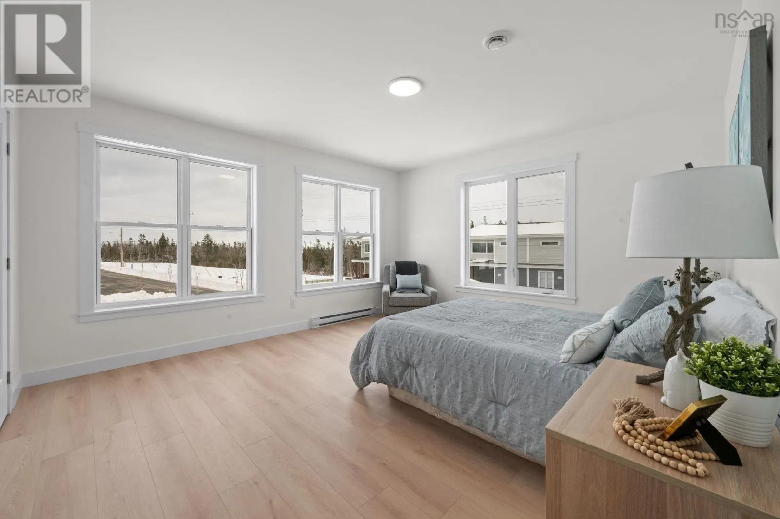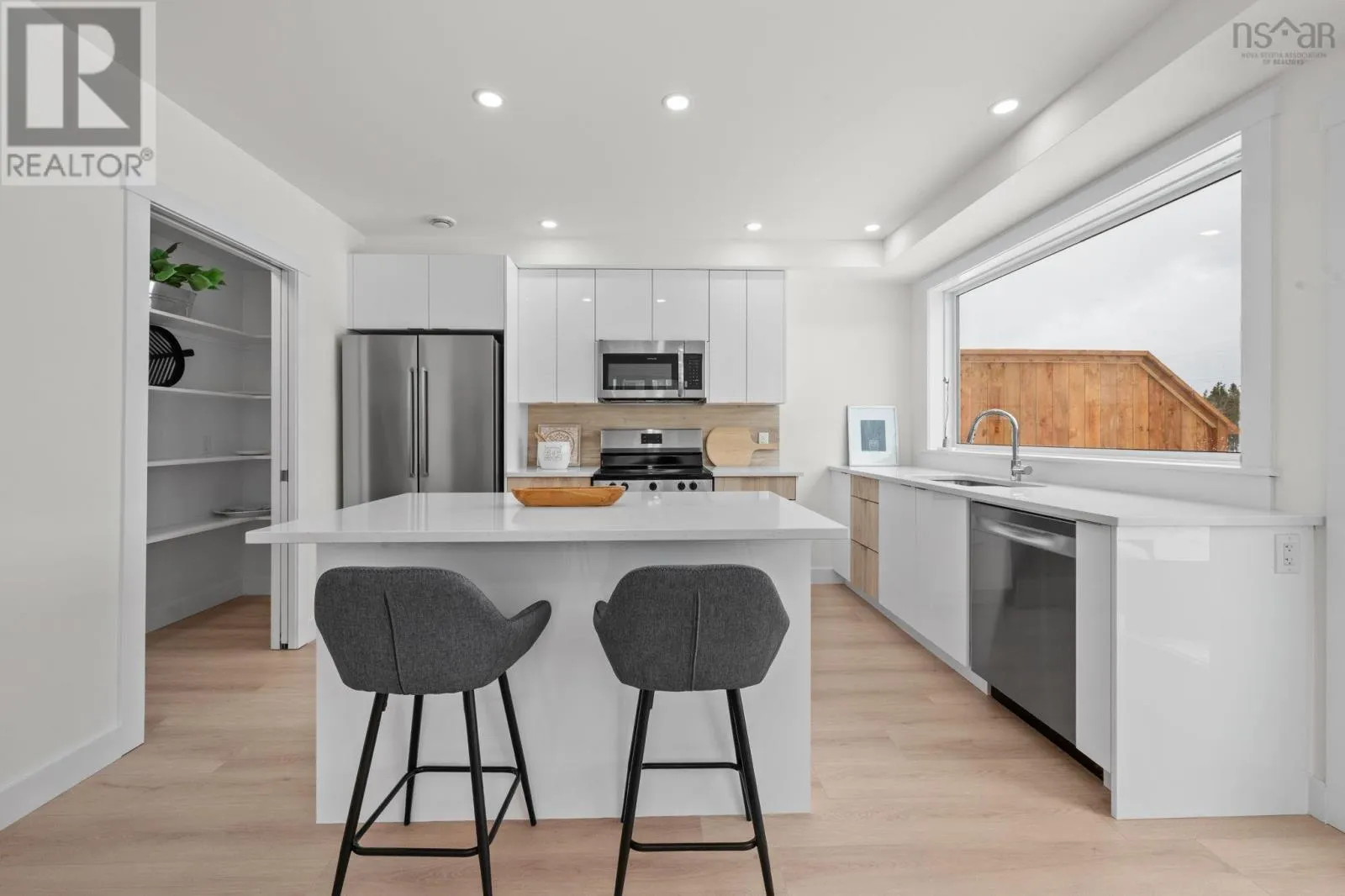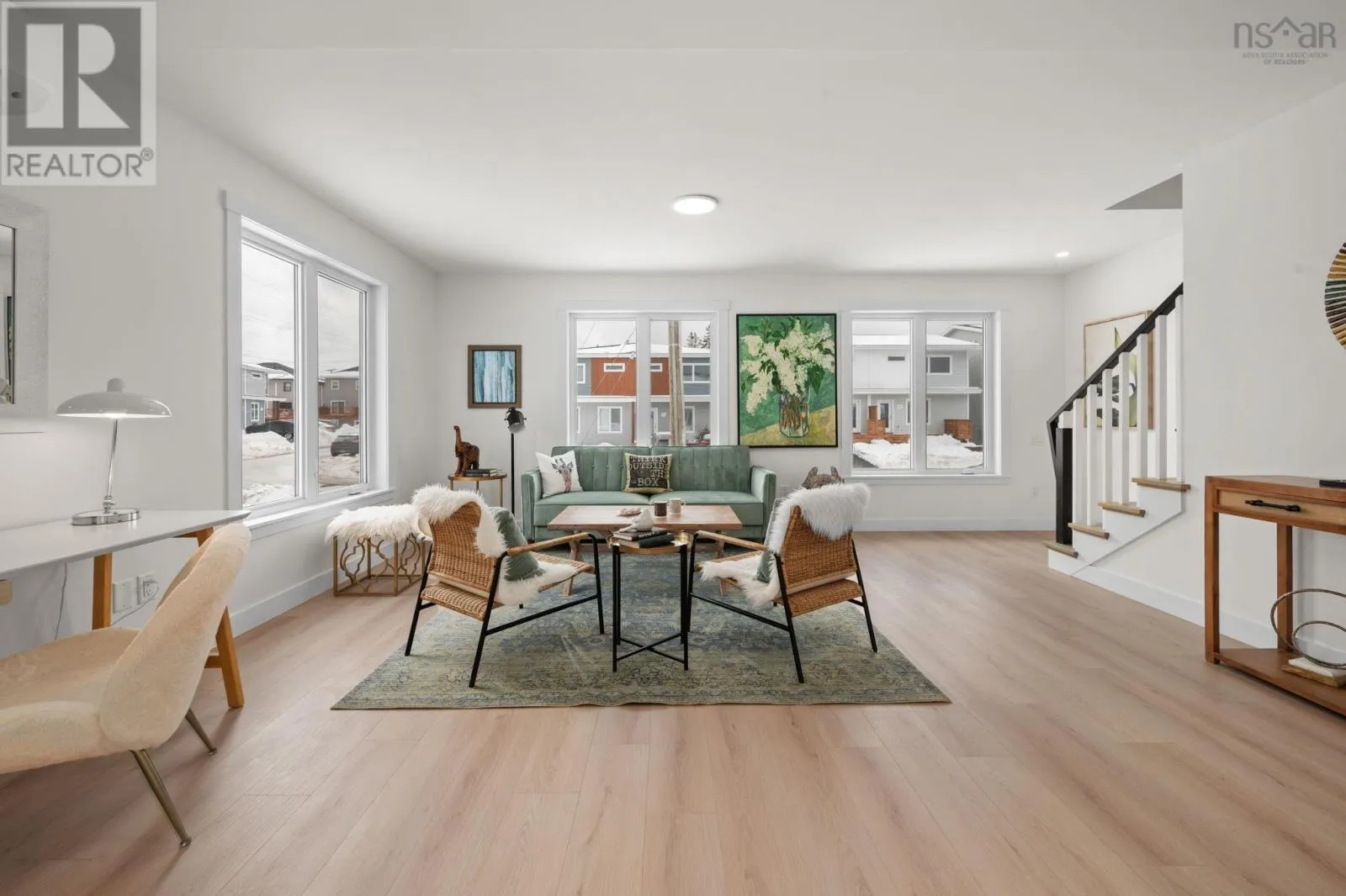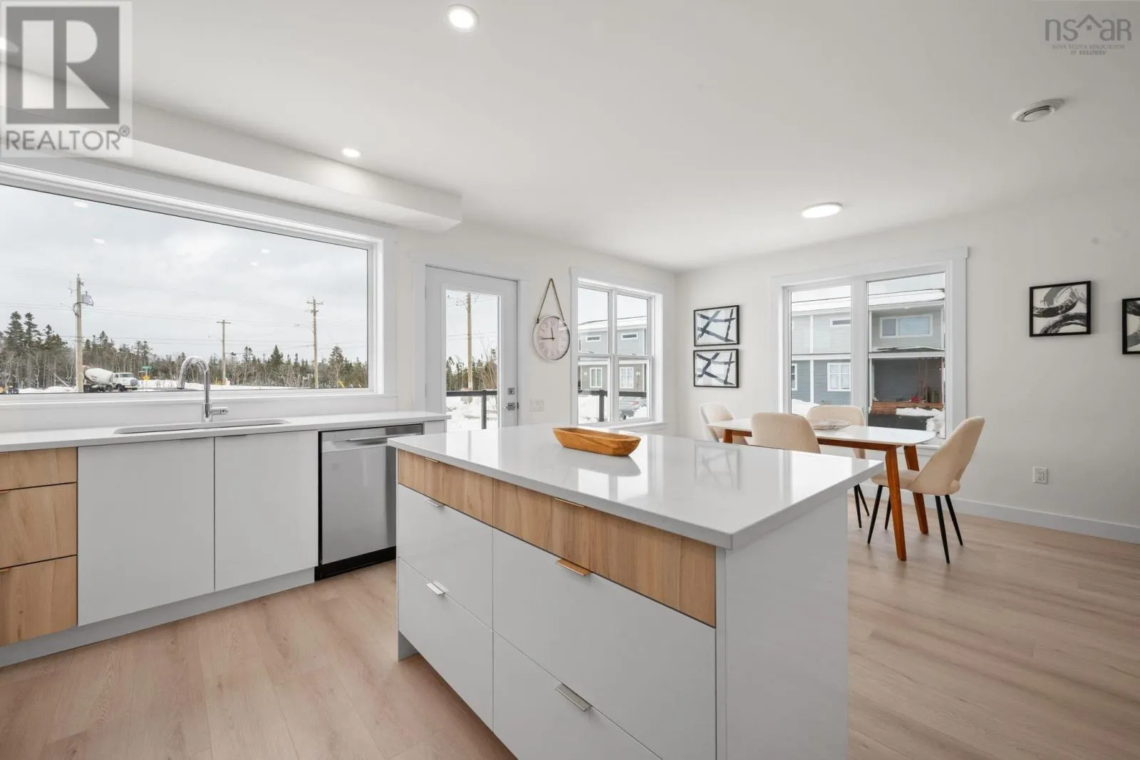 Herring Cove Road to Norris Drive, left on Berm Corner lot with private side entrance and double paved driveway! This very large, super bright, brand new semi-detached home is 2520 sqft. The unique corner lot gives the appearance of being a large detached home from the street. Enter the inviting front porch to a lovely foyer with designer tile flooring. Large kitchen and dining area feature exceptionally large windows for a welcoming space for the family to gather in. White gloss cabinets with wood accent details & quartz countertops, a massive fixed kitchen window bringing in so much light, a walk in pantry and fabulous island to gather around make this a chef's & entertainer's dream. The living room is a grand and a discrete powder room is ideal for guests. Comfort of a ductless heat pump on this level. Up the solid hardwood stairs you'll find a large master retreat with walk in closet and ensuite featuring a double vanity and shower. Two additional nice sized bedrooms up, upper floor laundry, and a 4 pc main bath complete this level. All hardsurface countertops in bathrooms. The basement is finished with a rec room that walks out to the yard, wet bar, good sized separate den/bedroom, and full bath. Carpet free with quality ceramic and laminate floors throughout. Located in the fabulous new Birchdale subdivision on the edge of Halifax/Herring Cove near the supervised beach at Long Pond and within 20 minutes to downtown Halifax. Come visit the furnished model home! Tremendous value in these Provident homes. Additional lots & layouts to choose from. Photos and Virtual tour are of the same layout for reference as facsimile. (id:27476)