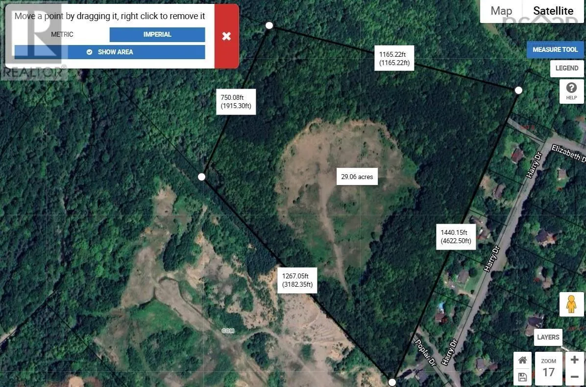 From Main Street in Kentville, south on Cannan Avenue, right on Alice Drive, right on Elizabeth Drive, left on Harry Drive, right on Poplar Drive Large Development Potential. Approximately 29 +/- acres of A-4 Zoned land in Highbury, which is an extension of a little known, little turn over, Balsor Subdivision. Rural feeling, where county line meets Town of Kentville. Close to amenities. Aerial image shows approximate boundaries, basically a straight line following County and Town boundaries. Must be purchased with PID # 55473458 (MLS # 202408151), in order to be able to develop. (id:27476)