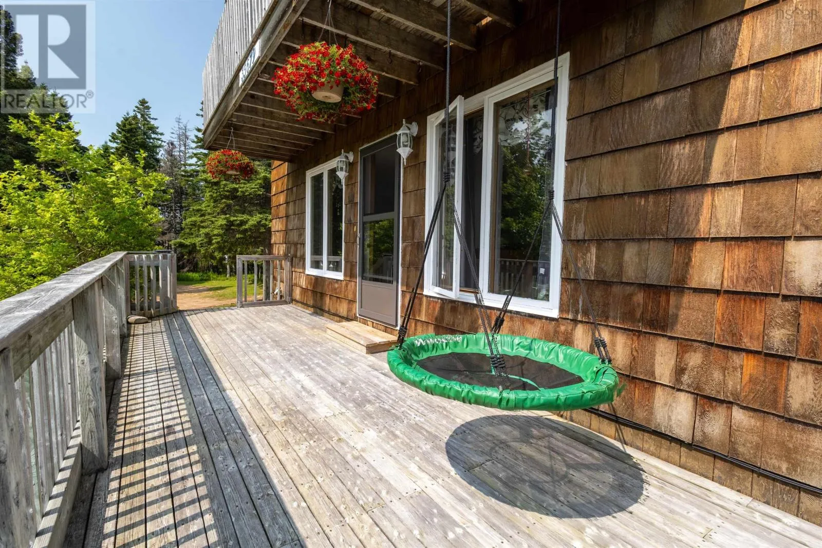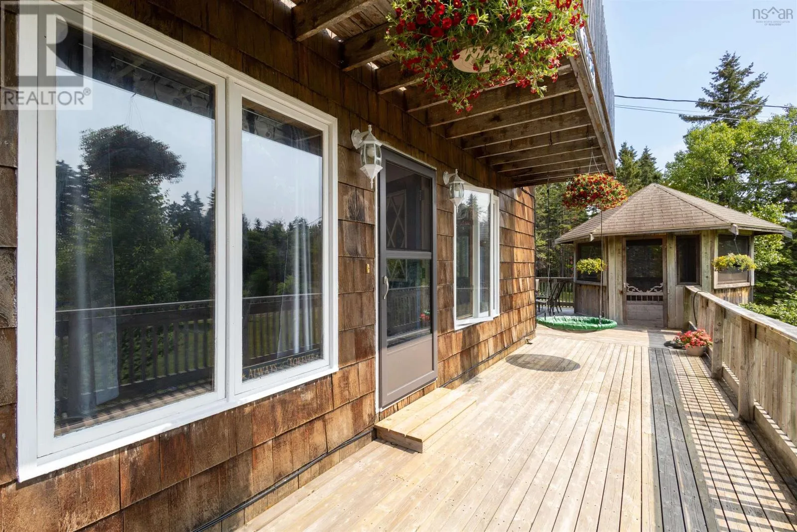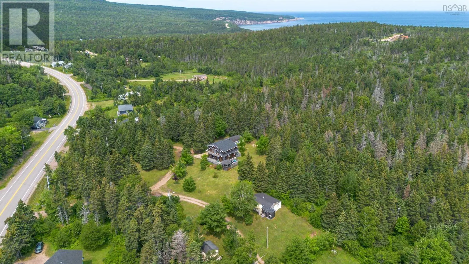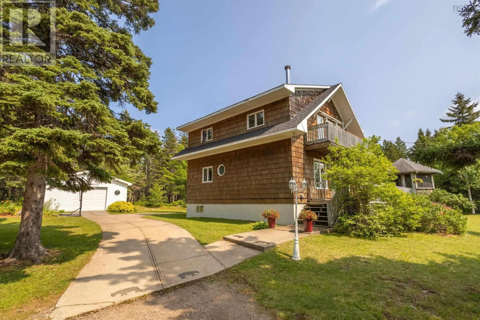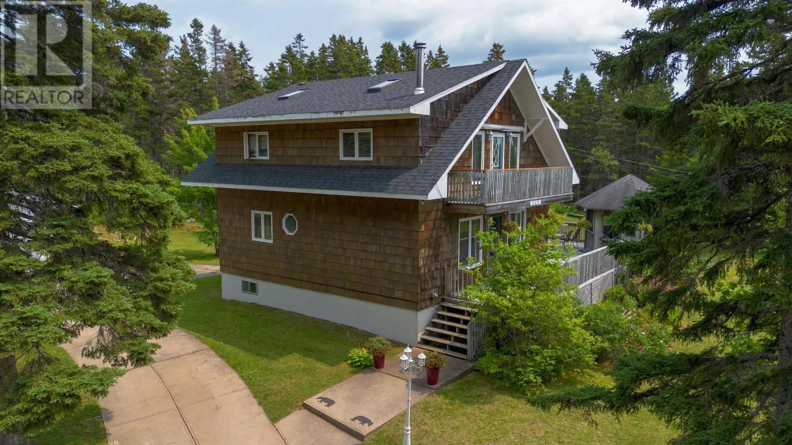 Turn in to the driveway, at signage, across from the Irving in Ingonish Located in beautiful North Ingonish, this lovingly maintained four-bedroom chalet-style home sits on 8 acres of level and treed land, offering a private retreat with ample potential. Just minutes from the beach, the entrance to the Cape Breton Highlands National Park, local restaurants, and other convenience and attractions. With potential for subdivision, cottages, or other ventures, the property offers so much more then just a beautiful home. Tucked off of the Cabot Trail, a treed-in driveway leads you to a private yard with a screened-in gazebo and spacious front deck, creating the ideal outdoor spaces. Inside, the main level welcomes you with hardwood floors and an open-concept layout connecting the living and dining areas, the latter providing access to the main deck through patio doors. A functional galley kitchen features ample cupboard space, and the back entrance is where you find the main-floor laundry. Completing the main level is a bedroom and a full 4-piece bath. Upstairs, a second living room offers a perfect gathering space for family or guests, with access to an upper balcony. The large primary bedroom is also located on this level, along with two additional bedrooms and a 3-piece bath. The basement is dry, spray foam insulated, and walkout, providing excellent storage, workshop potential, or further development options. A 200-amp electrical panel is complemented by a generator panel for added peace of mind. The detached wired garage adds further utility. With a drilled well offering an excellent water supply and a newer roof completed in fall 2024, the home is heated with electric baseboards and a cozy wood stove. This North Ingonish property offers comfort, privacy, and potential in one of Cape Bretons most desirable areas. You will want to see for yourself. Book in with your agent today for a viewing! (id:27476)