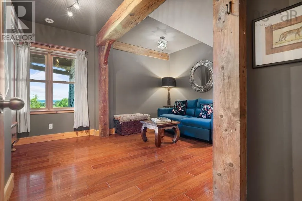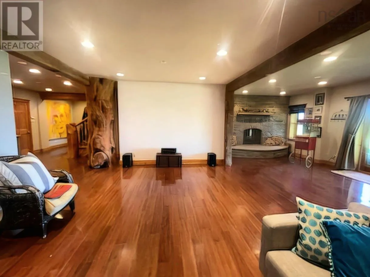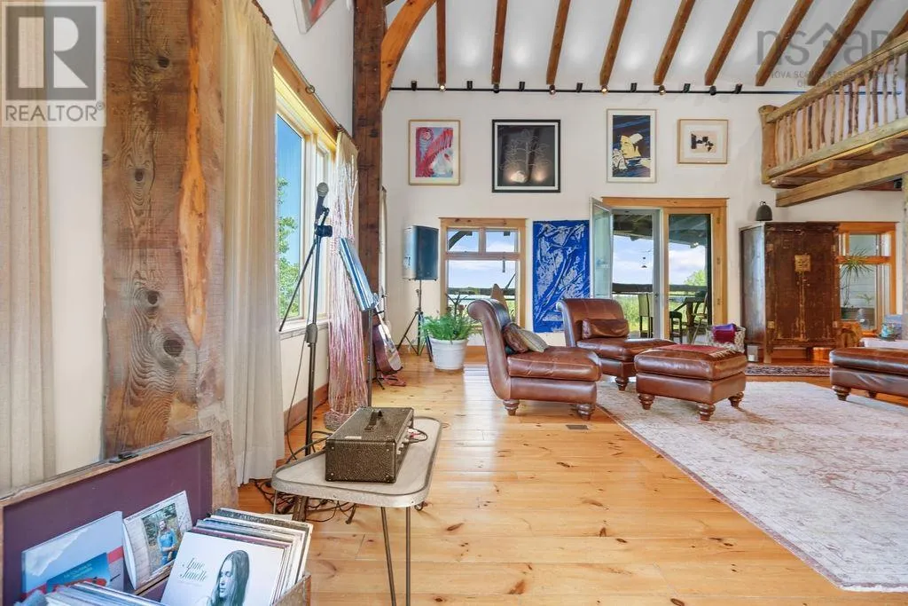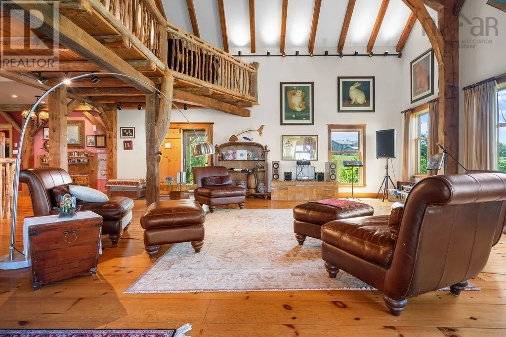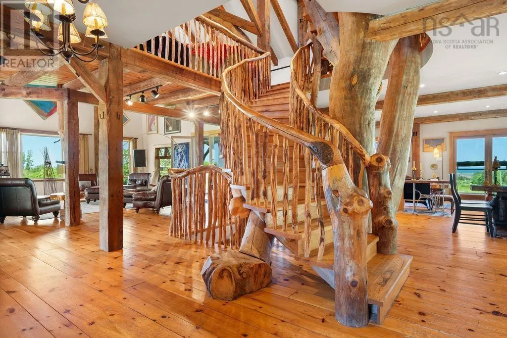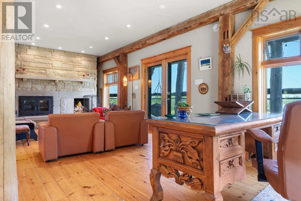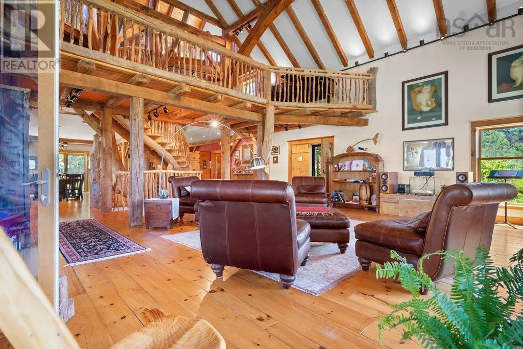 From Hwy 104, take exit 27 (Pine Tree) to Hwy 4 toward Merigomish. Right onto Woodburn Rd, Right onto Little Harbour, Left to Sea Oats and Right to Meadow Breeze. Uncover the unparalleled charm of this extraordinary 5-bedroom, 5-bath timber frame home, meticulously crafted from salvaged barn wood and adorned with beams from historic barns. Central to its design is a majestic white pine tree over a century old, adding a touch of heritage to this architectural gem spanning about 6,000 square feet. Currently serving as a family residence, this unique property also offers commercial potential. Located near Melmerby Beach and a short drive from Trenton airport, as well as within reach of the international airport and prestigious golf courses, this residence provides a serene escape with convenient access to amenities and attractions. The main level's open concept boasts cathedral ceilings, exposed beams, and exquisite wood floors. The kitchen features soapstone countertops, while a spacious dining room, office, and family room with a grand sandstone fireplace, offer stunning views of the Atlantic. The second floor includes a balcony overlooking the great room and the primary bedroom with a fireplace, walk-in closet, balcony, and lavish ensuite bathroom. The third floor offers another bedroom and sitting area. The lower level encompasses three bedrooms, two baths, a sauna, a games/exercise room, a theater, and multiple fireplaces. Each level's outdoor deck provides ample space for leisure and gatherings. The master bath showcases slate-tiled shower walls for added luxury. With its distinctive attributes, flexible layout, and prime location, this property offers a rare opportunity for those seeking a unique living or business environment. An outdoor fireplace on the main level enhances the property's appeal, creating a cozy setting for outdoor activities and relaxation. With 2.3 acres and access to a lovely beach to moor your boat and swim, enjoy East Coast living. More acreage is available and negotiable. Watch the fishers from your balcony and call them to have lobster delivered to your door. Explore the matterport here. (id:27476)