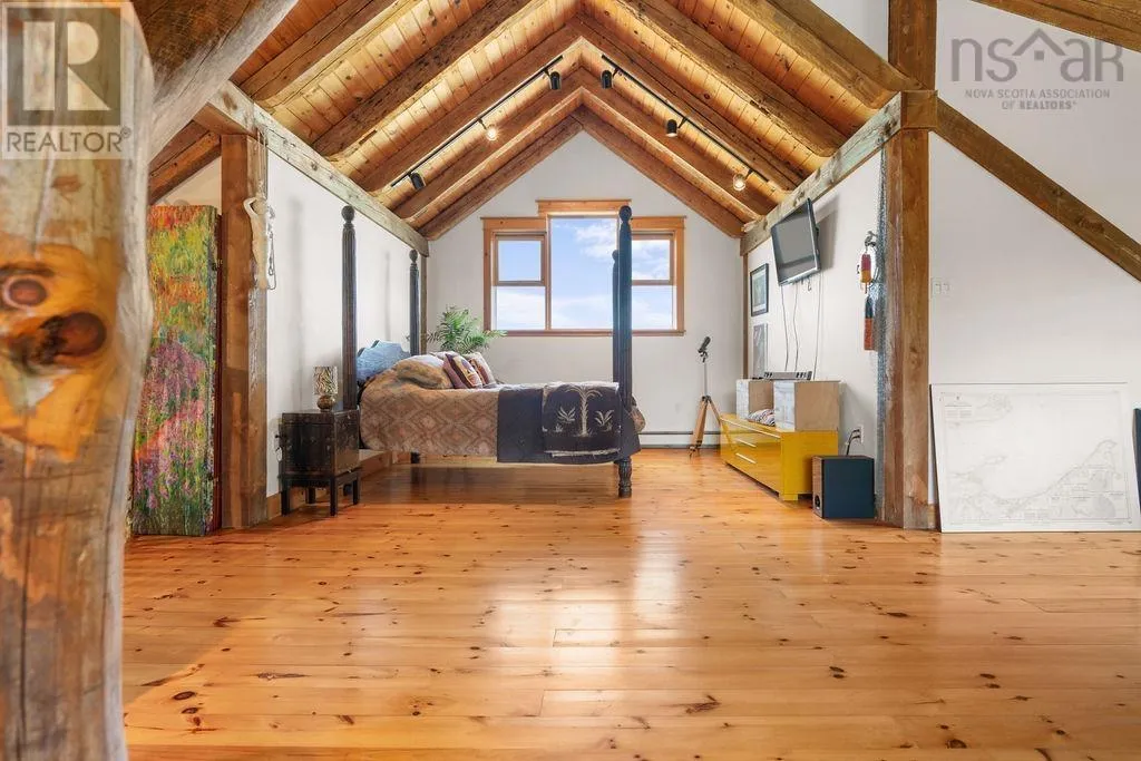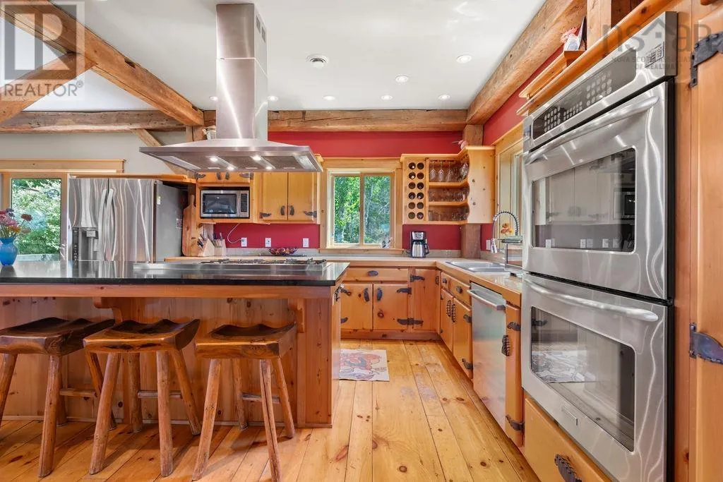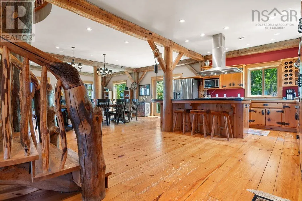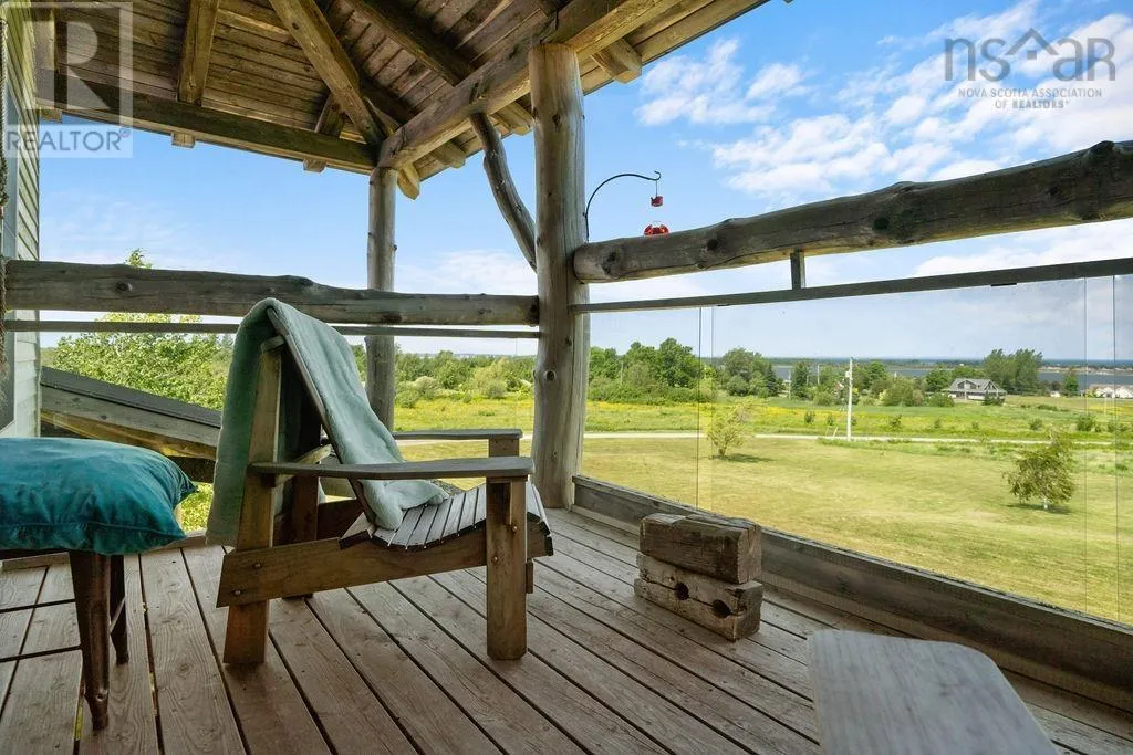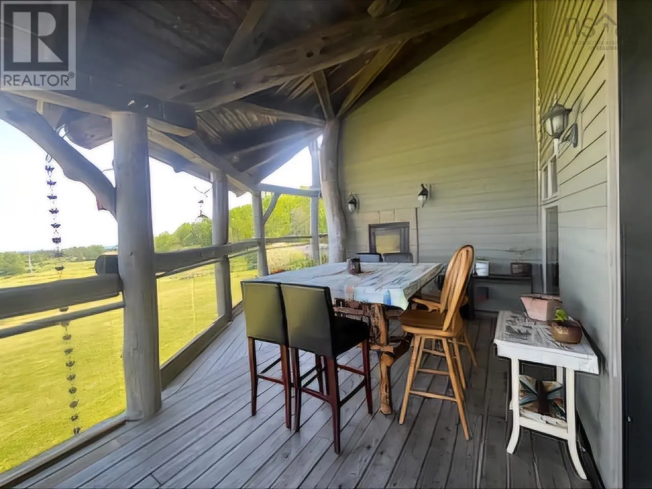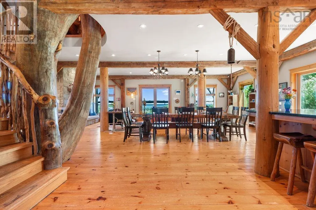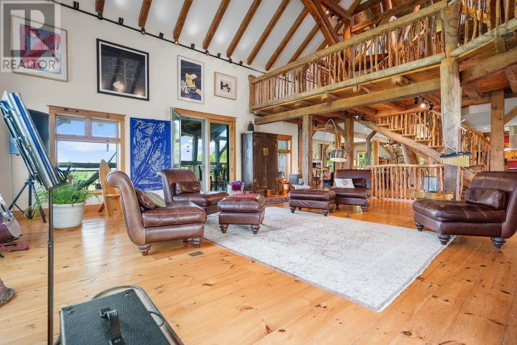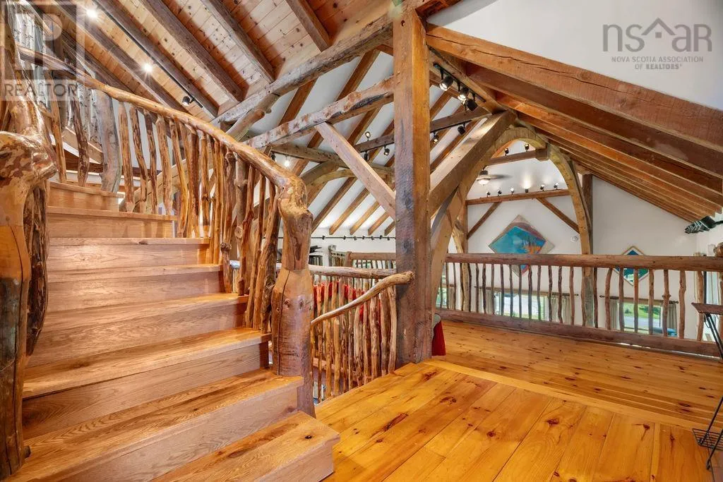 From Hwy 104, take exit 27 (Pine Tree) to Hwy 4 toward Merigomish. Right onto Woodburn Rd, Right onto Little Harbour, Left to Sea Oats and Right to Meadow Breeze. Uncover the unparalleled charm of this extraordinary 5-bedroom, 5-bath timber frame home, meticulously crafted from salvaged barn wood and adorned with beams from historic barns. Central to its design is a majestic white pine tree over a century old, adding a touch of heritage to this architectural gem spanning about 6,000 square feet. Currently serving as a family residence, this unique property also offers commercial potential. Located near Melmerby Beach and a short drive from Trenton airport, as well as within reach of the international airport and prestigious golf courses, this residence provides a serene escape with convenient access to amenities and attractions. The main level's open concept boasts cathedral ceilings, exposed beams, and exquisite wood floors. The kitchen features soapstone countertops, while a spacious dining room, office, and family room with a grand sandstone fireplace, offer stunning views of the Atlantic. The second floor includes a balcony overlooking the great room and the primary bedroom with a fireplace, walk-in closet, balcony, and lavish ensuite bathroom. The third floor offers another bedroom and sitting area. The lower level encompasses three bedrooms, two baths, a sauna, a games/exercise room, a theater, and multiple fireplaces. Each level's outdoor deck provides ample space for leisure and gatherings. The master bath showcases slate-tiled shower walls for added luxury. With its distinctive attributes, flexible layout, and prime location, this property offers a rare opportunity for those seeking a unique living or business environment. An outdoor fireplace on the main level enhances the property's appeal, creating a cozy setting for outdoor activities and relaxation. With 2.3 acres and access to a lovely beach to moor your boat and swim, enjoy East Coast living. More acreage is available and negotiable. Watch the fishers from your balcony and call them to have lobster delivered to your door. Explore the matterport here. (id:27476)