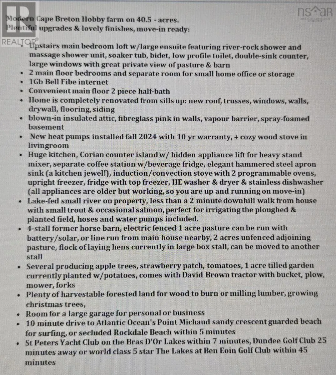 Turn off Highway 247 onto Salmon River Road, on the right hand side, look for Ryan Ehker/CRT Marquis sign. Modern Hobby farm, reno'd from sills up. Lovely finishes, see photo for fuller description! Upstairs Loft w/large ensuite; 2 main flr BRs, home office; 1Gb Bell Fibe; Main flr 2 piece bath; Fully insulated; New heat pumps fall 2024 + wood stove in LR; Huge kitchen, island w/appliance lift; coffee station, hammered steel apron sink, all applicances incl, older but wkg well; Lake-fed creek w/ small trout & salmon; 4-stall horse barn, 1 acre pasture fenced/ 2 acres unfenced; Laying hens; Apple trees; Strawberries, other veg; 1 acre tilled garden; David Brown tractor w/ accessories; MORE! (id:27476)