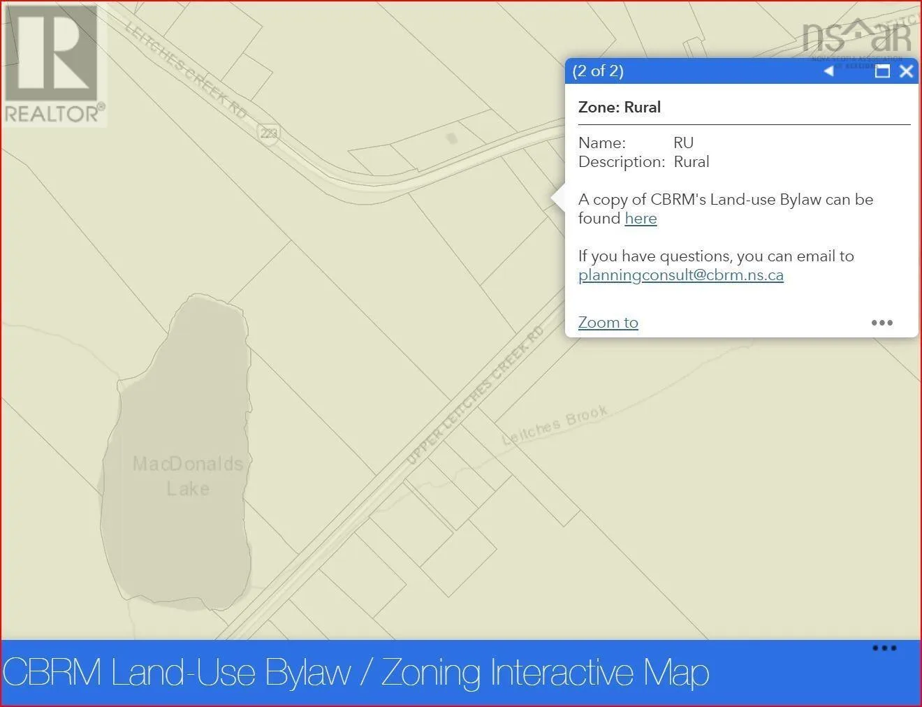 Leitches Creek RD, across the road (lot with driveway) 1078 Leitches Creek Rd Leitches Creek. Google L/L 46.143255°, 60.373774° (copy/paste into browser) Located on Leitches Creek Road (Highway 223), this 1.65-acre lot offers a peaceful and private setting in the quiet community of Leitches Creek, part of the Cape Breton Regional Municipality. The property features approximately 300 feet of road frontage with a driveway already installed (currently overgrown) but visible and ready for use. Power and Fibre Internet are available at the roadside, making this lot ideal for building your dream home. Zoning is Rural, allowing for residential development. Municipal water and sewer services are not available in this area, and a well and septic system are common solutions for rural living. Despite its tranquil setting, the property is conveniently located just 10 minutes to North Sydney and about 15 minutes to Sydney River, providing easy access to grocery stores, pharmacies, and a variety of local shops and services. Listed at $78,000, this property offers an excellent opportunity to enjoy both privacy and proximity to amenities. Please see the listing photos for approximate lot boundaries and shape. Full listing details on REALTOR.ca: MLS® 202506987 Location coordinates (copy/paste into browser): 46.143255°, -60.373774° (id:27476)