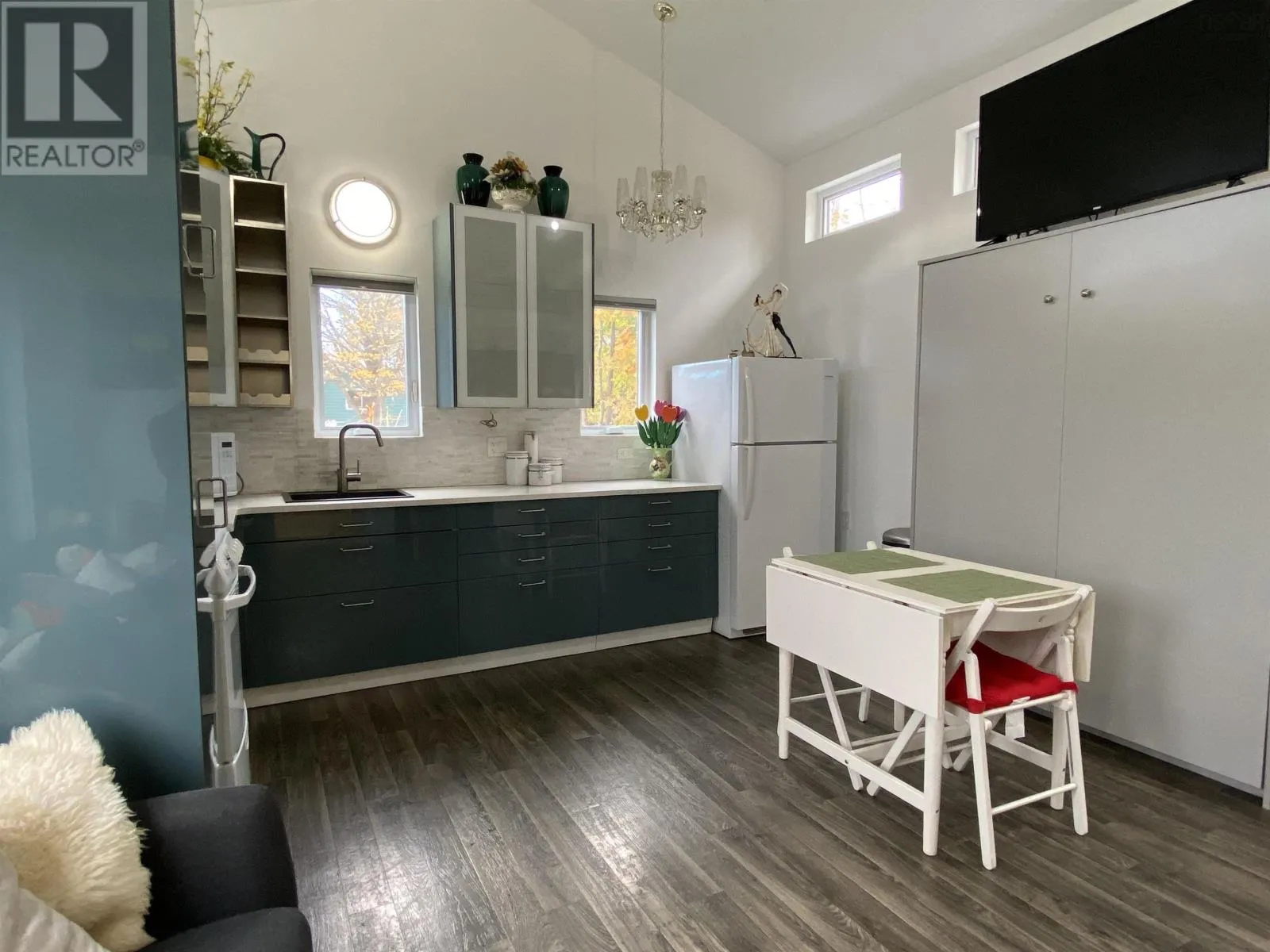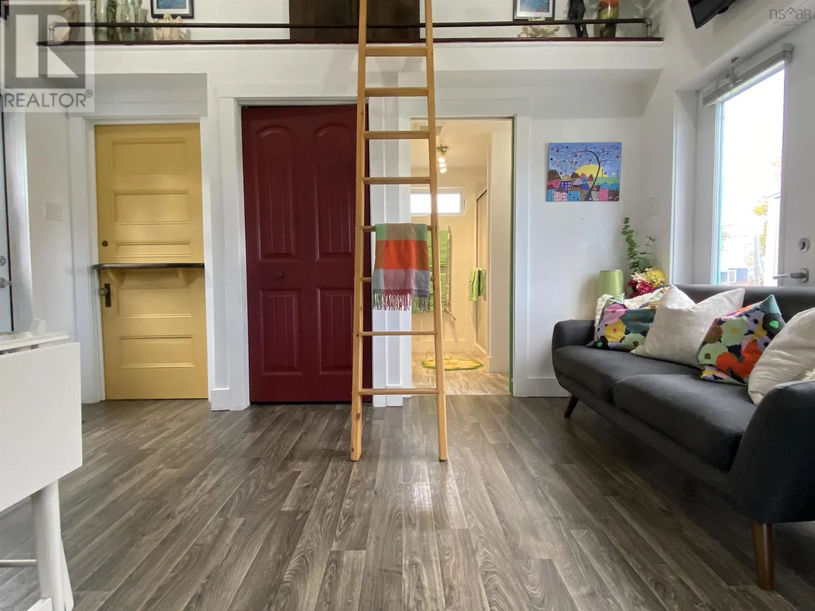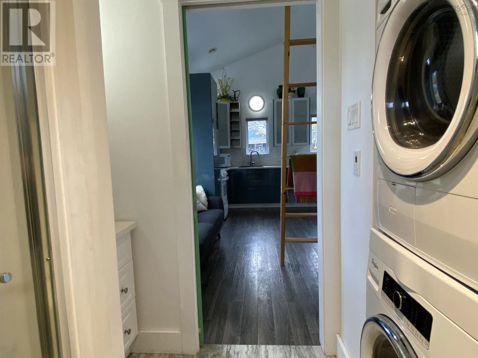 Main Street to Wolfe. Corner of Wolfe and Hillside Drive. Civic # 52. Sign posted. This 2018-build 24 x 14 tiny house on a corner lot in Liverpool shows like new and is move-in ready. Vaulted ceiling, garden door and lots of windows make for an open and airy space. IKEA kitchen with quartz counter top; 3-piece bath features walk-in shower with seat and stackable washer & dryer; main-level storage room plus extra loft storage, plus a separate utility room w/ electric water heater. Municipal water & sewer; foam insulation, built on a concrete slab with in-floor heat and a heat pump that also provides cooling. Fridge, stove and folding Murphy Wall Bed included. Recently added 12 x 8 storage shed. Lots of options for a new owner, including a great vacation getaway or instant short or long-term rental. (id:27476)