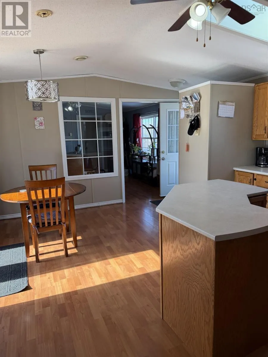 TCH to Lower South River Exit, left at the stop sign, left into Glen Aire Estate, right and then left onto Liberty Lane at the top take a left watch for sign on the left Well-maintained 16 x 68 Maple Leaf mini home built in 2004, situated on a nicely positioned leased lot that offers generous space both in the front and back of the property. The home features a large front deck and a 36-inch front door leading into an open-concept kitchen and dining area. Patio doors off the dining space lead to the back deck and a large green space that is owned and maintained by the park, providing a beautiful and private outdoor setting. The primary bedroom is conveniently located off the kitchen area and is bright and spacious, complete with a walk-in closet and private ensuite featuring a stand-up shower, toilet, sink, and bidet. Just off the kitchen you will find a bright and comfortable living room equipped with a heat pump, providing efficient heating and cooling. A short hallway leads to the laundry area, second bedroom, and a full main bathroom. The property is beautifully landscaped and located in the newer section of the park, within close proximity to the childrens play area. When built, this home was a custom design model, offering thoughtful layout and functionality. This home is ideal for first-time homebuyers or those looking to downsize. The park is conveniently located approximately 10 minutes from town with easy access to the highway. Be it before the Summertime! (id:27476)