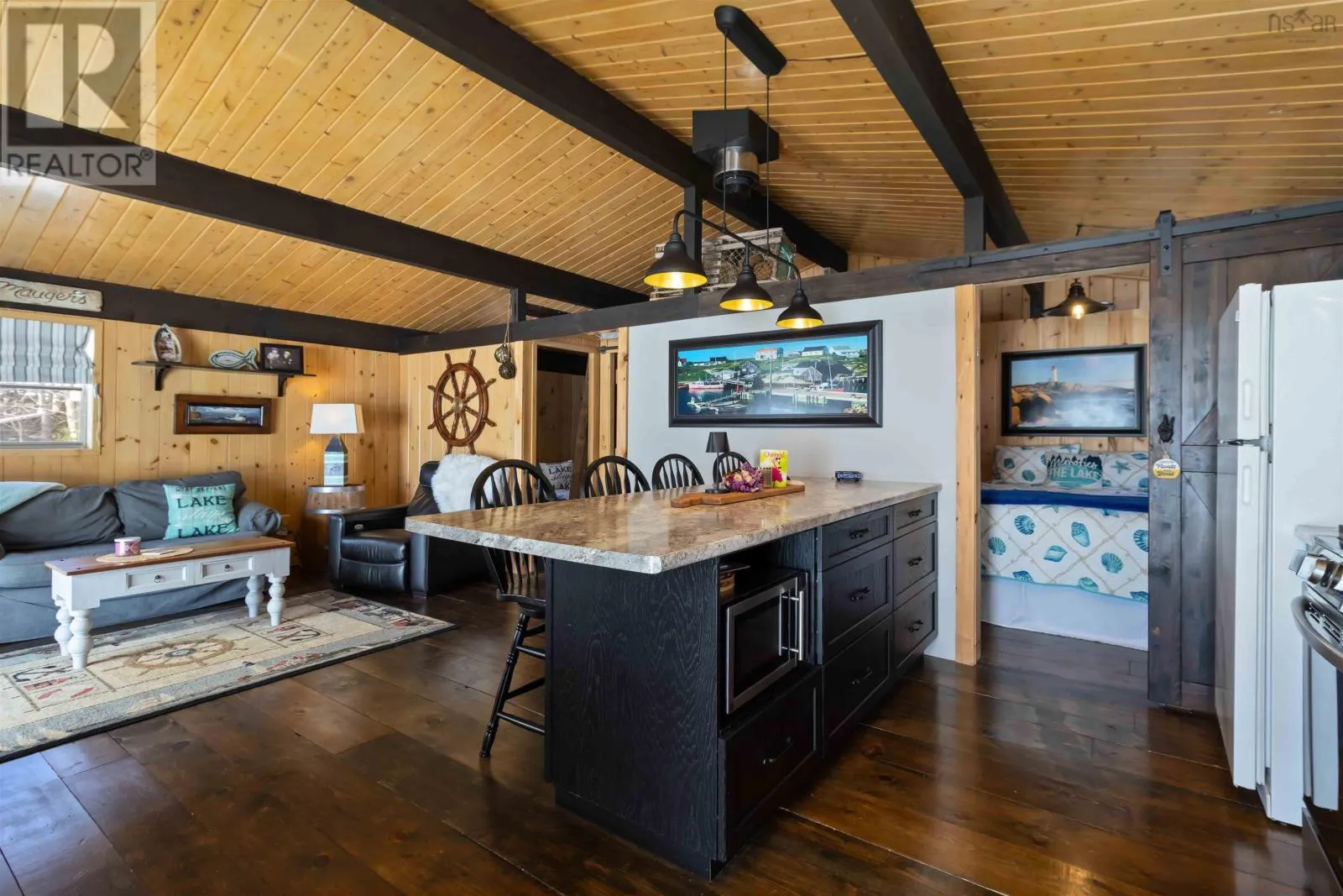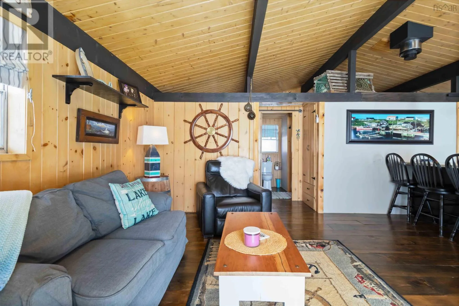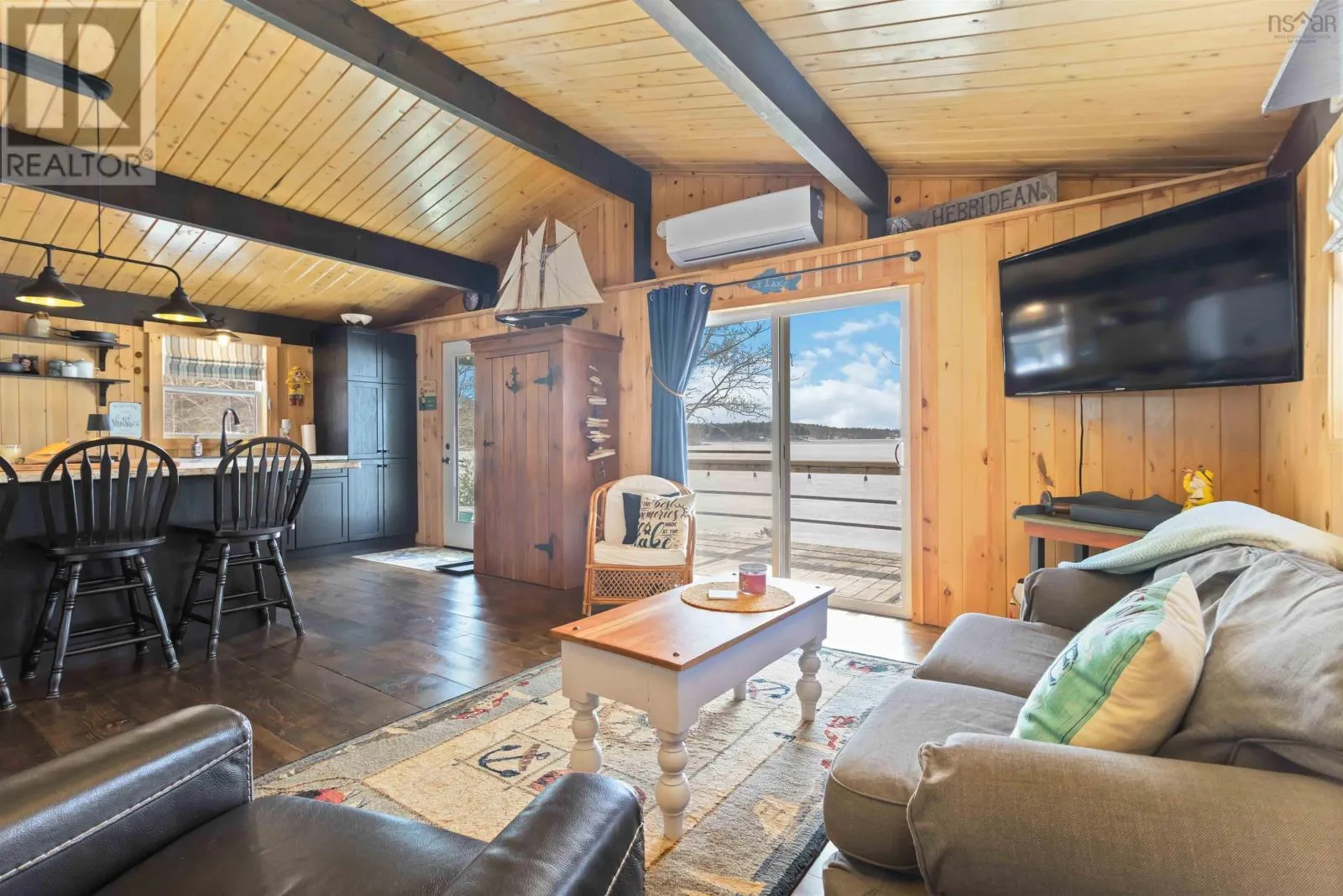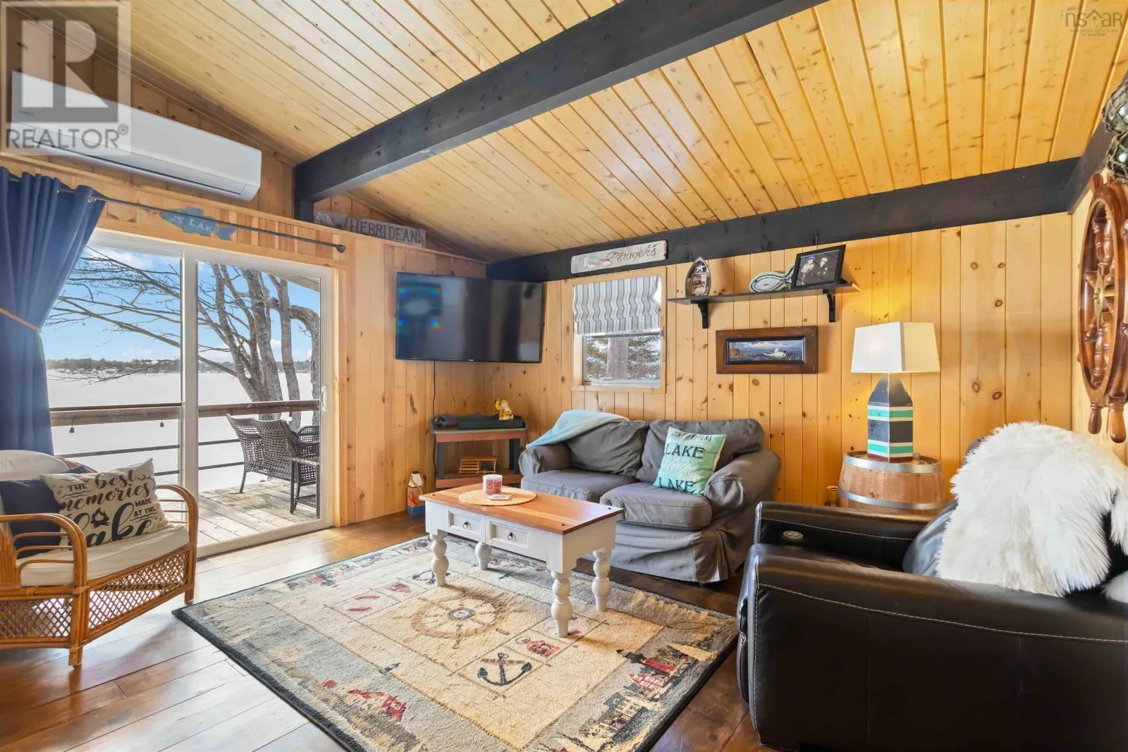 Exit 11 from Hwy 103 to Cornwall Road, to Canoe Island Rd to Dauphinee. This charming two bedroom cottage rests along the shores of one of Nova Scotias most sought after South Shore lakes; Big Mushamush, offering an exceptional blend of privacy, natural beauty, and future potential. Set on a beautifully landscaped 17,424 square foot property with over 118 feet of pristine waterfront, the property features a beach and crystal clear waters. perfect for swimming, boating, and soaking in unforgettable sunset views. Inside, 121 Dauphinee Rd. welcomes you with a bright, open-concept living space. Expansive windows frame stunning lake vistas, while the dining area flows seamlessly into a thoughtfully designed kitchen with ample cabinetry. Two inviting bedrooms, one with built-in bed providing comfort and efficiency, and the warm pine finishes paired with elevated ceilings create an airy yet rustic atmosphere. Step outside to a generous deck, perfect for entertaining, enjoying quiet mornings, or simply taking in the peaceful surroundings. A dock provides easy access to the lake, making it ideal for swimming, playing on lake toys, or fishing. This is lakeside living at its finest; peaceful, private, and full of possibility. (id:27476)