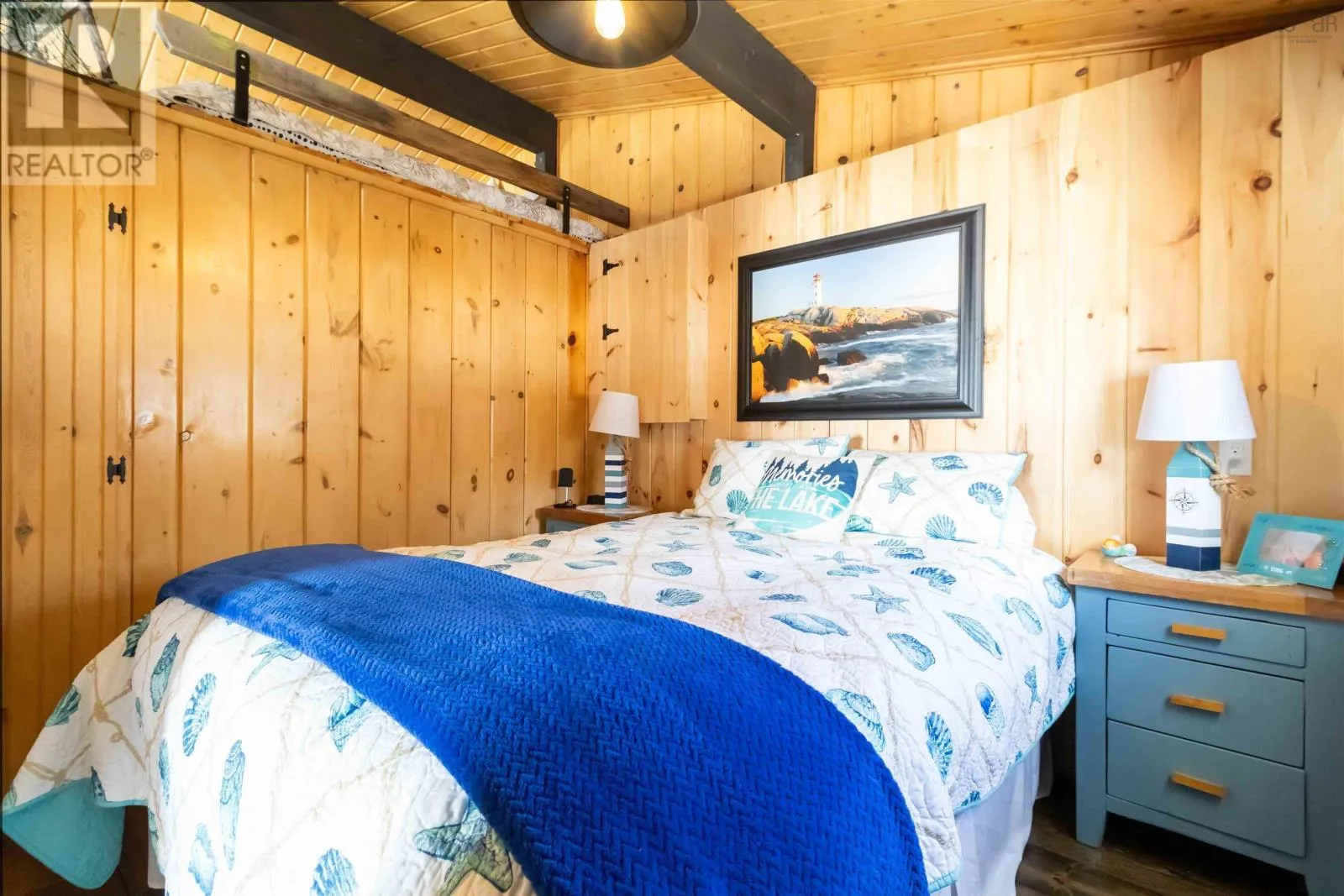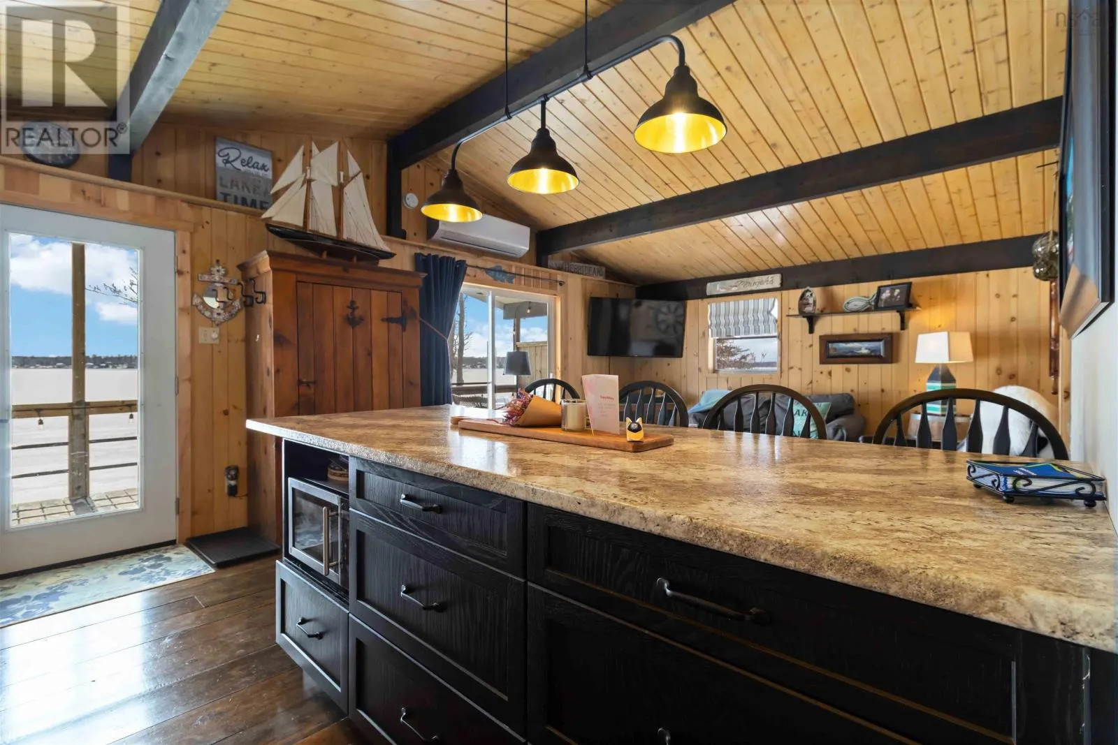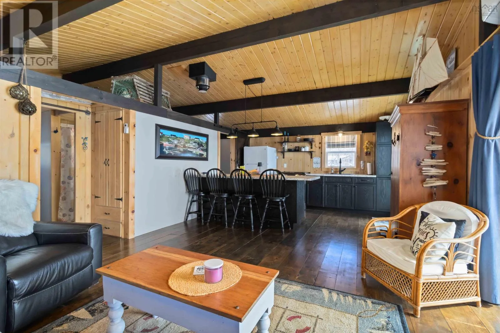 Exit 11 from Hwy 103 to Cornwall Road, to Canoe Island Rd to Dauphinee. This charming two bedroom cottage rests along the shores of one of Nova Scotias most sought after South Shore lakes; Big Mushamush, offering an exceptional blend of privacy, natural beauty, and future potential. Set on a beautifully landscaped 17,424 square foot property with over 118 feet of pristine waterfront, the property features a beach and crystal clear waters. perfect for swimming, boating, and soaking in unforgettable sunset views. Inside, 121 Dauphinee Rd. welcomes you with a bright, open-concept living space. Expansive windows frame stunning lake vistas, while the dining area flows seamlessly into a thoughtfully designed kitchen with ample cabinetry. Two inviting bedrooms, one with built-in bed providing comfort and efficiency, and the warm pine finishes paired with elevated ceilings create an airy yet rustic atmosphere. Step outside to a generous deck, perfect for entertaining, enjoying quiet mornings, or simply taking in the peaceful surroundings. A dock provides easy access to the lake, making it ideal for swimming, playing on lake toys, or fishing. This is lakeside living at its finest; peaceful, private, and full of possibility. (id:27476)