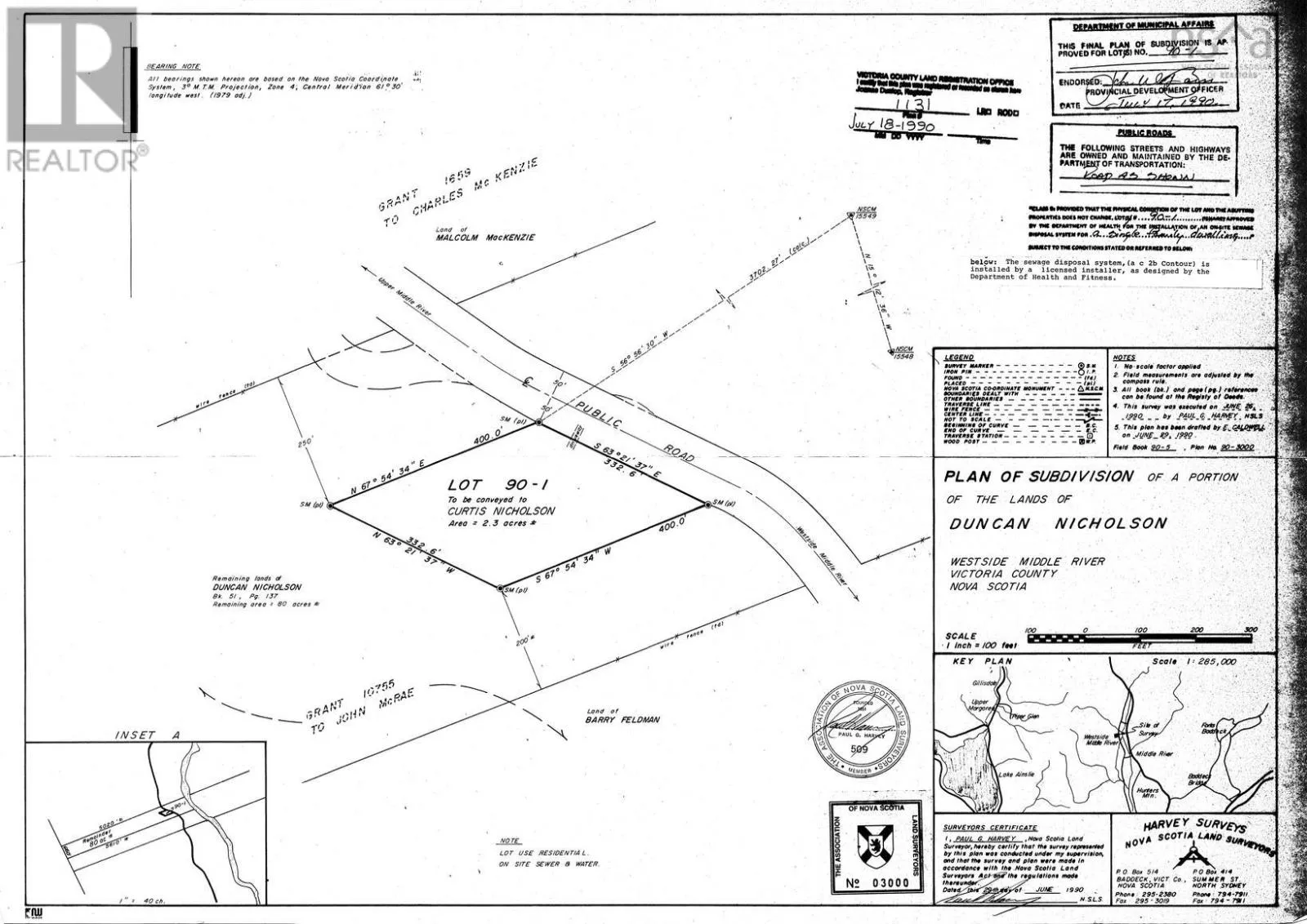 Take the Cabot Trail from the Trans Canada Highway. Turn left onto Middle River West Road. Property on the left side just past Middle River Tire Craft. Discover 77 acres of natural beauty just 20 minutes from Baddeck and only moments off the world-famous Cabot Trail. This property offers a blend of hardwood and softwood forest, with a mix of cleared areas in various stages of regrowth alongside pockets of mature trees. The gentle slope of the land provides numerous potential building sites, each offering privacy and a peaceful setting. With fibre op and power already at the road, this property is ready for your vision, whether a private retreat, hobby farm, or future homestead. (id:27476)