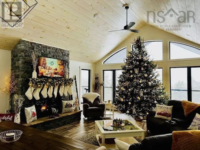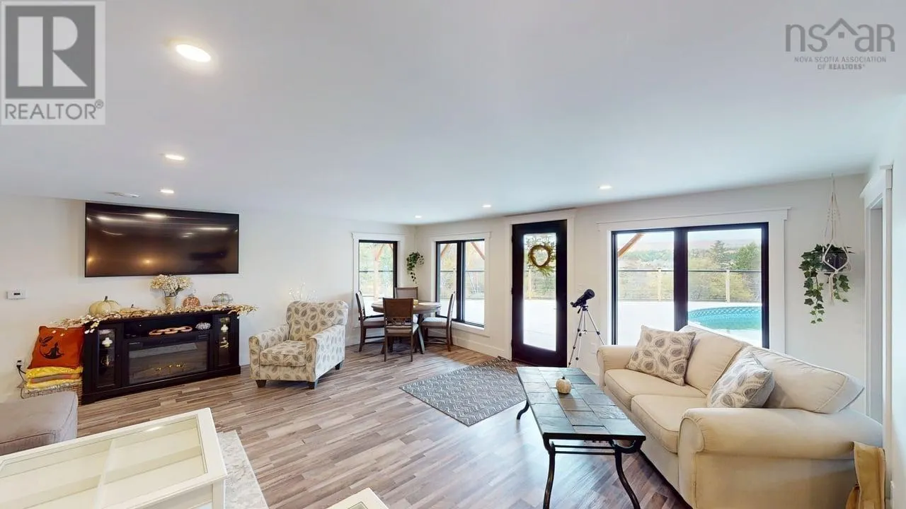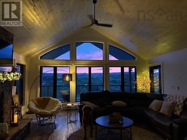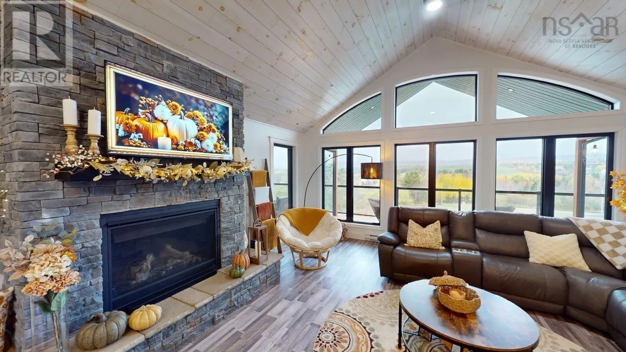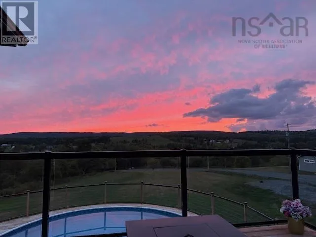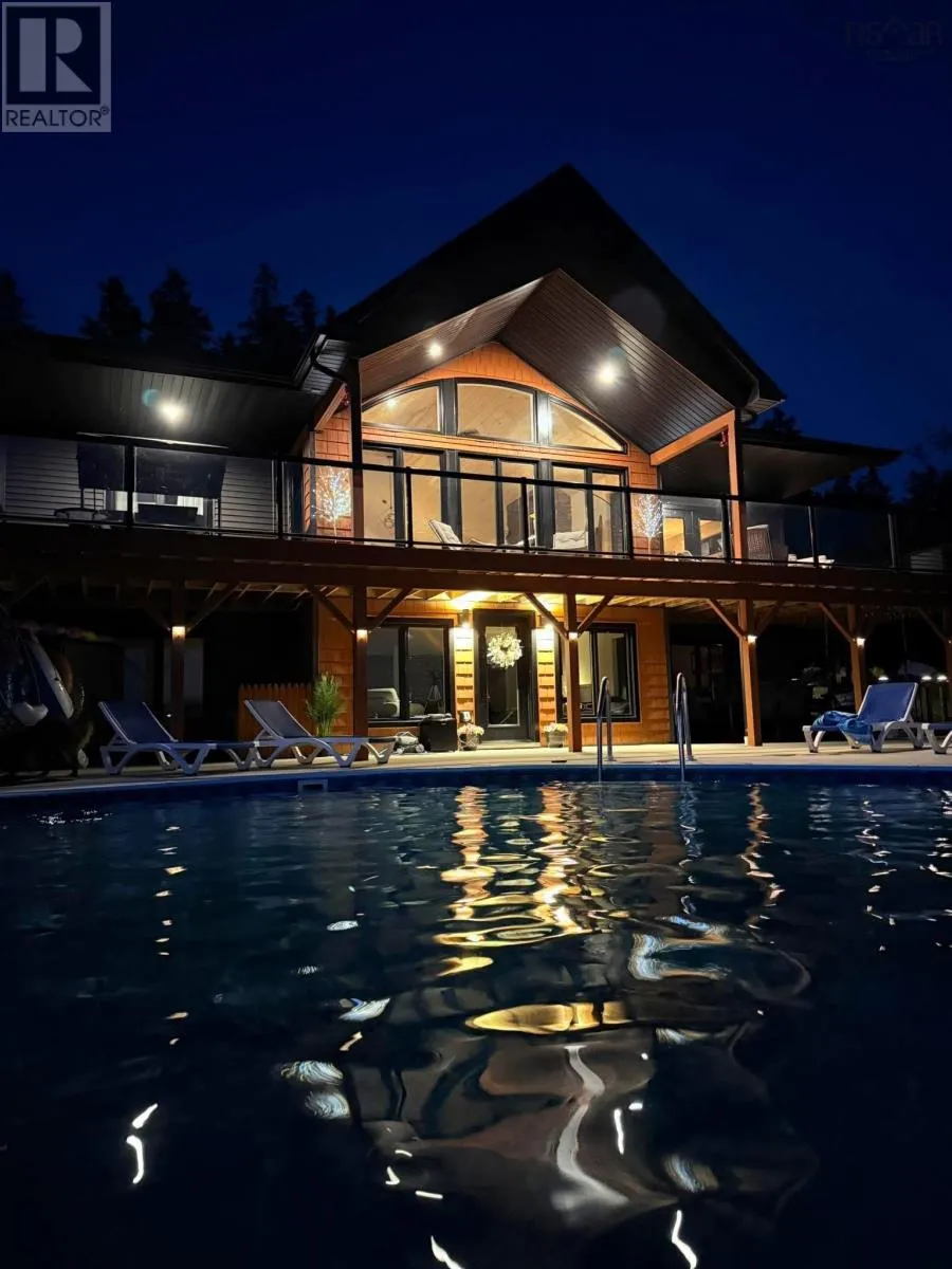 NS-245 to Lower North Grant Rd to Birds Eye View Lane Visit REALTOR® website for additional information. Built in 2022, this stunning executive chalet-style home offers over 3,400 sq. ft. of luxurious living space and is sure to impress! Featuring expansive windows, 13-ft cathedral ceilings, a stone fireplace, custom lighting, pine board ceilings, and high-end finishes throughout. Professionally appraised and priced accordingly. Located in scenic Lower North Grant, this hilltop property offers breathtaking views of sunsets, rolling hills, and valleys - just 5 minutes from Antigonish, blending country charm with convenience. Inside, the quality craftsmanship is evident in every detail. The open-concept kitchen, dining, and living area is perfect for entertaining, complete with a functional island, beverage fridge, and plenty of cabinetry. The bright living room opens to a full-length covered balcony overlooking the pool and picturesque landscape, ideal for dining or lounging outdoors. The primary suite features a fireplace, accent wall, balcony access, walk-in closet, and spa-inspired ensuite with a walk-in shower and soaker tub. Two additional bedrooms, a main bath, and a laundry area with sliding doors complete the main level. The lower level offers a spacious rec room with patio access to the pool area, a fourth bedroom, a half bath, an office/study area, large storage, and a utility room. Comfort is ensured year-round with in-floor heating (lower level), a ductless heat pump, a propane fireplace, and electric baseboards. The home is also generator-wired, and all bedrooms are acoustically insulated for peace and privacy. A 19' x 8' pop-up locker provides extra storage for lawn equipment, and select pool/outdoor furniture is negotiable. Experience the perfect balance of comfort, style, and functionality where every day feels like a retreat. (id:27476)