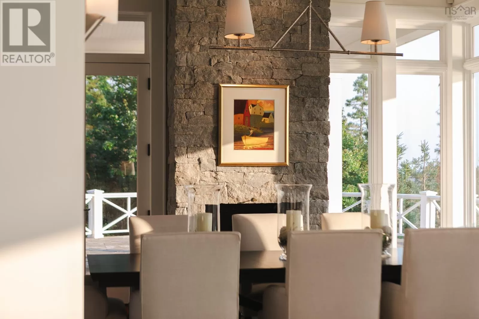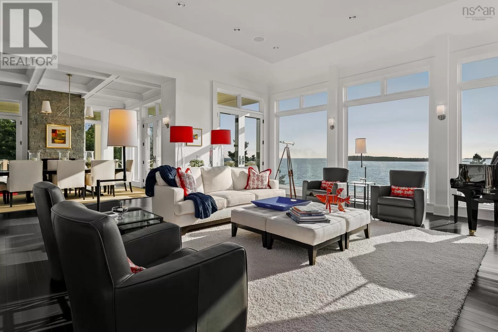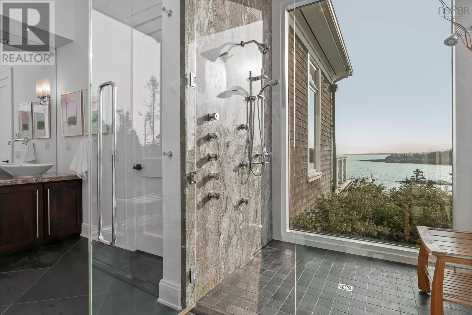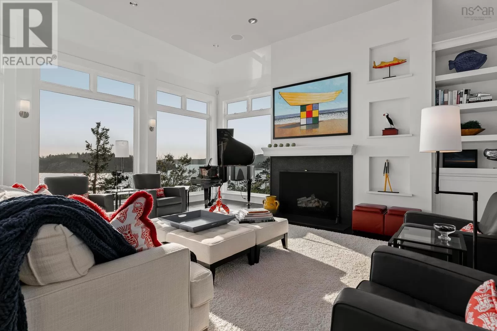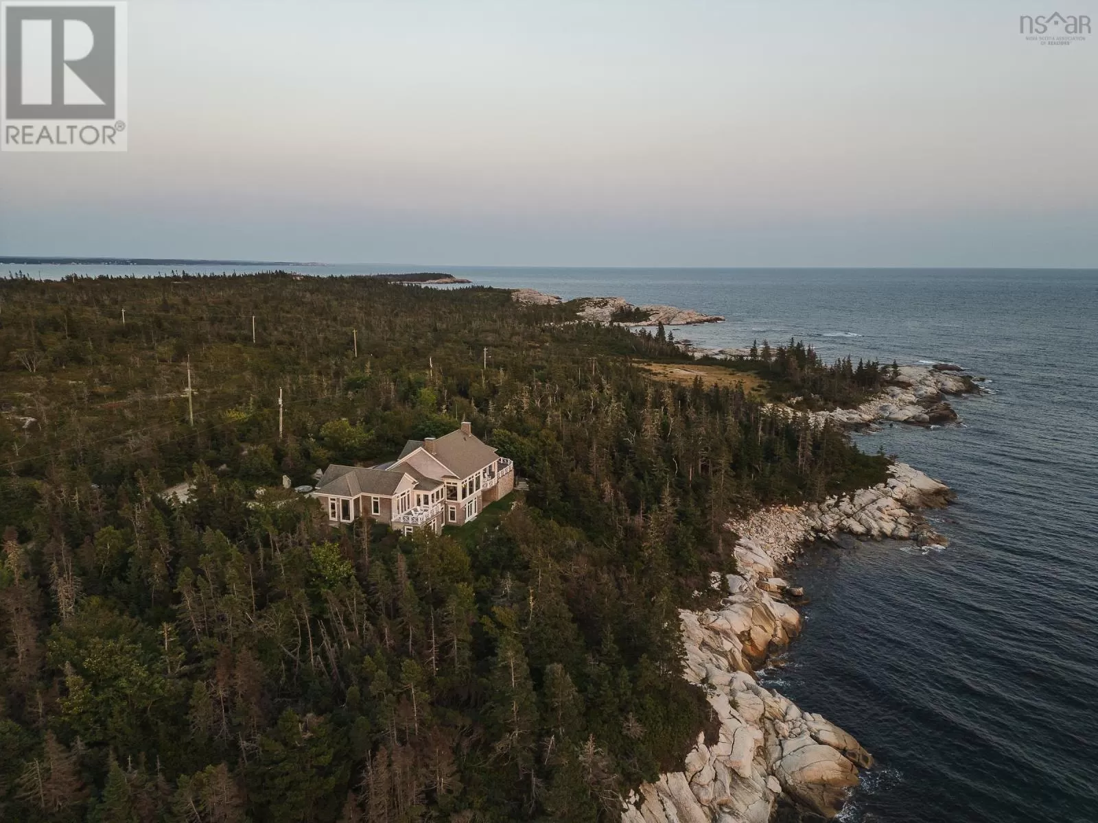 Highway 329 to Northwest Cove, to The Pointe on the Aspotogan Peninsula. Discover this jaw-dropping and meticulously designed South Shore oceanfront oasis! Renowned architect Michael Grunsky created this magnificent one-of-a-kind residence for those seeking an extraordinary lifestyle. Nestled on 12+ acres and 656' of shoreline, this property boasts striking 180 degree southwestern views of bold ocean vistas, rocky coastline, uninhabited islands, inlets and stunning sunsets over the Atlantic. The main floor was carefully curated to blend perfectly with the outdoors. The great room impresses with floor to ceiling windows that seamlessly flow to the light filled dining room and spacious chef's kitchen. Next to a charming sitting room with wood burning fireplace, the spectacular primary suite, with a luxurious ensuite and large walk-in closet, opens to a private waterfront deck, enabling spacious one level living. The great room and the dining room both open to an awe-inspiring ocean view deck and large stone patio featuring an exterior fireplace, ideal for entertaining. The garden level includes a media room (possible bunk room) potential wine or hobby room, full bath, three oceanfront guest bedrooms, (one currently used as a Study), one with an elegant ensuite, and a tremendous amount of storage space. Filled with custom features, no detail was overlooked including 4 wood burning fireplaces, high ceilings, extensive built-ins, exquisite stone and millwork and walls of windows in all the waterfront rooms. This home is located at The Pointe, a private enclave of fine custom-built homes featuring 25 acres of common land and coastal trails for hiking. Perfectly nestled on the South Shore between Chester and Hubbards and 5 minutes from Bayswater Beach, the area offers seasonal farmers' markets, Yacht Club, Golf Club, full-service marinas, Art Centre, Playhouse, quaint shops, cafes and more. Only 40 minutes from Halifax and an hour from Stanfield International Airport. This property is exempt from the Federal Ban on Foreign Buyers. (id:27476)
