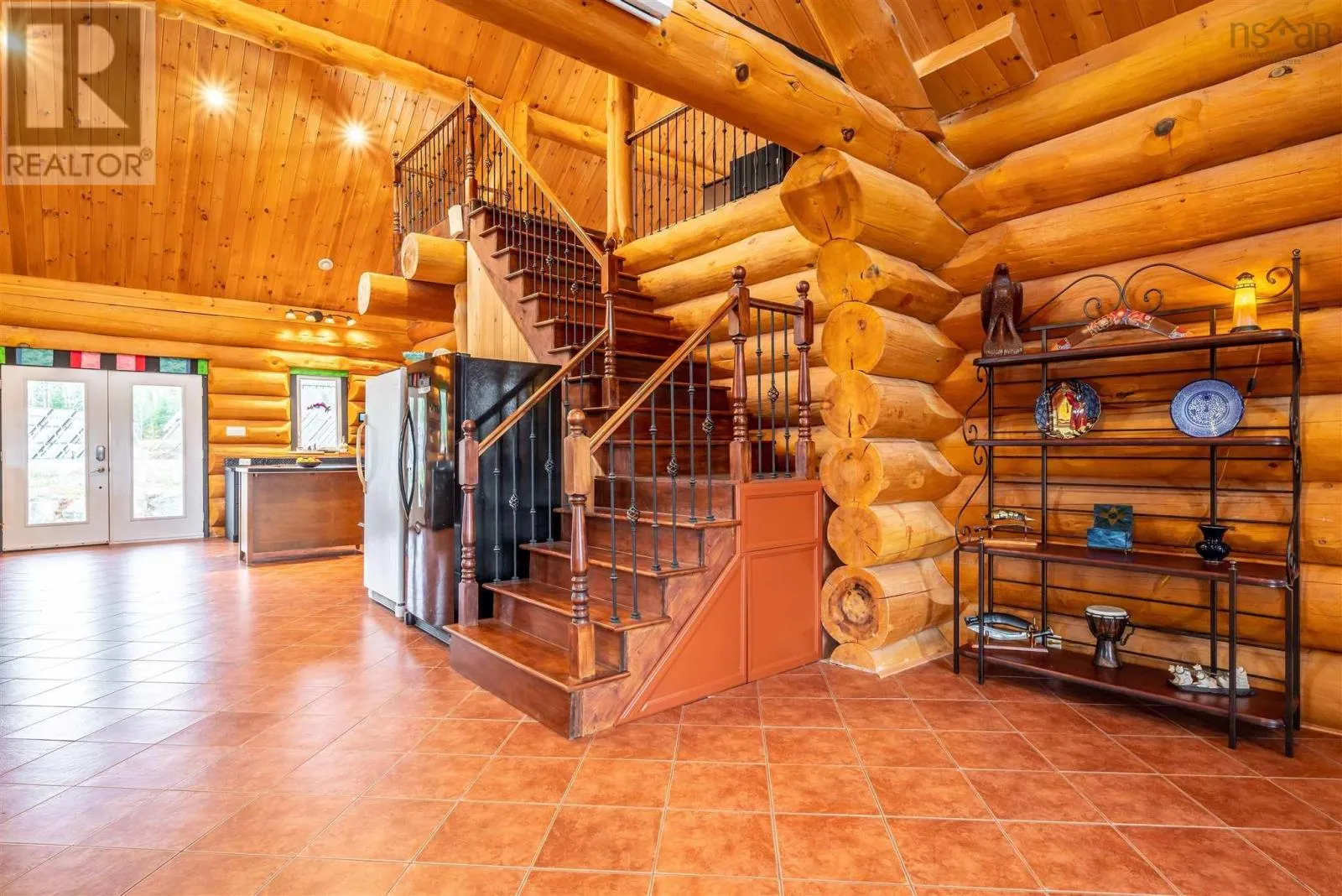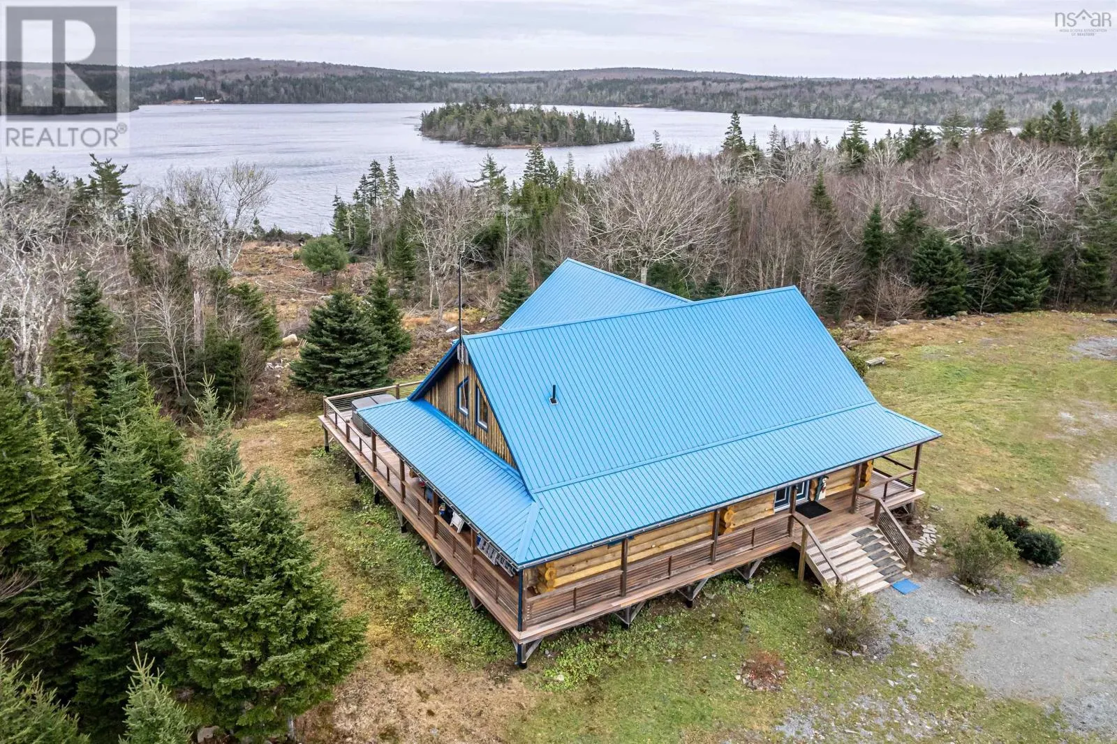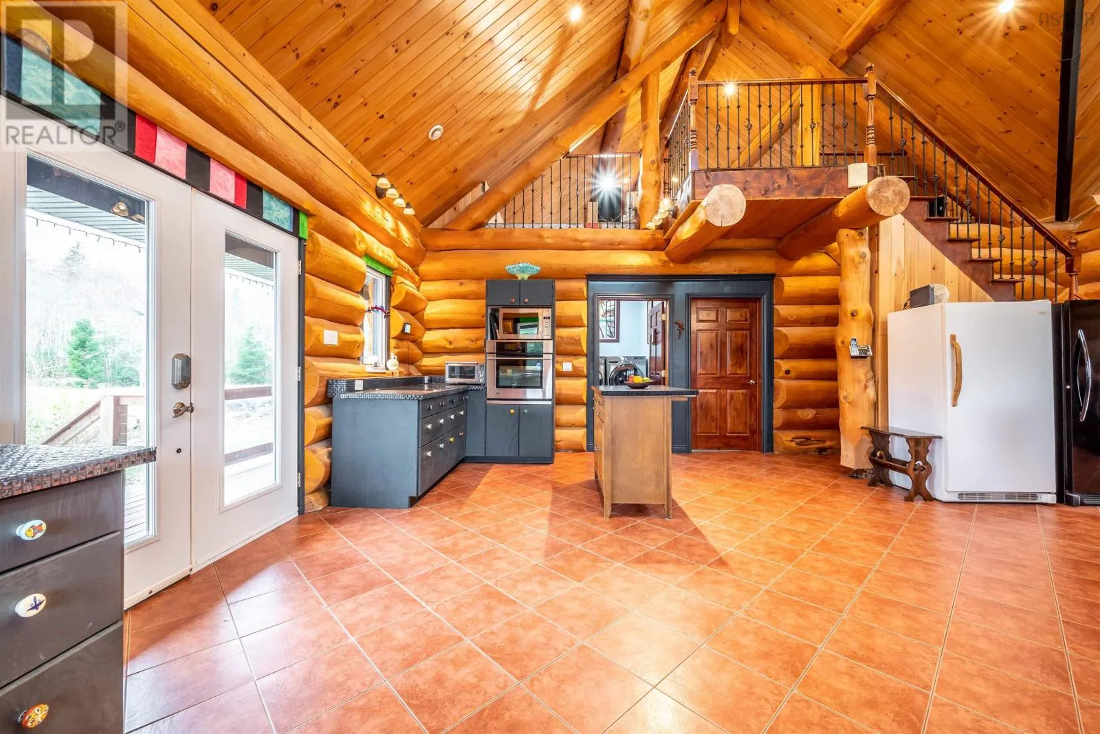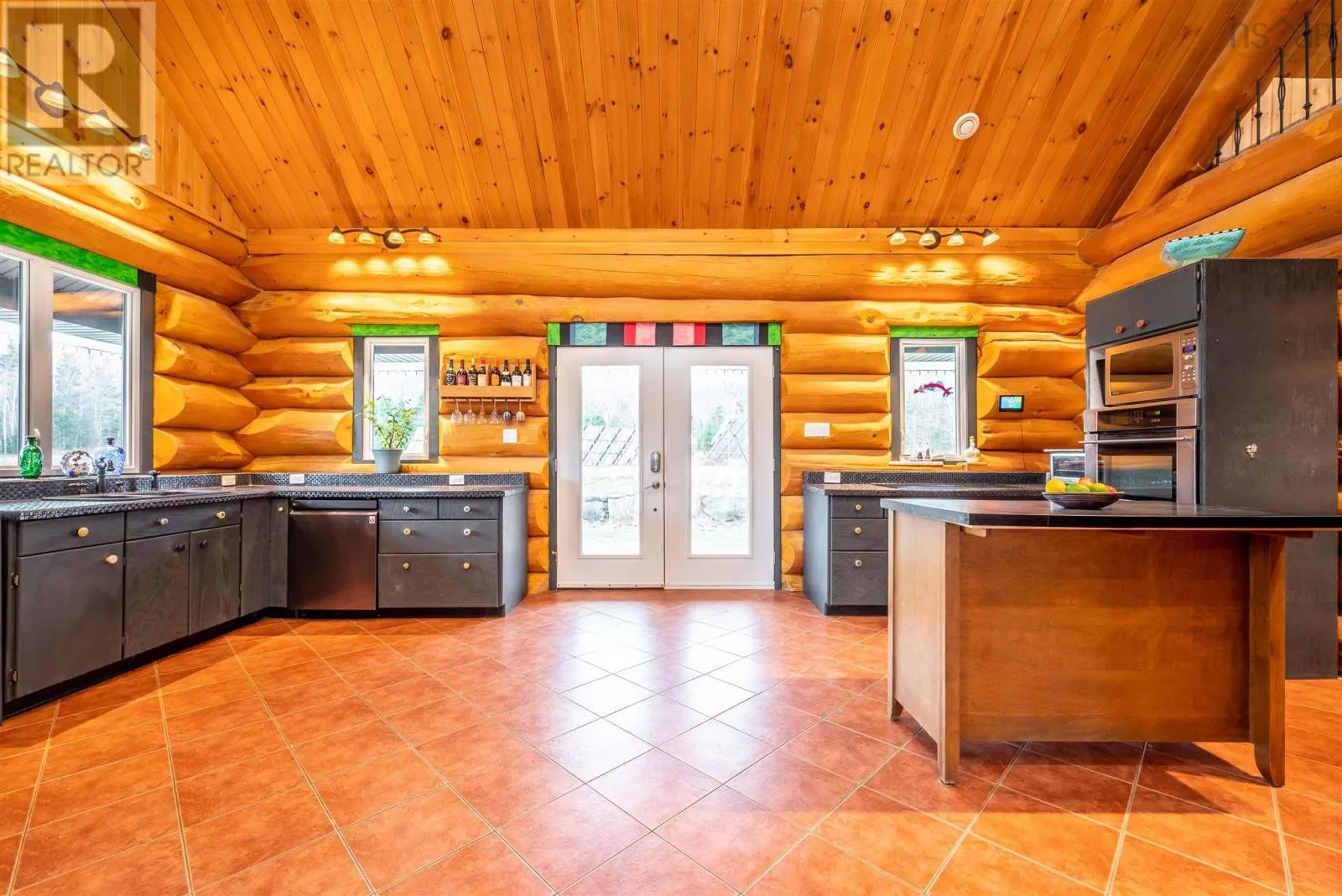 hwy 7 east - left on dufferin mines rd - 7 km Once in a lifetime opportunity in beautiful Nova Scotia. This majestic 2470 sq ft custom pine log home with an 1800 sq ft partially finished walk-out basement is set on 25 acres of mixed trees and offers 1375 feet of pristine lakefront. The main level features ceramic floors throughout, a stunning open concept kitchen, dining and living area with 22 ft cathedral ceilings, and beautiful lake views. The spacious, sound-proofed primary suite includes a luxurious ensuite, walk-in closet, and a private balcony with direct access to the hot tub. The main level also includes a laundry room with a half bath. The loft provides a bright open space perfect for an office, studio, gym or can be converted into two additional bedrooms if needed.Built with large 40 cm logs, the home exceeds R2000 energy standards and includes energy-efficient appliances, vinyl windows and 6 ft double garden doors. The property features a wide, low-maintenance wrap-around composite deck and accessibility touches including wider doorways. A 14.5 KW solar system with Net Metering, hot water collectors, and an air-to-water heat pump provide in-floor radiant heat and summer cooling, while the commercial-grade diesel generator, battery bank, and oil-fired water boiler ensure reliable backup power.A fully insulated 2400 sq ft workshop with in-floor heat, its own water supply and septic, and commercial use approval offers endless possibilities for business or hobby use. A new 10 x 33 greenhouse with modern amenities is also included. Enjoy ATV and snowmobile trails throughout the property, and a peaceful lakefront area ideal for swimming, boating, fishing, or relaxing. The lake offers approximately 7 meters of depth with a gradual shoreline. Located just 20 minutes from hospital and essential amenities, 35 minutes to Taylor Head Provincial Parks sandy beaches, and under 2 hours to Dartmouth, Halifax and the Halifax Stanfield International Airport. Full list of inclusions, upgrades and luxury finishes! (id:27476)