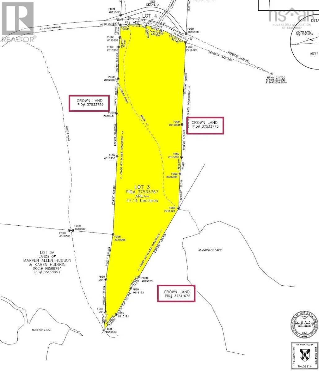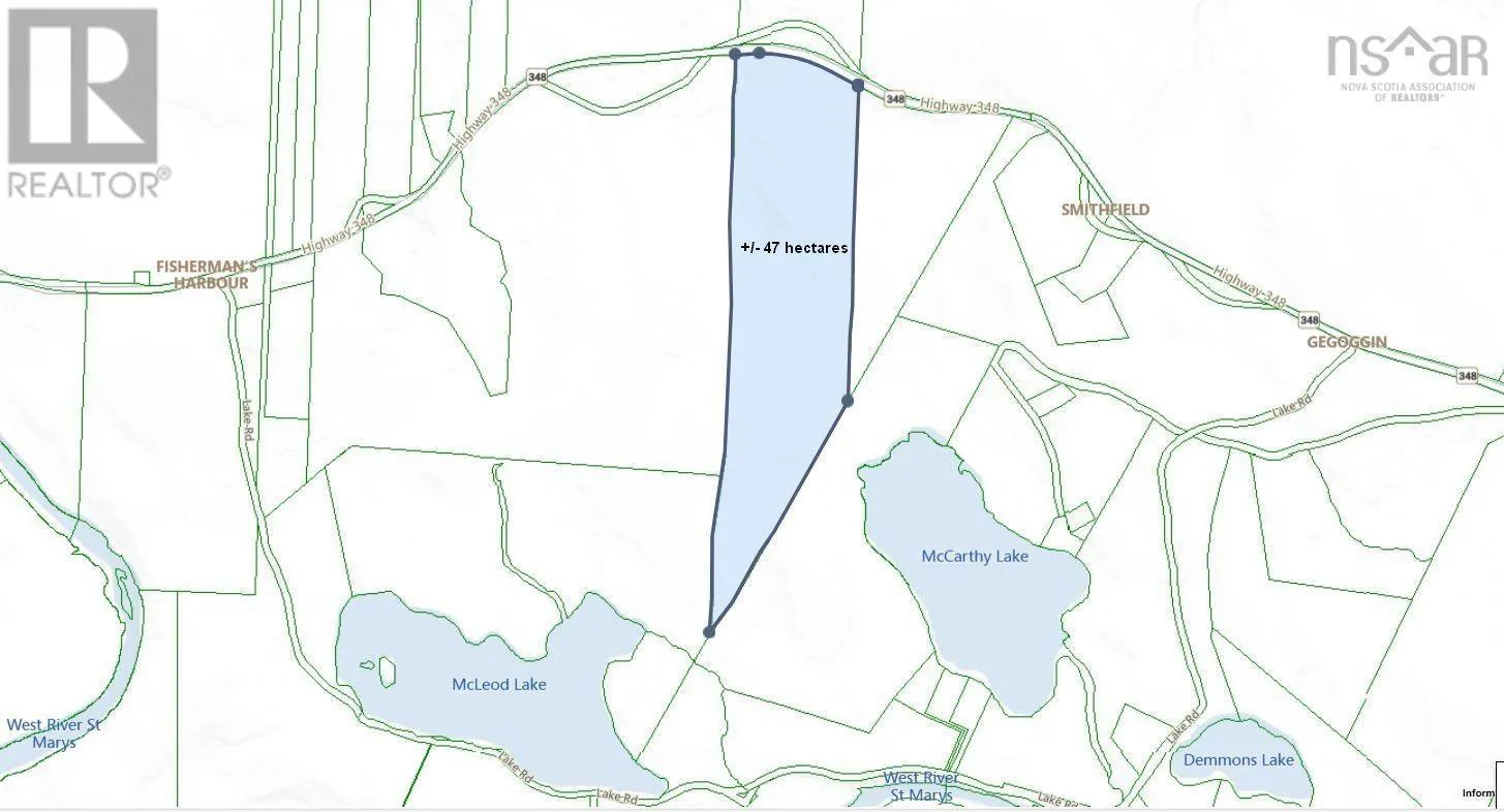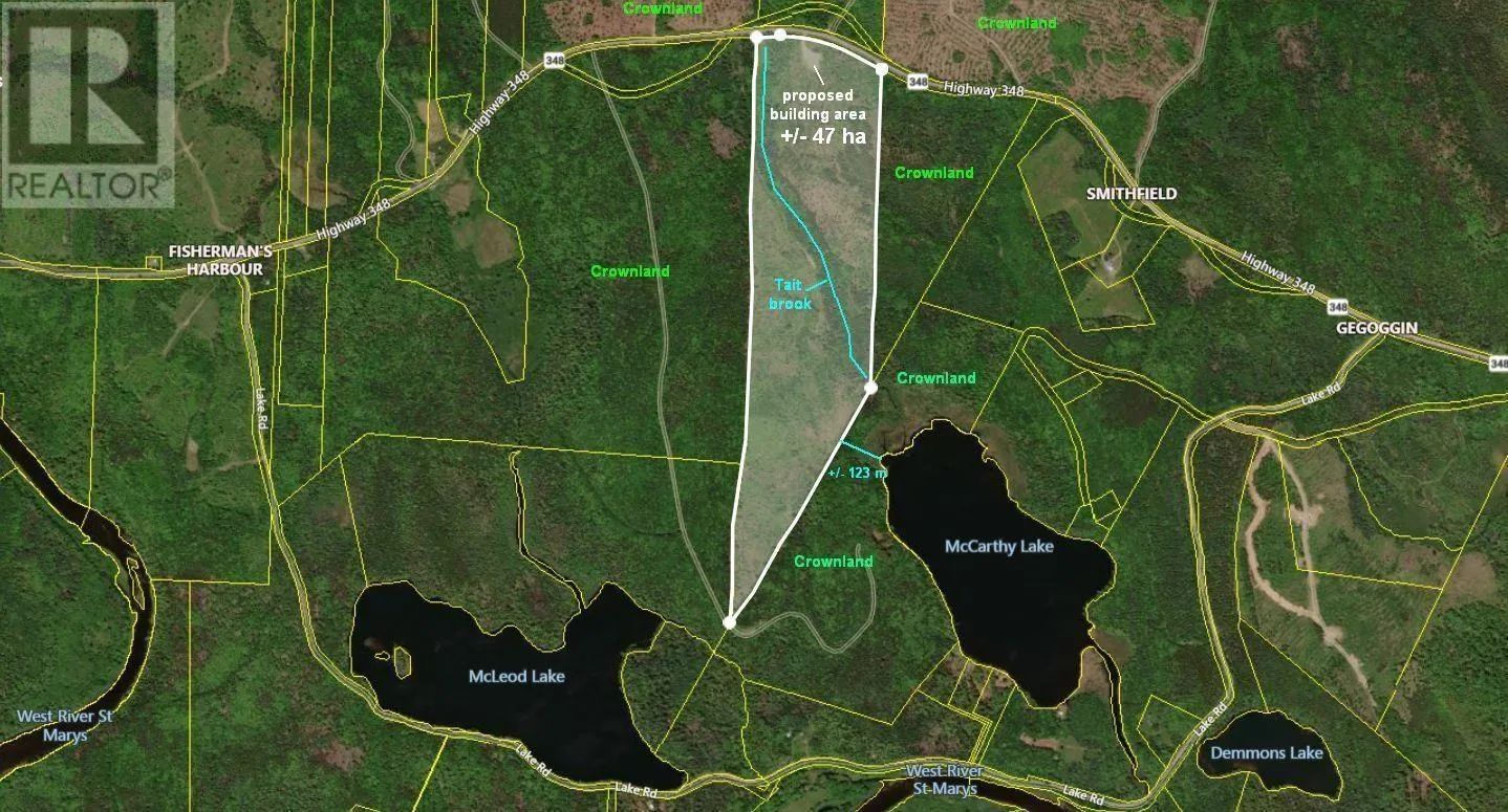 Coming from Highway 7 out of Antigonish towards Sherbrooke, turn right onto Highway 348, property is on the left Smithfield 116 acres, surveyed and migrated. No restricted covenants. This incredible acreage is located directly on a public road. A short driveway is in place, offering stunning views form a plateau over the property. The area was partially cleared a few years ago. A healthy regrowth and older forest stands are present. The property is bordered by large Crownland areas on both sides. A small freshwater creek ("Tait Brook") runs down through the property approximately midway through the property and empties into nearby McCarthy Lake. This beautiful "fresh water lake" is only about 120 meters from the rear eastern area of the property. No matter if you are looking for a permanent residence, a nice cabin, to be self sufficient or just leave your camper up on the plateau to spend weekends and vacations, this property is perfect for it. The property is located directly on West River Road ( Hwy 348). Power and Phone are on the property line. Antigonish, a popular University town with an abundance on stores and restaurants can be reached in around 40 minutes. (id:27476)