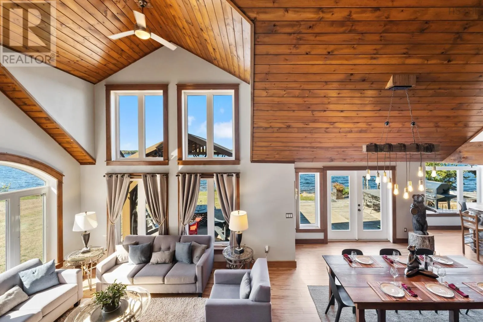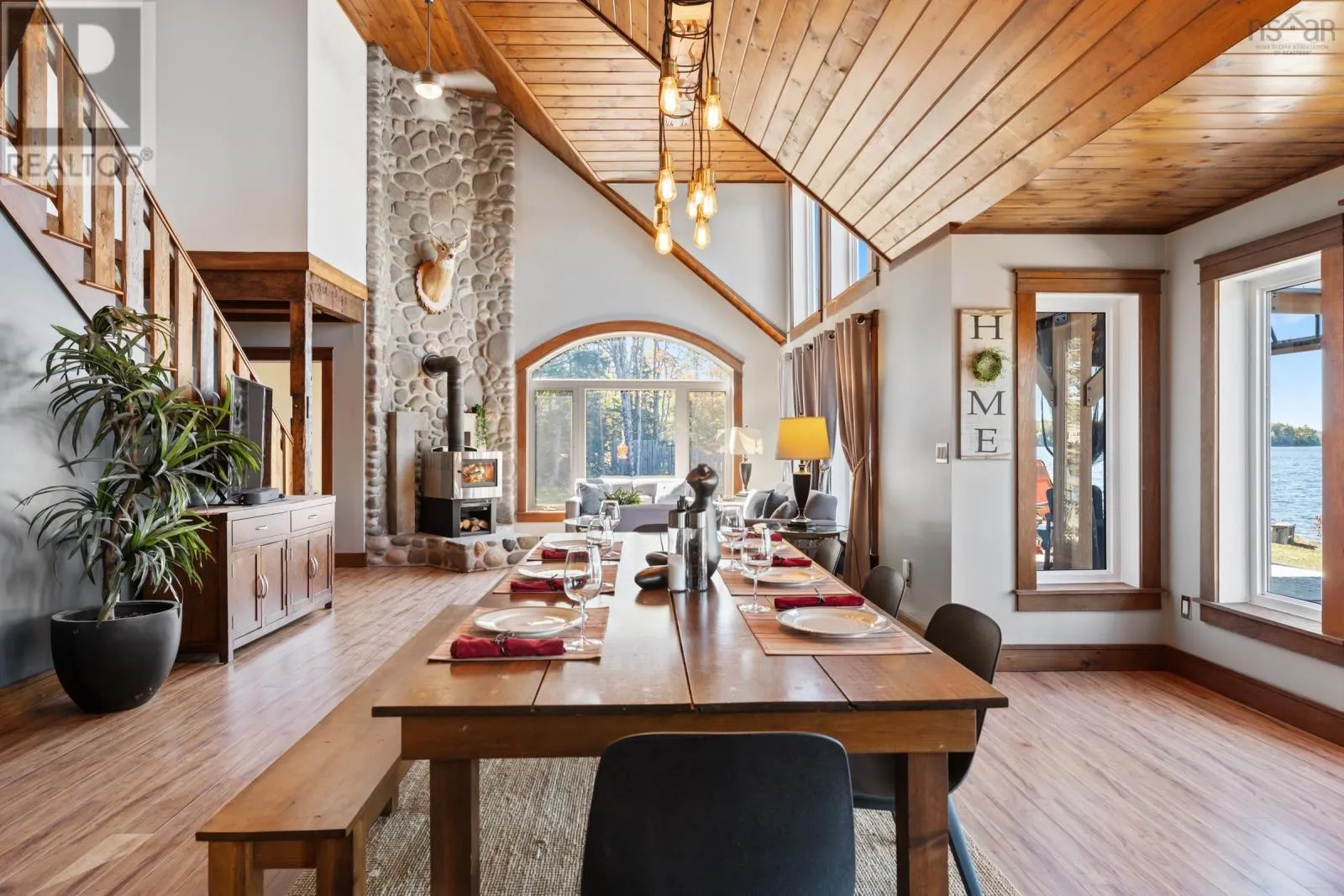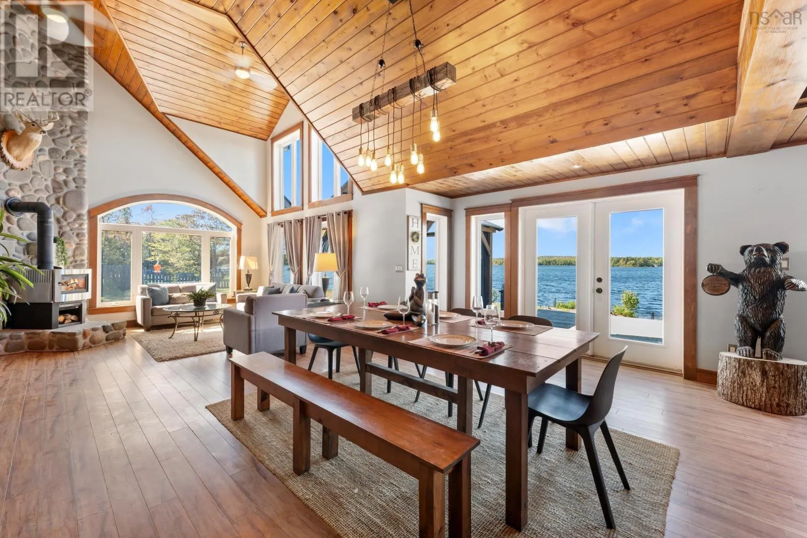 Contact Listing Agent Live the dream at 141 and 143 Timberland Trail, located on nearly 9 acres with approximately 494 feet of water frontage on desired Porters Lake. This lake is located 15 minutes to the town of Digby and is the perfect lake to swim, fish and boat on. This property features a main house, separate apartment and detached, year round ,waterfront cabin, all with their own kitchens and living spaces. The outside spaces are plentiful and welcoming with covered porches, outside fireplaces, play and entertainment areas, beautifully landscaped lawns and gardens and a beach and dock area. Inside the main house you will be greeted by fantastic views from every room, open kitchen, living and dining. A main floor primary suite with a 4 piece bath and walk in closet. There is also a large family room with a pool table and bar in place. On the upper level 3 additional bedrooms and another full bath. The upstairs apartment holds 1.5 baths, two bedrooms and a kitchen and living room, again with spectacular views. There is also a double attached, heated and wired garage, dog run and house, 2 story boathouse, 400 Amp power entrance, wine cellar, in floor heat and the most amazing sunsets. Being offered mostly furnished and with all appliances and guest space essentials! (id:27476)