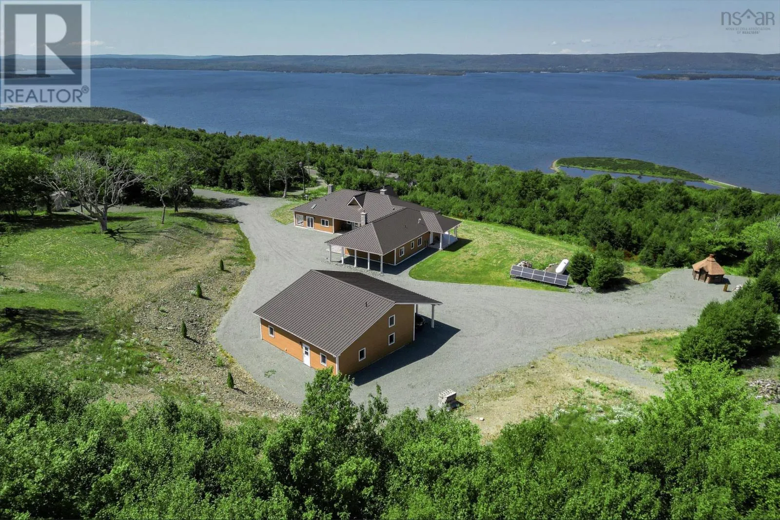 West Bay Road to St George's Channel, if you drive from Port Hawkesbury - past Dundee Golf Resort, Rosemary Dr, to Golden View Dr where is the best view of Bras d'Or Lake ist. Welcome to Golden View Dr. in Cape Breton, where you will find a large, secluded family estate spanning over 337 acres or 137 hectares. This property offers endless opportunities for development or simply enjoying your own privacy. Unique property with breathtaking views of the UNESCO-designated Bras dOr Lake. The main attraction is a newly constructed, high quality, single story modern home with a fully self sufficient guest wing. Entering the main house, you are greeted with unobstructed lake views through floor to ceiling windows in the living room with an open cathedral ceiling, which has the dining room and kitchen attached to one side. Huge sunroom. The main section of the house comprises a master bedroom with a luxurious spa like bathroom, two additional large rooms, a guest bathroom, a spacious pantry, and a laundry room. The guest wing offers an open concept kitchen living area, two bedrooms, and a full bathroom. Next to the main house is an oversized, insulated five car garage with a toilet and workspace designed to complement the aesthetics of the property. The guest house 1152 sq.feet just a two minute walk away. Outdoor amenities include a barbecue gazebo with stunning views, animal dog houses with fenced areas, a wooden chicken coop, a cleared plateau, and numerous hiking trails. Additional to the main 337 acres (three parcels), a 6-acre waterfront with one of the best Bras dOr Lake beachlines is available for purchase. This property is a blank canvas, offering limitless possibilities limited only by your imagination and creativity. Such unique properties are rarely found! Do not just dream, live your dream! (id:27476)