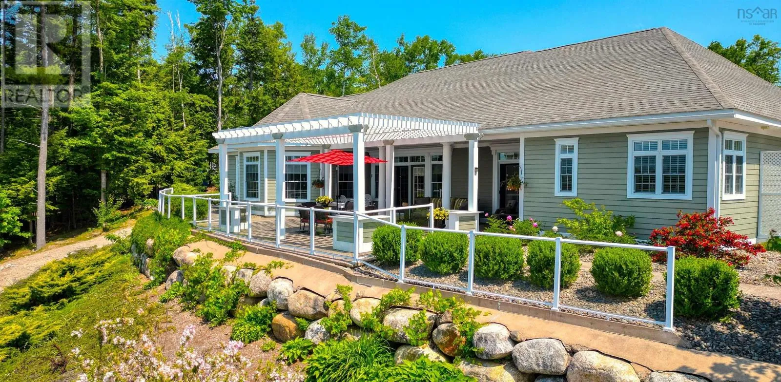 Hwy 103 to Exit 11 Blockhouse ...take Hwy 324 into Blockhouse...at Blockhouse Intersection take Hwy 325 North towards Bridgewater for approximately 4.4km and turn right onto Northfield Road. Take Northfield Road north and then right onto Sweetland Road and then left onto Aulenback Point Road....Follow Aulenback Point all the way to the end of the peninsula and please adhere to posted speed limit ( very important ) sign posted. ***Please do not take Sweetland Road via Cornwall Road which is mostly gravel road.*** 'Paradise On Point' located at one of Lunenburg County's most prized lakeside locations, Aulenback Point, this bespoke-design home commands the head of a peninsula facing west to the sand beaches of Oickle Island. Designed for one-floor living, this ICF home features in-floor, geothermal heat complimented by ductless cooling for ease of comfort. Conceived as a sanctuary to entertain family and friends, the lifestyle of leisure extends from the main living-dining areas onto the patio and pergola framing elevated views of the lake. A large kitchen with adjoining family room and den is the perfect space to prepare a meal while family gathers in front of the fireplace. A large separate pantry, laundry and powder room off the garage entrance exemplify the care taken in this thoughtful plan. A large primary bedroom opens onto the patio and includes two walk-in closets. The spa inspired ensuite features a custom tile shower and soaker tub. Two additional bedrooms, with shared, family bath complete the main floor. The attached, double garage has a loft which would lend itself to a fourth bedroom, den or private office. A second large fully wired and insulated garage, with generous height allocated, would be perfect for an RV or Boat and workshop. The professionally designed, expansive landscaping is meticulous and was created for both its beauty and ease of maintenance. Entering the crest of the fully paved driveway, the view causes one to take pause. Aulenbach Point extends west into one of Nova Scotia's most desired lakes, Big Mushamush, just 15 minutes to the amenities of Bridgewater, the commercial hub of the South Shore. Only 30 minutes to the famed UNESCO Town of Lunenburg and "the three churches" of Mahone Bay. Just over an hour to Halifax and Stanfield International Airport. A great option for a family retreat or perhaps the lakeside retirement home you have always imagined for yourself. (id:27476)