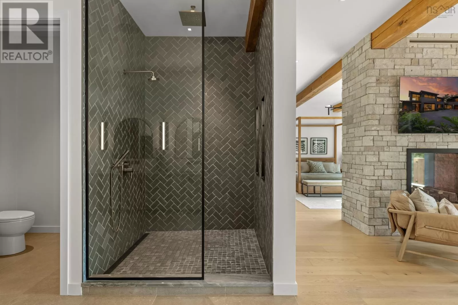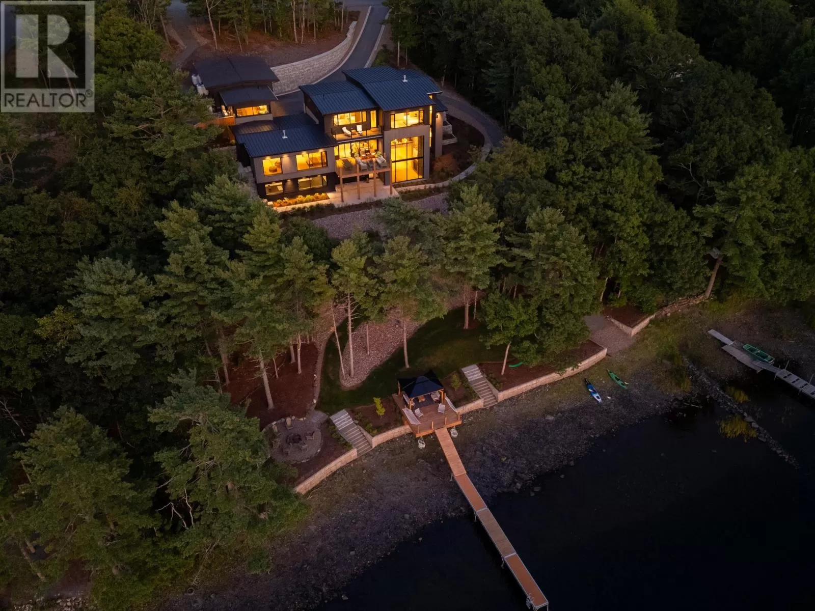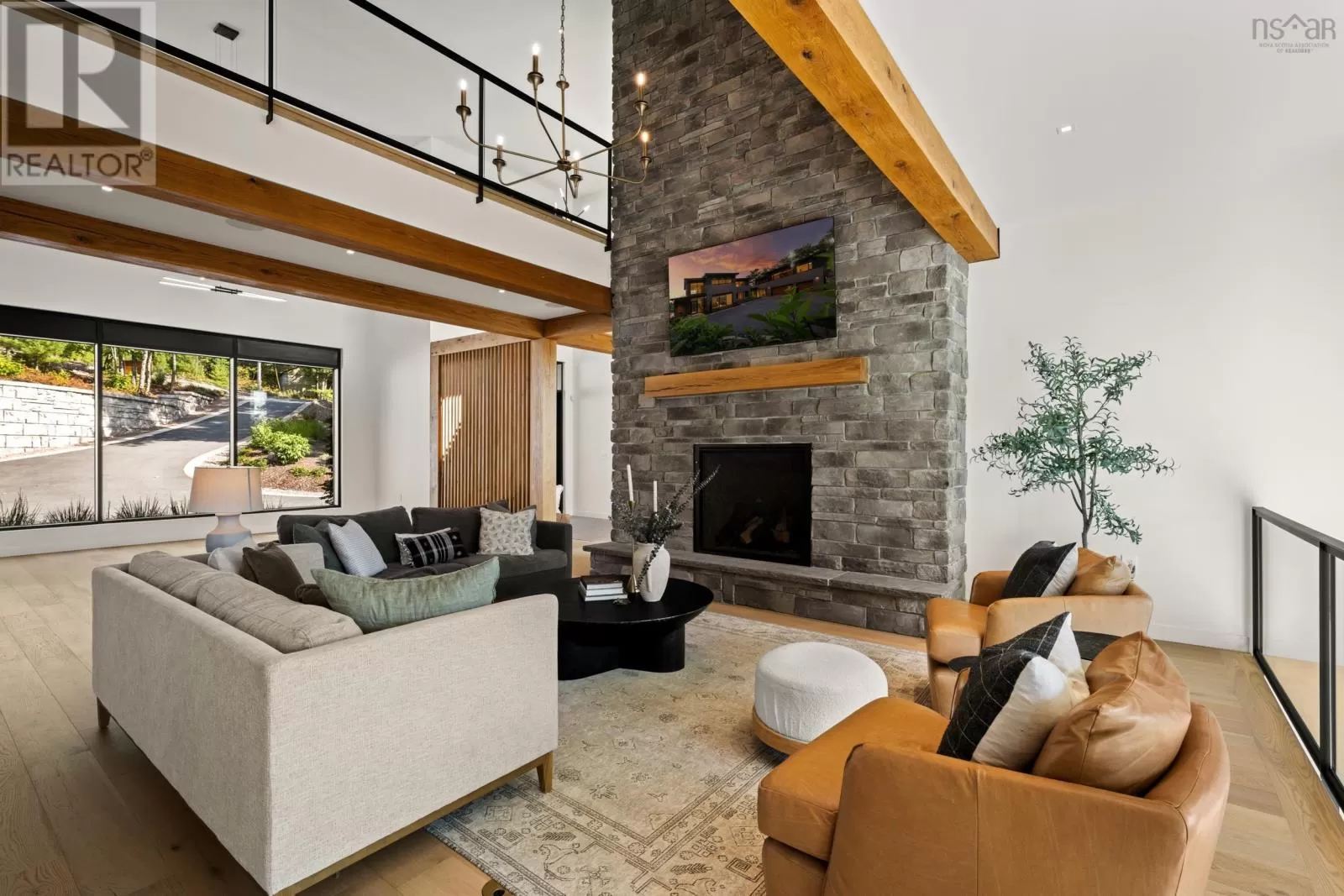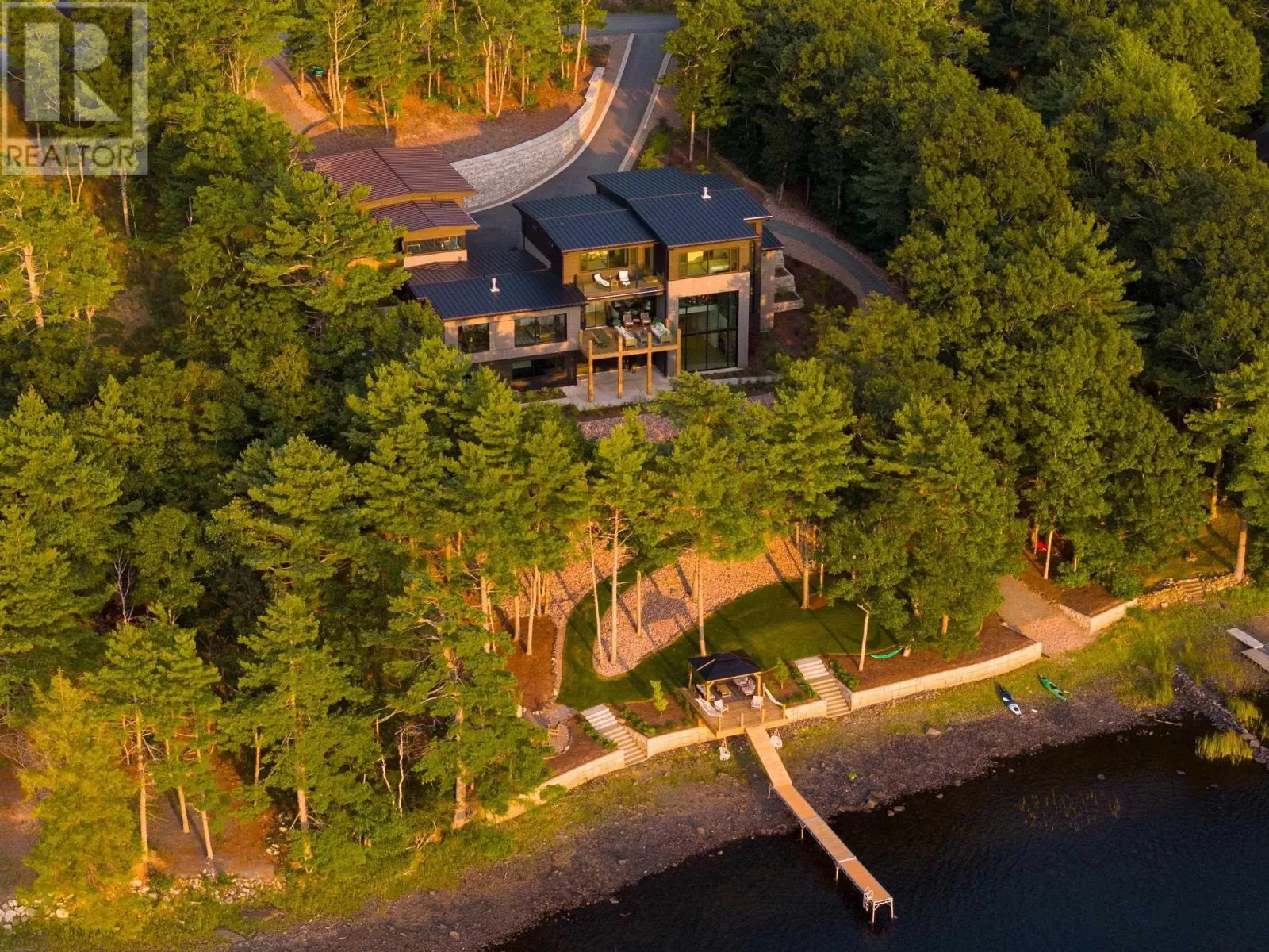 Highway 2, turn left across train tracks and left down Sunnylea Road Terrace House stands as a rare architectural achievement, 10,417 sq.ft. of contemporary design envisioned by David Bourque, crafted to a standard seldom seen in Nova Scotia. Built to commercial grade specifications, this estate marries strength, precision, and artistry, setting a benchmark for luxury living. The construction tells its own story of permanence: ICF walls, an aluminum curtain wall system with Solarban 60 glazing, and a standing seam metal roof create a structure designed to endure. Inside, solid white oak beams soften the modern aesthetic, while radiant in-floor heating, including in the triple garage, ensures year-round comfort. Ten discreet ducted cooling units and a fully engineered mechanical system provide silent efficiency without visual interruption. With 6 bedrooms and 8 baths, the home balances intimacy and scale. The main level primary suite is a private retreat, complete with a lounge, double sided fireplace, walk-out patio, walk-in dressing room with laundry, and a striking ensuite anchored by a sculptural concrete tub. Additional bedrooms feature private ensuites, and the thoughtful flow adapts seamlessly to both family living and entertaining. The culinary space elevates daily rituals, offering a commercial grade gas range, dual panel ready JennAir refrigerators, a statement island, and a secondary prep kitchen. In the loft, you'll find a versatile suite with bunk beds, kitchenette, and bath extends the homes hospitality, while the lower level provides a world of its own with a bedroom, full bath, secret room, wine room, bar, gym, and theatre. Refined finishes, including Emtek hardware, cold rolled steel railings inset with custom glass, Control4 smart automation, and book matched stonework, underscore the homes craftsmanship. Set on 185 feet of frontage along Grand Lake, the property offers a rare combination of natural serenity and modern convenience, with downtown Halifax and the airport within easy reach. (id:27476)