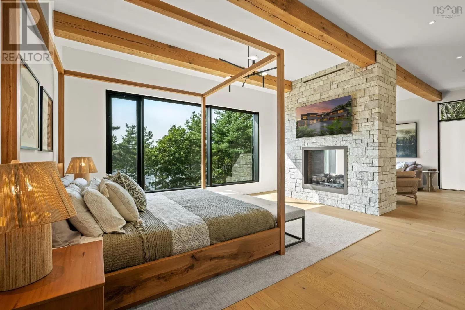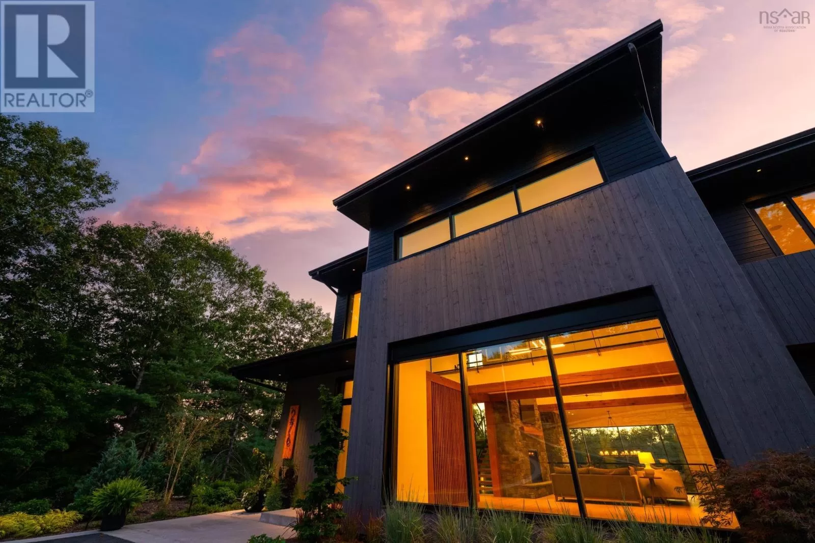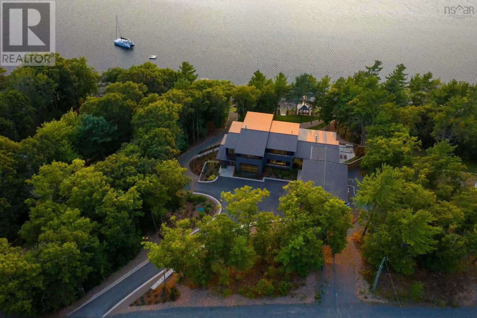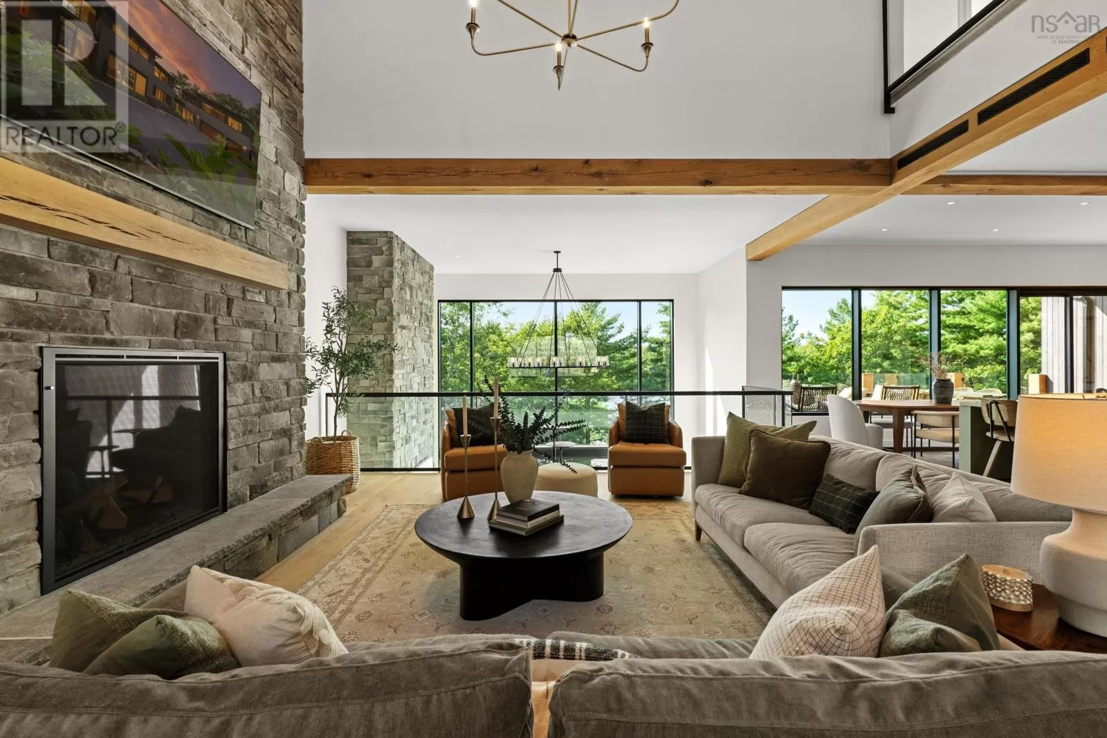 Highway 2, turn left across train tracks and left down Sunnylea Road Terrace House stands as a rare architectural achievement, 10,417 sq.ft. of contemporary design envisioned by David Bourque, crafted to a standard seldom seen in Nova Scotia. Built to commercial grade specifications, this estate marries strength, precision, and artistry, setting a benchmark for luxury living. The construction tells its own story of permanence: ICF walls, an aluminum curtain wall system with Solarban 60 glazing, and a standing seam metal roof create a structure designed to endure. Inside, solid white oak beams soften the modern aesthetic, while radiant in-floor heating, including in the triple garage, ensures year-round comfort. Ten discreet ducted cooling units and a fully engineered mechanical system provide silent efficiency without visual interruption. With 6 bedrooms and 8 baths, the home balances intimacy and scale. The main level primary suite is a private retreat, complete with a lounge, double sided fireplace, walk-out patio, walk-in dressing room with laundry, and a striking ensuite anchored by a sculptural concrete tub. Additional bedrooms feature private ensuites, and the thoughtful flow adapts seamlessly to both family living and entertaining. The culinary space elevates daily rituals, offering a commercial grade gas range, dual panel ready JennAir refrigerators, a statement island, and a secondary prep kitchen. In the loft, you'll find a versatile suite with bunk beds, kitchenette, and bath extends the homes hospitality, while the lower level provides a world of its own with a bedroom, full bath, secret room, wine room, bar, gym, and theatre. Refined finishes, including Emtek hardware, cold rolled steel railings inset with custom glass, Control4 smart automation, and book matched stonework, underscore the homes craftsmanship. Set on 185 feet of frontage along Grand Lake, the property offers a rare combination of natural serenity and modern convenience, with downtown Halifax and the airport within easy reach. (id:27476)