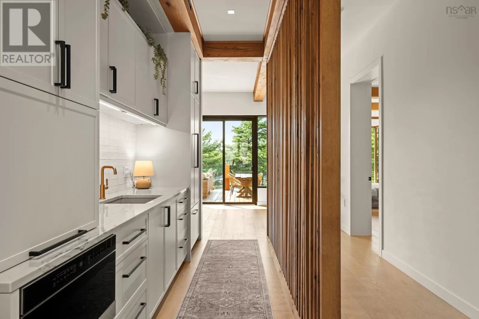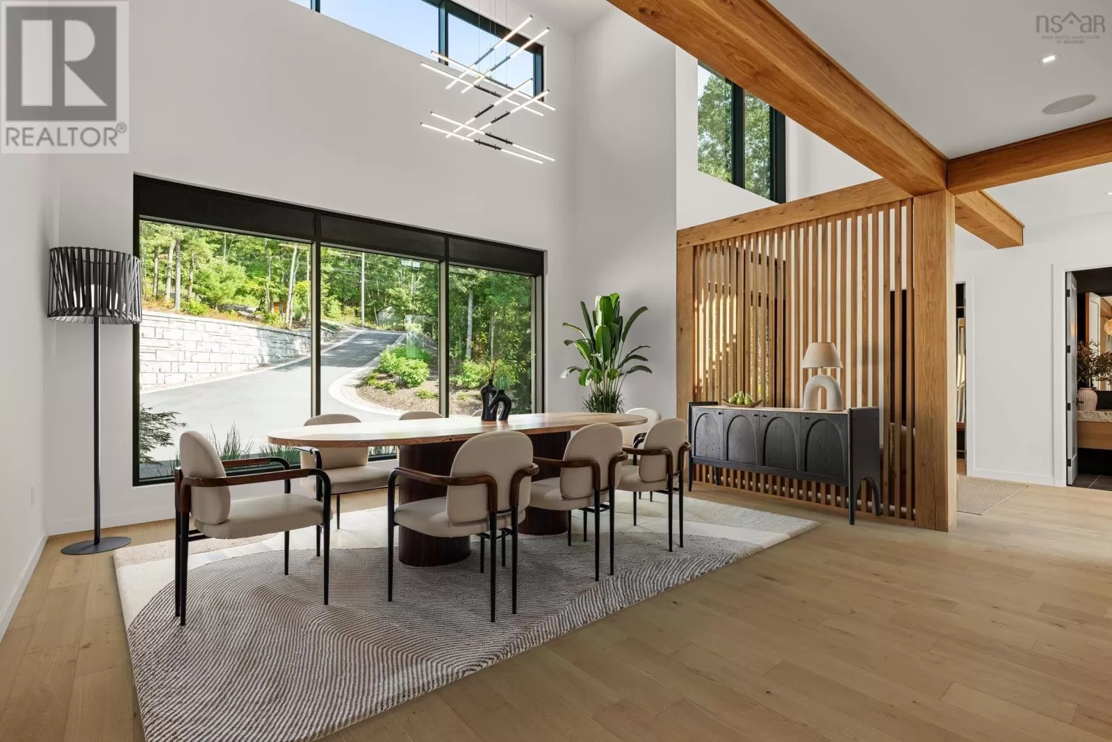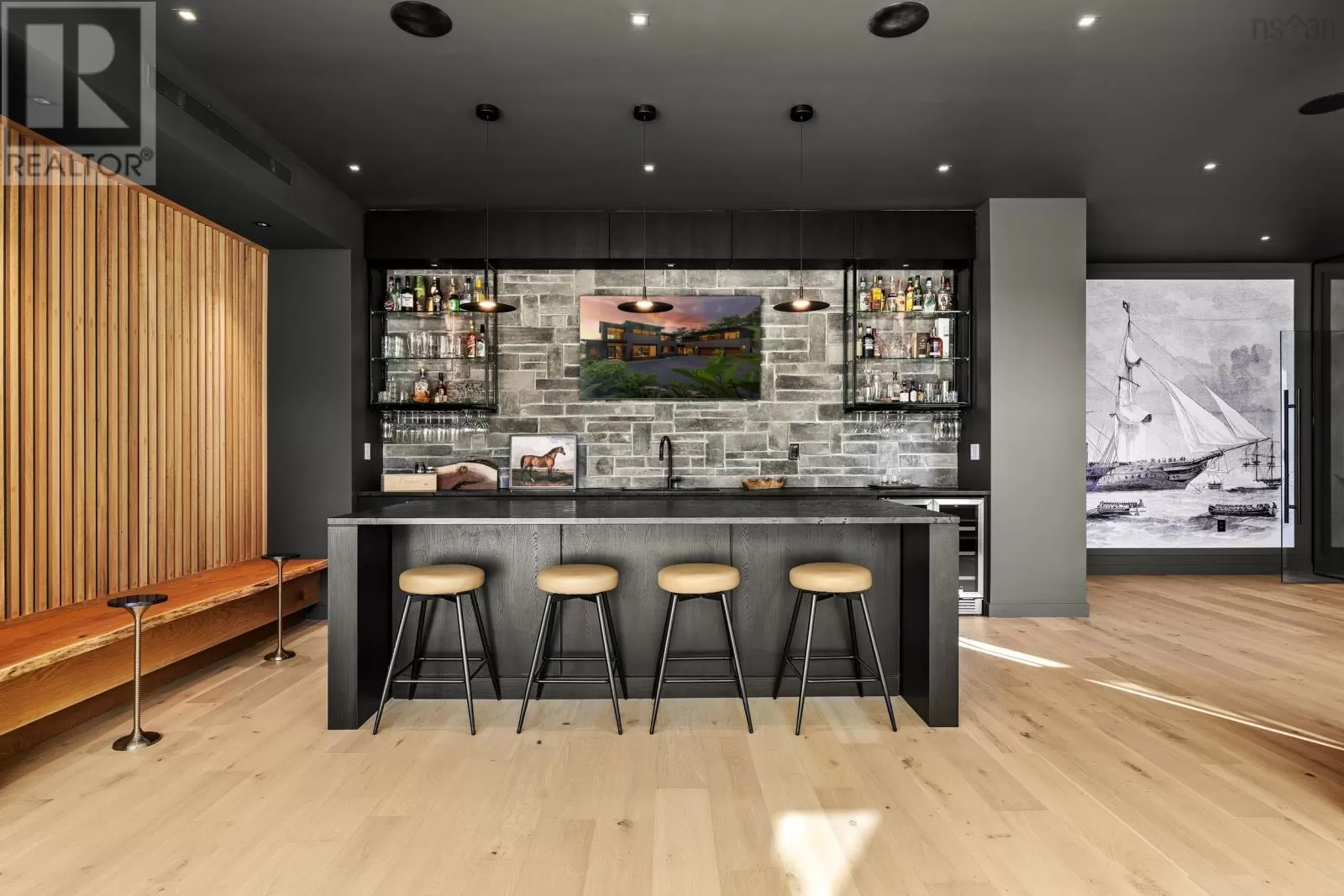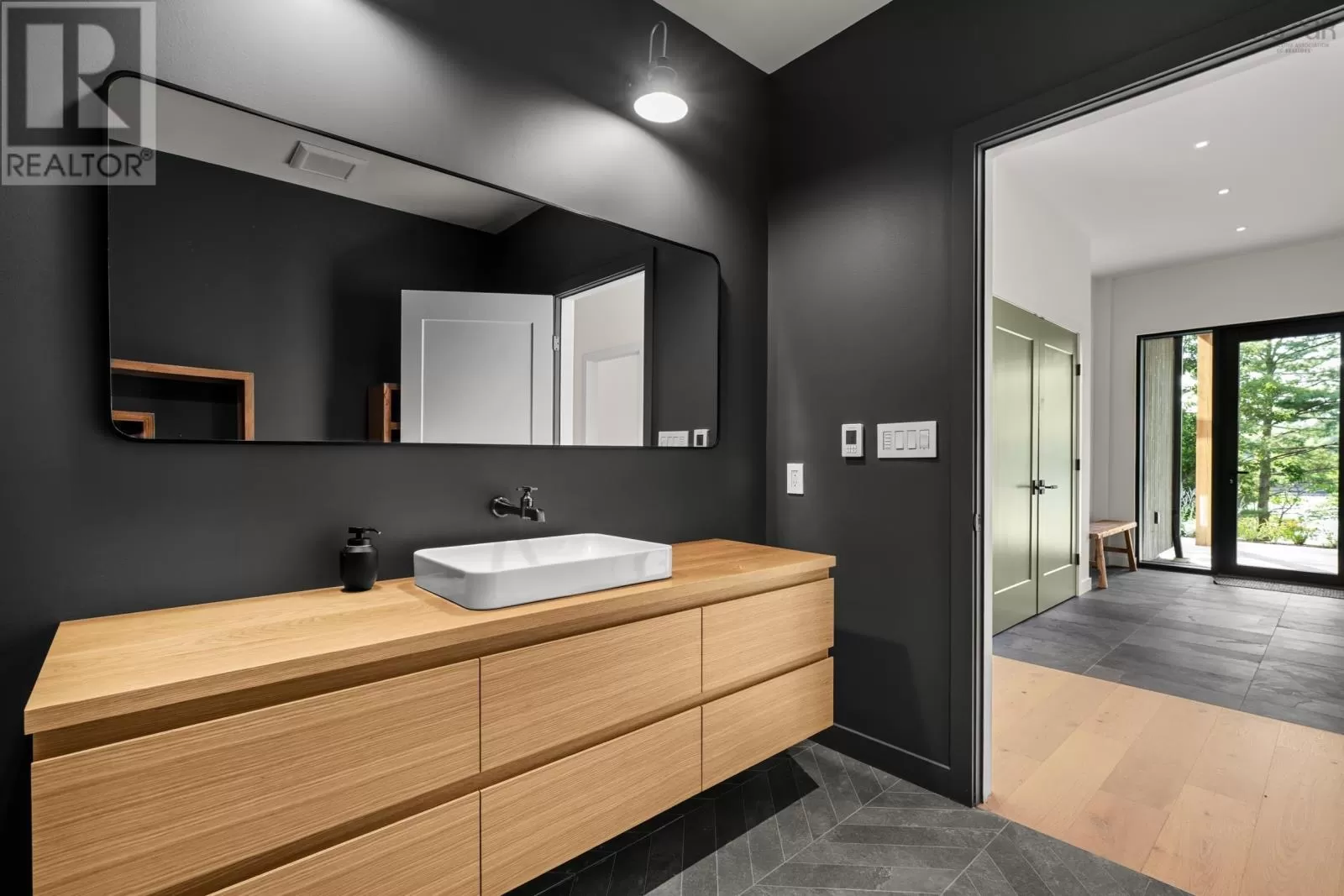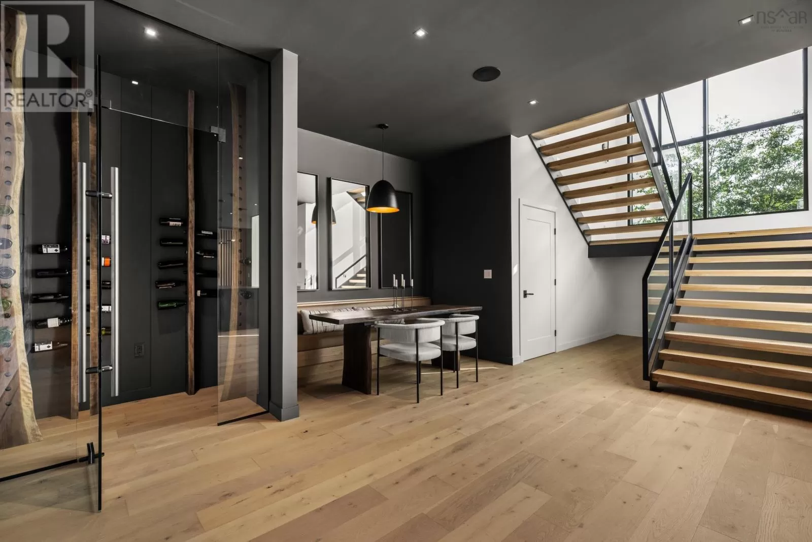 Highway 2, turn left across train tracks and left down Sunnylea Road Terrace House stands as a rare architectural achievement, 10,417 sq.ft. of contemporary design envisioned by David Bourque, crafted to a standard seldom seen in Nova Scotia. Built to commercial grade specifications, this estate marries strength, precision, and artistry, setting a benchmark for luxury living. The construction tells its own story of permanence: ICF walls, an aluminum curtain wall system with Solarban 60 glazing, and a standing seam metal roof create a structure designed to endure. Inside, solid white oak beams soften the modern aesthetic, while radiant in-floor heating, including in the triple garage, ensures year-round comfort. Ten discreet ducted cooling units and a fully engineered mechanical system provide silent efficiency without visual interruption. With 6 bedrooms and 8 baths, the home balances intimacy and scale. The main level primary suite is a private retreat, complete with a lounge, double sided fireplace, walk-out patio, walk-in dressing room with laundry, and a striking ensuite anchored by a sculptural concrete tub. Additional bedrooms feature private ensuites, and the thoughtful flow adapts seamlessly to both family living and entertaining. The culinary space elevates daily rituals, offering a commercial grade gas range, dual panel ready JennAir refrigerators, a statement island, and a secondary prep kitchen. In the loft, you'll find a versatile suite with bunk beds, kitchenette, and bath extends the homes hospitality, while the lower level provides a world of its own with a bedroom, full bath, secret room, wine room, bar, gym, and theatre. Refined finishes, including Emtek hardware, cold rolled steel railings inset with custom glass, Control4 smart automation, and book matched stonework, underscore the homes craftsmanship. Set on 185 feet of frontage along Grand Lake, the property offers a rare combination of natural serenity and modern convenience, with downtown Halifax and the airport within easy reach. (id:27476)