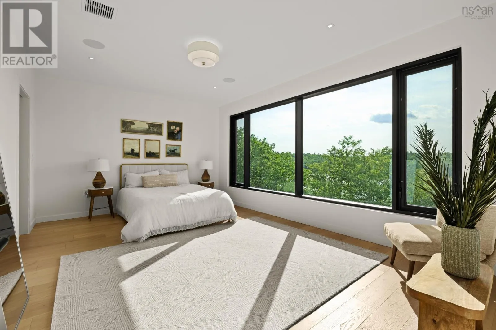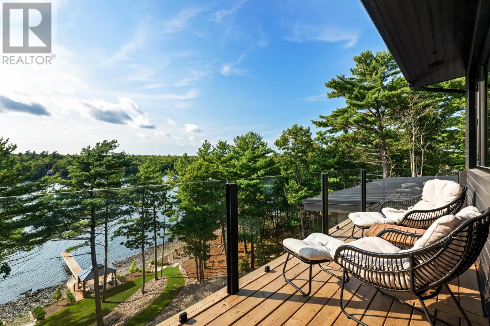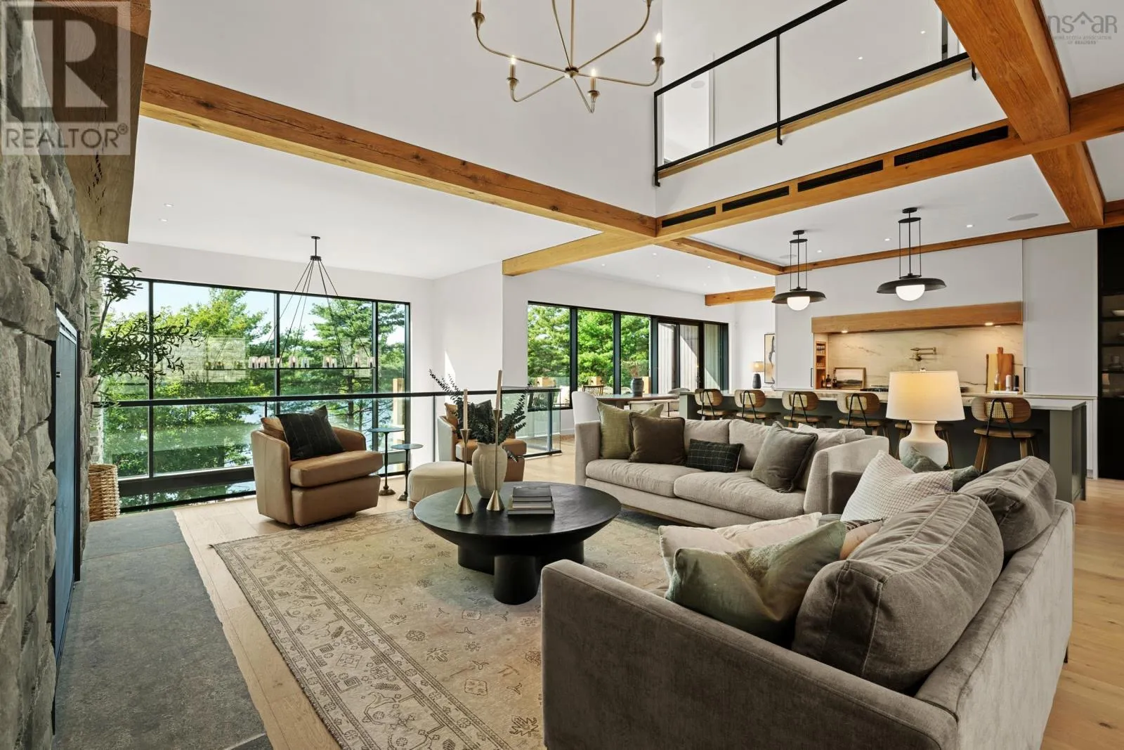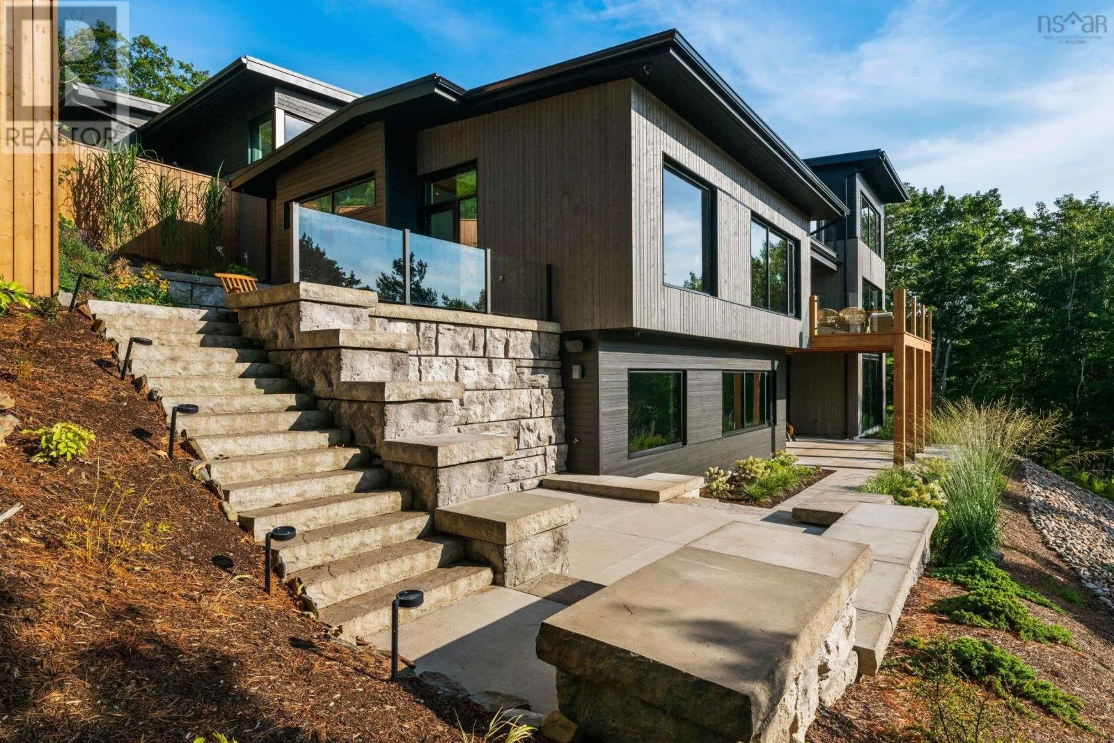 Highway 2, turn left across train tracks and left down Sunnylea Road Terrace House stands as a rare architectural achievement, 10,417 sq.ft. of contemporary design envisioned by David Bourque, crafted to a standard seldom seen in Nova Scotia. Built to commercial grade specifications, this estate marries strength, precision, and artistry, setting a benchmark for luxury living. The construction tells its own story of permanence: ICF walls, an aluminum curtain wall system with Solarban 60 glazing, and a standing seam metal roof create a structure designed to endure. Inside, solid white oak beams soften the modern aesthetic, while radiant in-floor heating, including in the triple garage, ensures year-round comfort. Ten discreet ducted cooling units and a fully engineered mechanical system provide silent efficiency without visual interruption. With 6 bedrooms and 8 baths, the home balances intimacy and scale. The main level primary suite is a private retreat, complete with a lounge, double sided fireplace, walk-out patio, walk-in dressing room with laundry, and a striking ensuite anchored by a sculptural concrete tub. Additional bedrooms feature private ensuites, and the thoughtful flow adapts seamlessly to both family living and entertaining. The culinary space elevates daily rituals, offering a commercial grade gas range, dual panel ready JennAir refrigerators, a statement island, and a secondary prep kitchen. In the loft, you'll find a versatile suite with bunk beds, kitchenette, and bath extends the homes hospitality, while the lower level provides a world of its own with a bedroom, full bath, secret room, wine room, bar, gym, and theatre. Refined finishes, including Emtek hardware, cold rolled steel railings inset with custom glass, Control4 smart automation, and book matched stonework, underscore the homes craftsmanship. Set on 185 feet of frontage along Grand Lake, the property offers a rare combination of natural serenity and modern convenience, with downtown Halifax and the airport within easy reach. (id:27476)