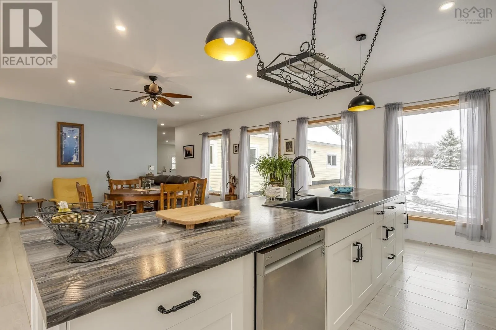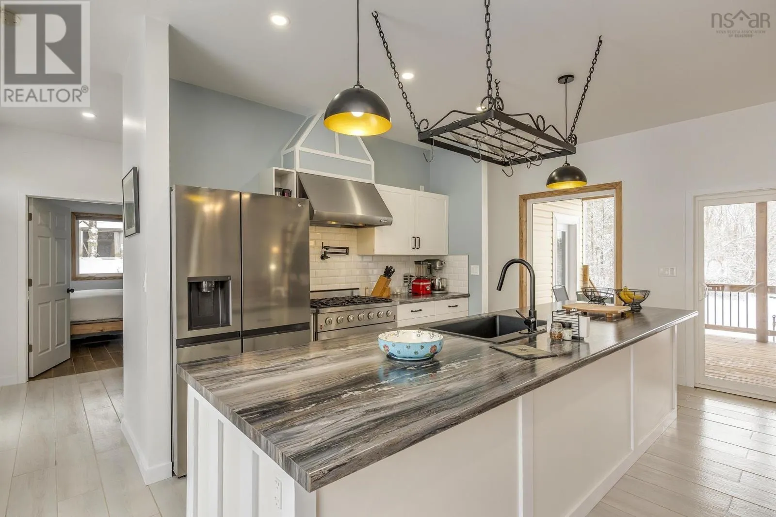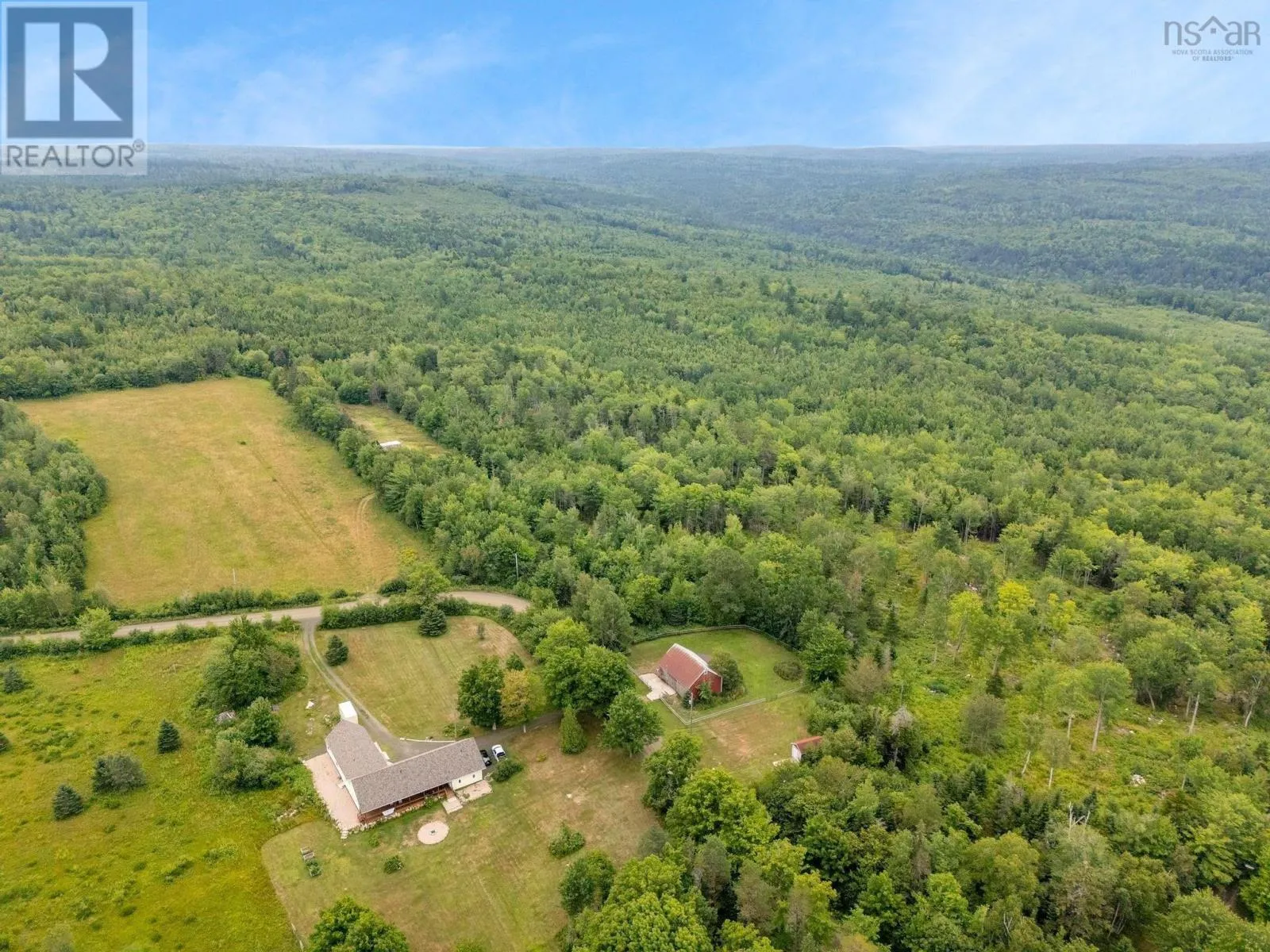 From Nictaux, travel West on HWY#201. Turn left onto Inglisville Rd. Property is on the left hand side, watch for civic/sign. *land is Once in a blue moon, a special one-of-a-kind property becomes available. Offering maximum privacy, a spacious interior with high end finishes, and 41 acres of freedom! Located in a peaceful rural setting, yet only minutes to amenities and with great services such as wired fiber-op high speed internet, garbage pickup, and on a school bus route. Only three years old, this property shows like new! The interior is flooded with natural light form the thermo-dynamic windows and multiple patio doors. 9 ceilings and an open concept design pairs will with efficient in-floor heating and quality tile flooring throughout. Enter into the front foyer, or the XL mudroom offering laundry connections, walk in closets, and a built-in home office/crafting station. The primary suite is truly stunning! Featuring a luxe ensuite with a huge marble walk in shower, dual vanity, relaxing soaker tub, and separate water closet. Two secondary bedrooms are on the opposite side of the house for added privacy and share the 3pc bath with another beautiful walk-in tile shower. Chefs kiss in the dream kitchen complete with a 6-burner propane range, walk in pantry, and 12 island! Spend your spare time relaxing on the expansive 56 covered veranda with custom wood ceiling, or cozy up by the living room fireplace and watch your favorite show. Featuring an attached 24x34 shop/garage that is wired and heated, this space will be well enjoyed by the family hobbyist or has potential for a home-based business with flexible mixed-use zoning. There is also a beautiful heritage barn on site! Measuring 35x40 with a large entry door, newly installed power meter, and full hay loft above making this a very usable and versatile space. The 14x25 back add on is home to the chicken coop and tack room, and there is a separate detached garage as well. This is the complete package, ready to live the dream! (id:27476)