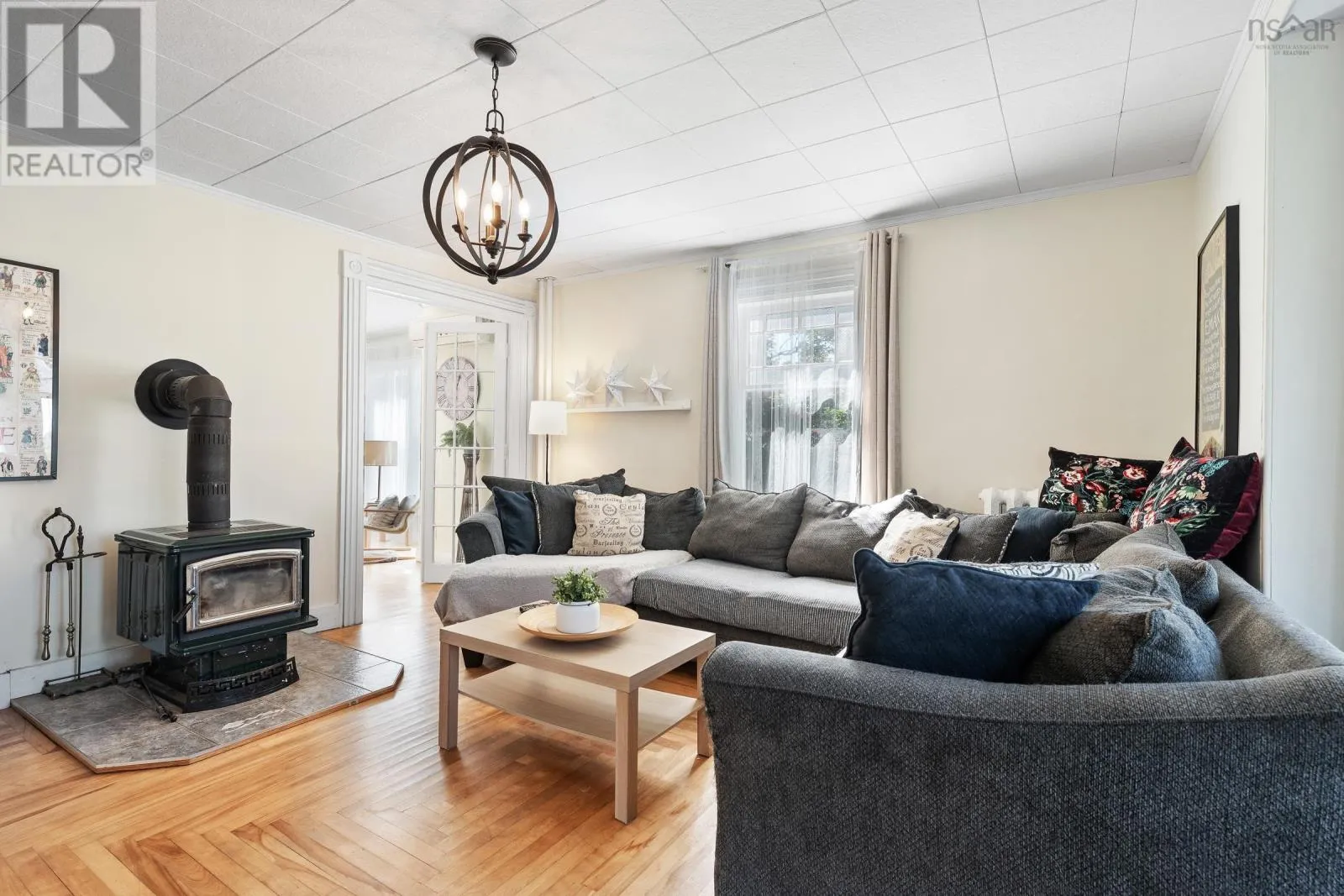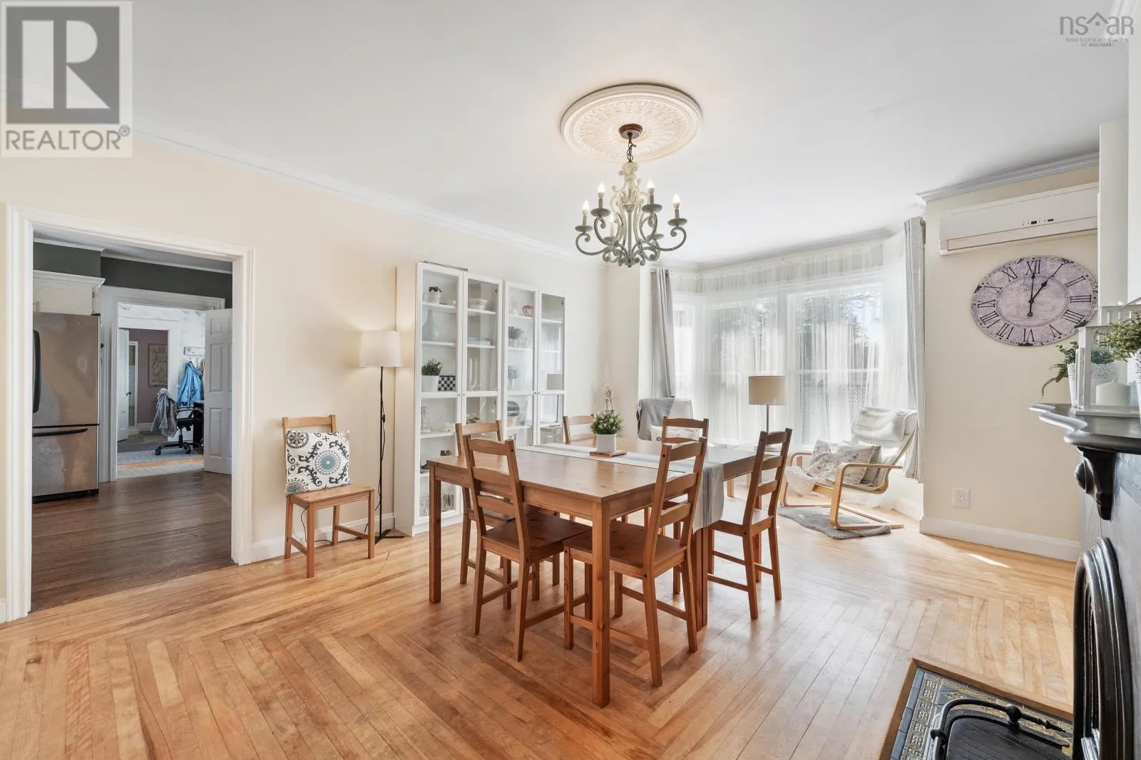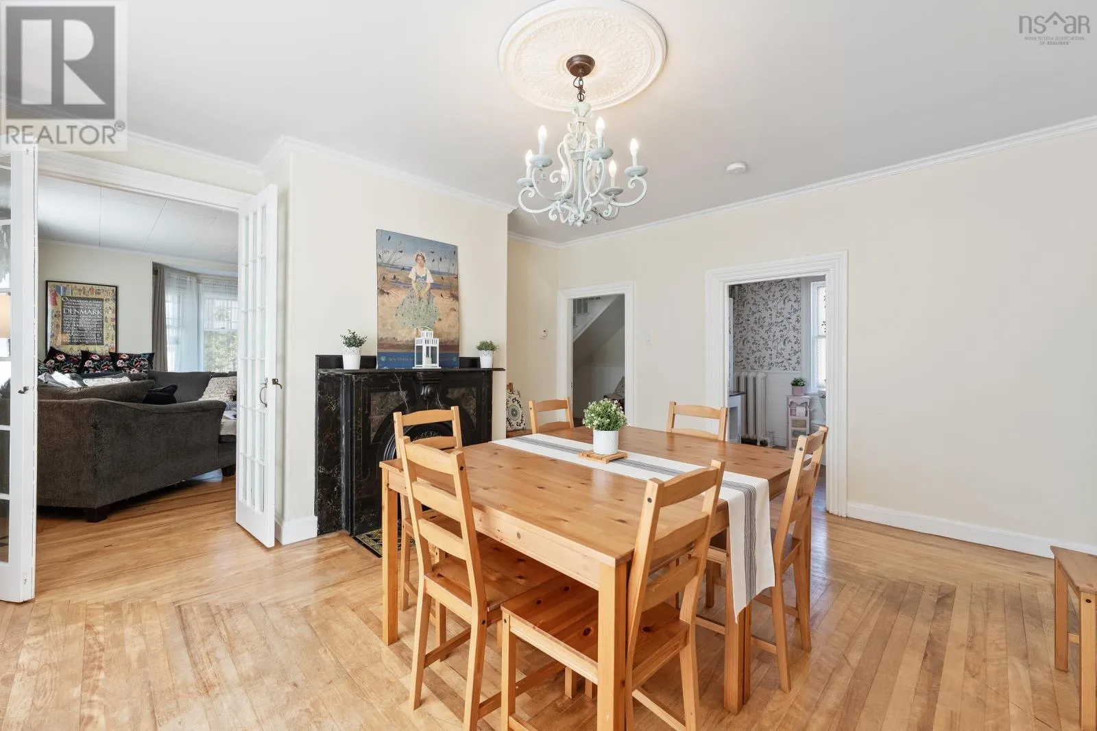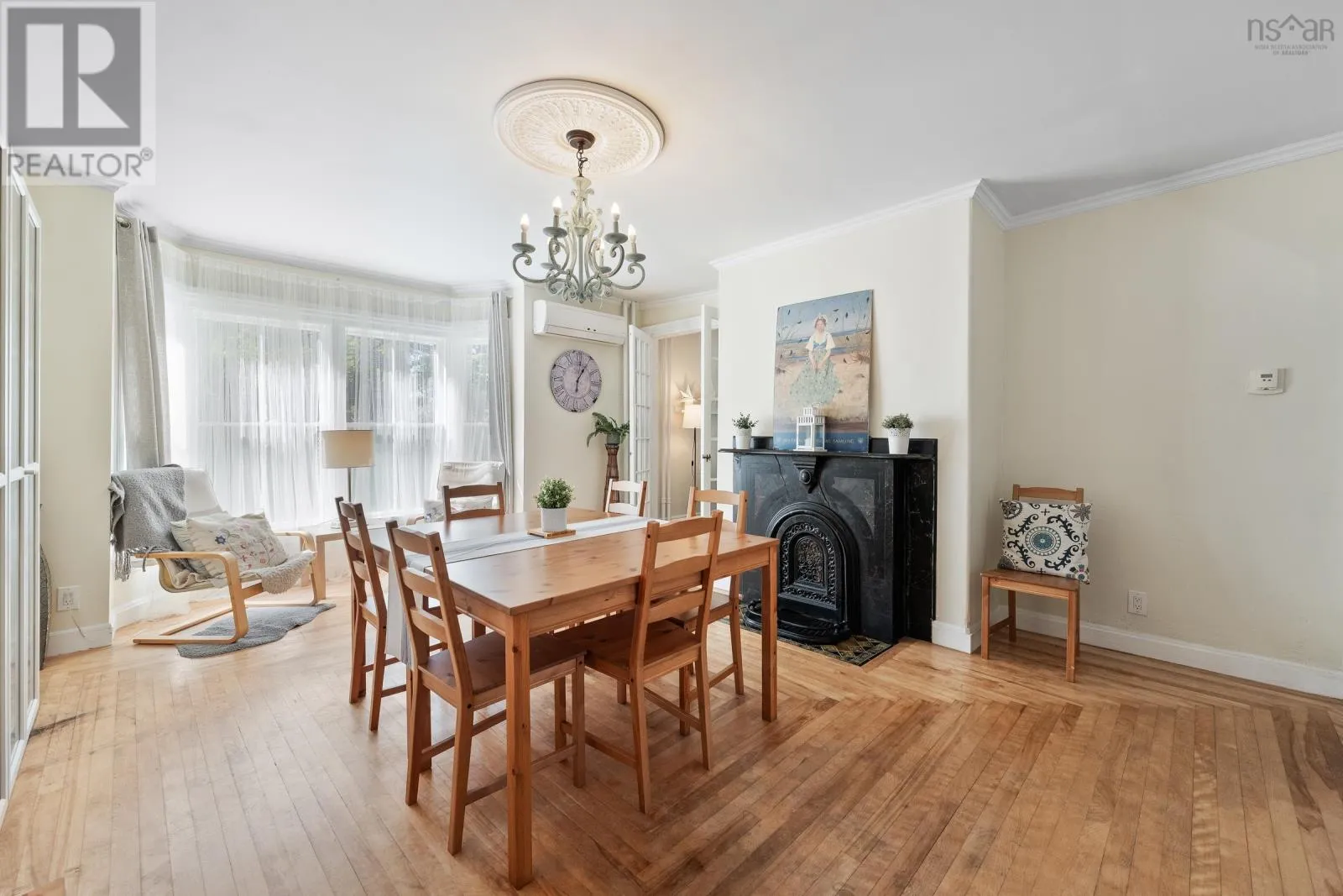 In Yarmouth, navigate to civic address 15 Brunswick Street. Signed. Step into this beautifully renovated century family home in the heart of Yarmouth, where timeless character meets modern comfort. From the moment you enter, you'll notice the graceful balance of old-world charm and thoughtful updates. The main floor features a spacious living room with tall ceilings, a sun-filled bay window facing west, and a cozy wood stove. Through elegant French doors, the formal dining room offers another bay window and classic atmosphere, with a charming 4-piece bath off to the side. The well-appointed kitchen includes stainless steel appliances, a walk-in pantry, generous cupboard and counter space, and opens into a large family room. Currently set up as a granny suite, this versatile space includes a second wood stove, an adjoining 3-piece bath, and separate laundry area with back stairs leading up to the second floor. From the main foyer, the grand staircase leads upstairs to 4 comfortable bedrooms, a smaller 5th bedroom currently used as a walk-in closet, and a stylish bathroom with a custom walk-in shower. A third-floor retreat provides a bonus living area, ideal for music, games, or a private hideaway. Outside, enjoy the covered 26' x 7' front porch with ramp access, overlooking a spacious private yard-perfect for family gatherings, play, or gardening. With its blend of character, space, and modern conveniences, this home is a rare find in center-town Yarmouth. (id:27476)
