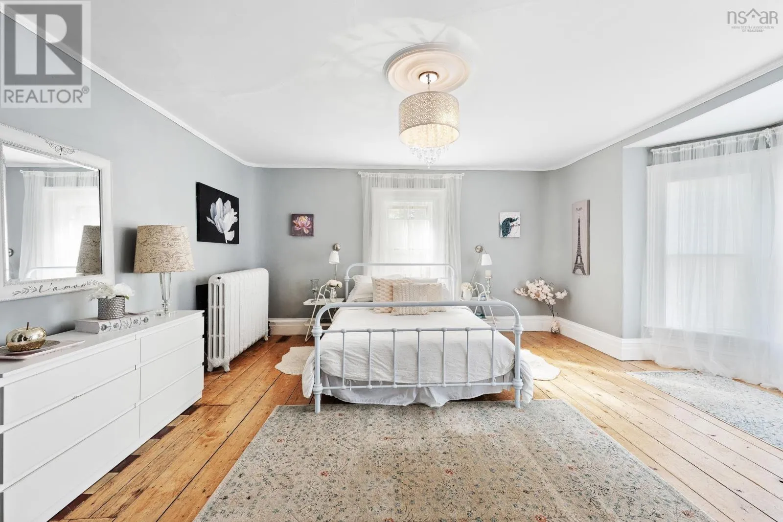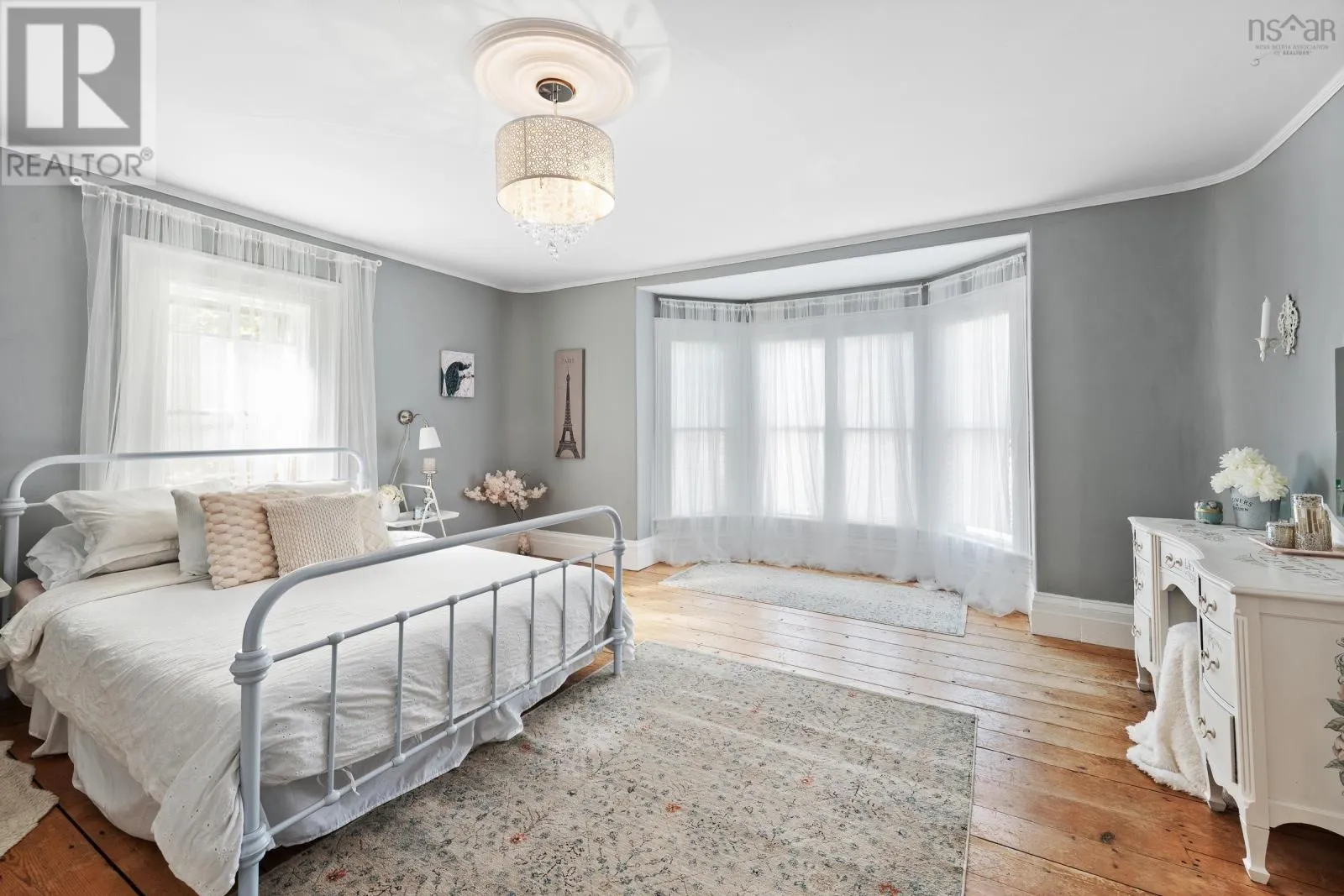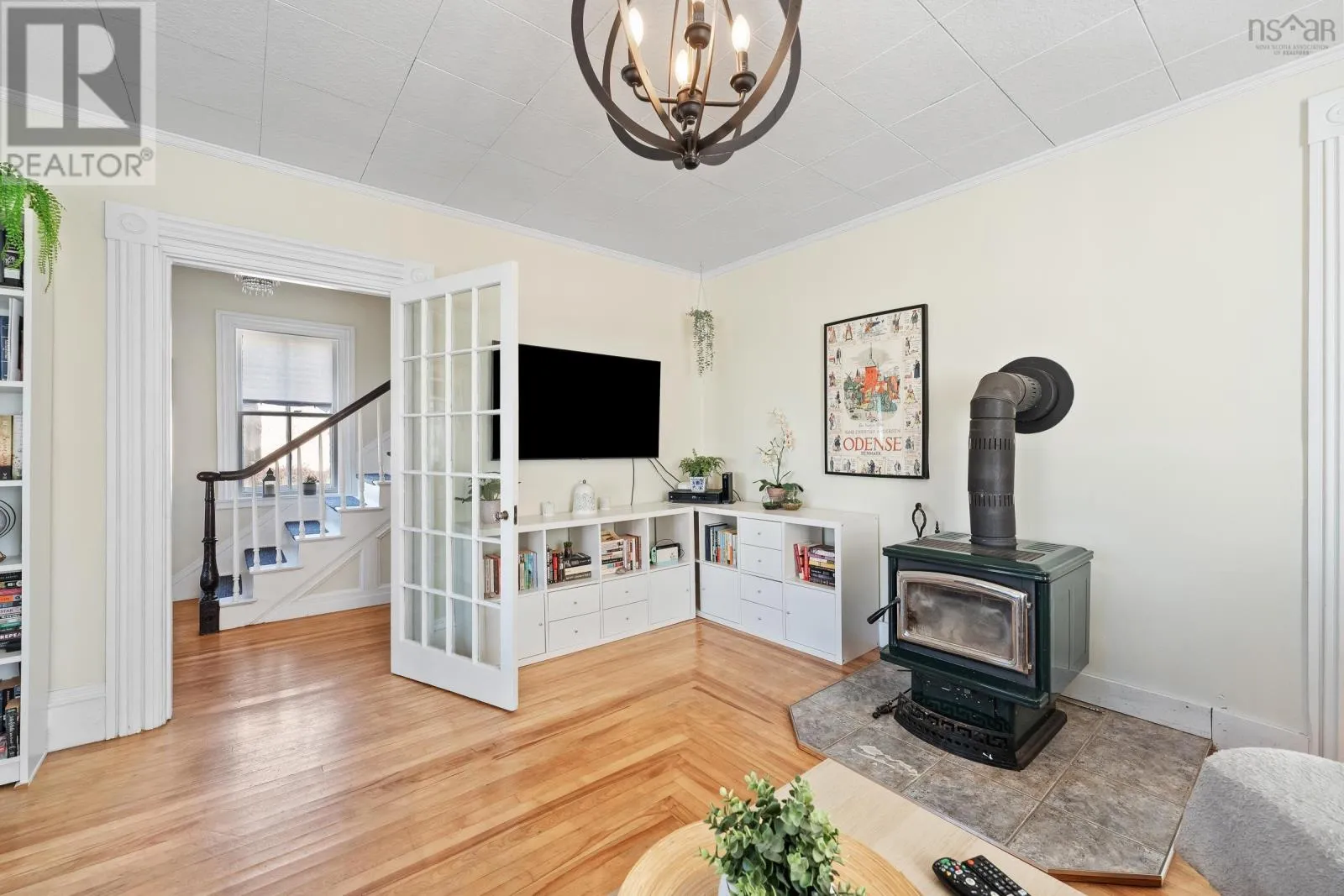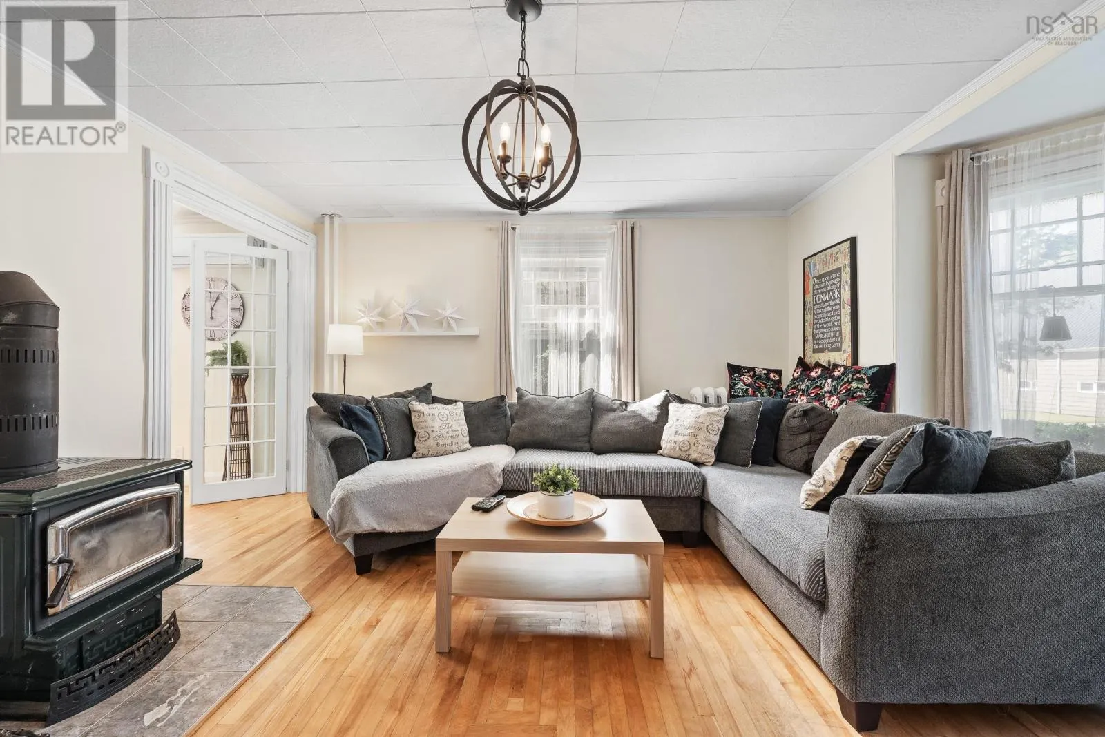 In Yarmouth, navigate to civic address 15 Brunswick Street. Signed. Step into this beautifully renovated century family home in the heart of Yarmouth, where timeless character meets modern comfort. From the moment you enter, you'll notice the graceful balance of old-world charm and thoughtful updates. The main floor features a spacious living room with tall ceilings, a sun-filled bay window facing west, and a cozy wood stove. Through elegant French doors, the formal dining room offers another bay window and classic atmosphere, with a charming 4-piece bath off to the side. The well-appointed kitchen includes stainless steel appliances, a walk-in pantry, generous cupboard and counter space, and opens into a large family room. Currently set up as a granny suite, this versatile space includes a second wood stove, an adjoining 3-piece bath, and separate laundry area with back stairs leading up to the second floor. From the main foyer, the grand staircase leads upstairs to 4 comfortable bedrooms, a smaller 5th bedroom currently used as a walk-in closet, and a stylish bathroom with a custom walk-in shower. A third-floor retreat provides a bonus living area, ideal for music, games, or a private hideaway. Outside, enjoy the covered 26' x 7' front porch with ramp access, overlooking a spacious private yard-perfect for family gatherings, play, or gardening. With its blend of character, space, and modern conveniences, this home is a rare find in center-town Yarmouth. (id:27476)