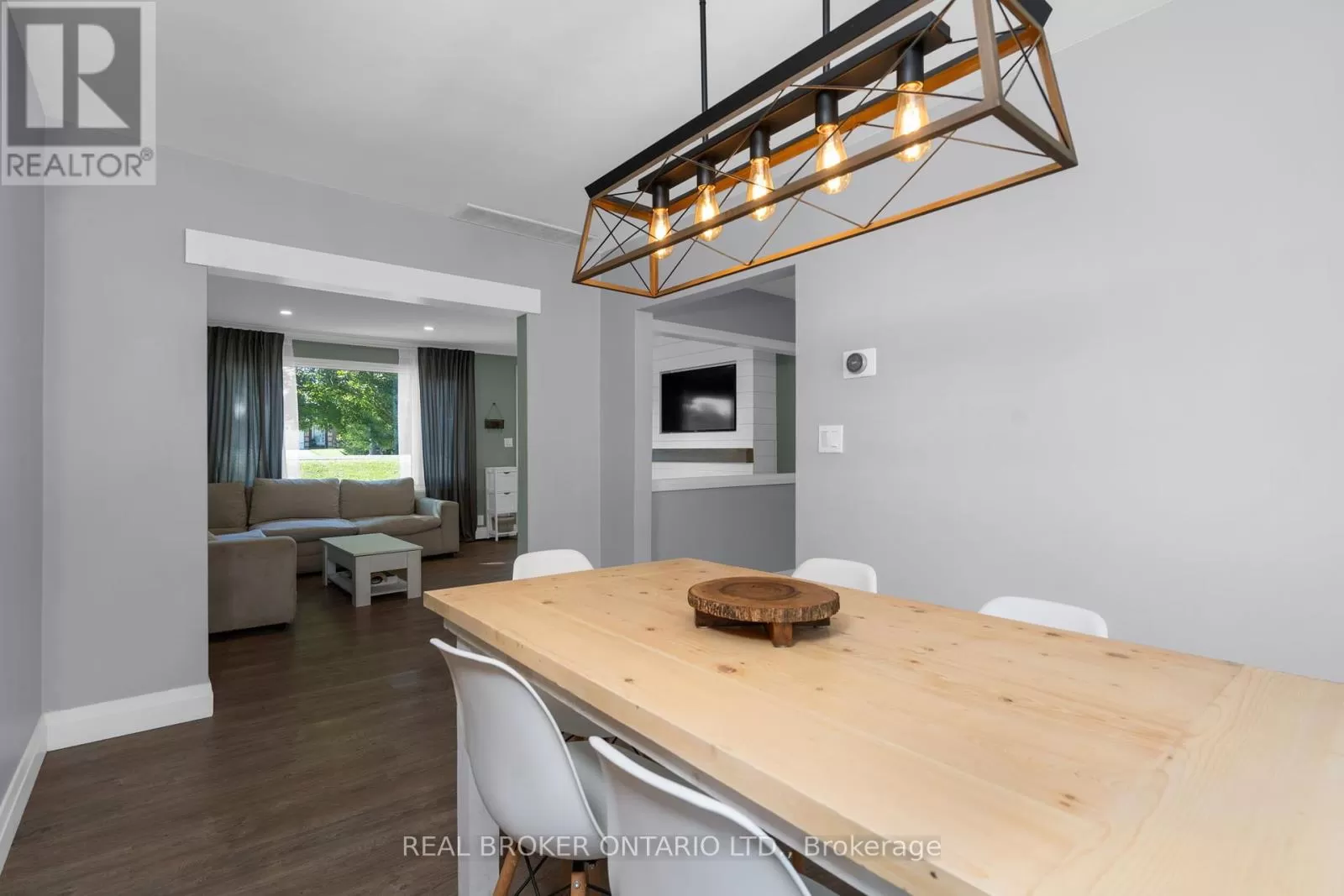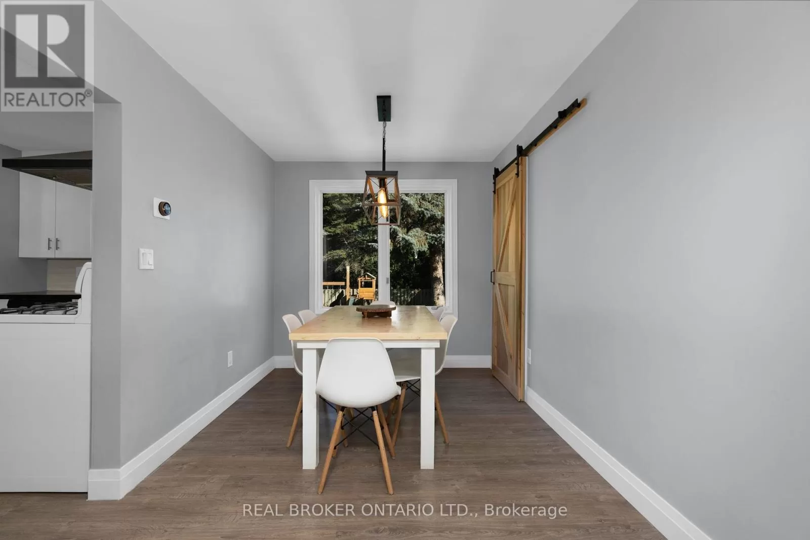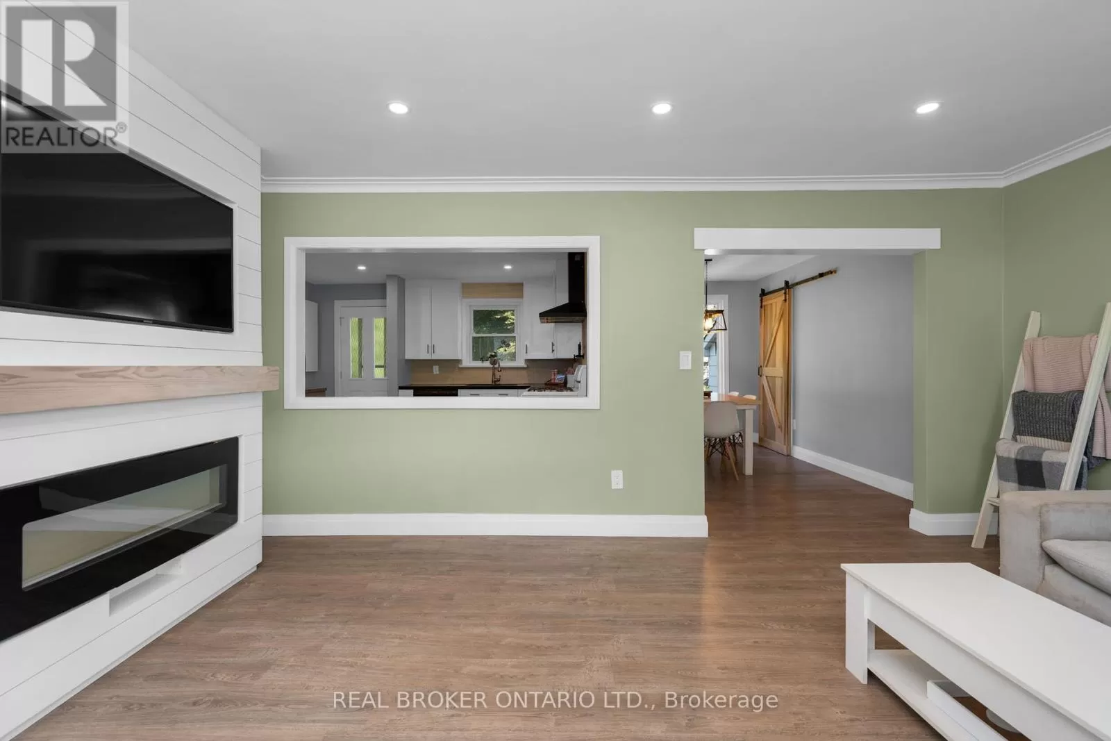 MAIN STREET EVERETT Surrounded by expensive homes this adorable ranch all brick bungalow (not garage) was renovated 2021 and has a huge usable backyard with tons of trees and privacy! With plenty of parking we start off on the right foot before even stepping inside. Then once inside you will notice all of the flat ceilings and pot lights (2021) as well as vinyl flooring and trim replaced (2021). The adorable ship lapped fireplace also has handy storage on both sides and light beams in the massive window. Open to the dining room and kitchen the flow works well and there is even a barn door to main floor laundry which also has access to the inside single car garage (which has pot lights). Onto the kitchen (refaced 2021) you will see sleek granite counters with undermounted sink, pot filler, gas stove and backsplash. Down the hall three spacious bedrooms all with the updated flooring and trim as well as one with a closet organizer and pot lights. There is also a deep linen closet and 4-piece updated bathroom. The welcoming back yard has massive deck (2023), storage shed (2022) and firepit area with string lights and built in swing. There are two cherry trees and raspberry bushes as well. The breaker panel was also updated 2021. Right on school bus route makes it easy for the kiddos, 8 minutes to Alliston, and 9 minutes to Base Borden (id:27476)