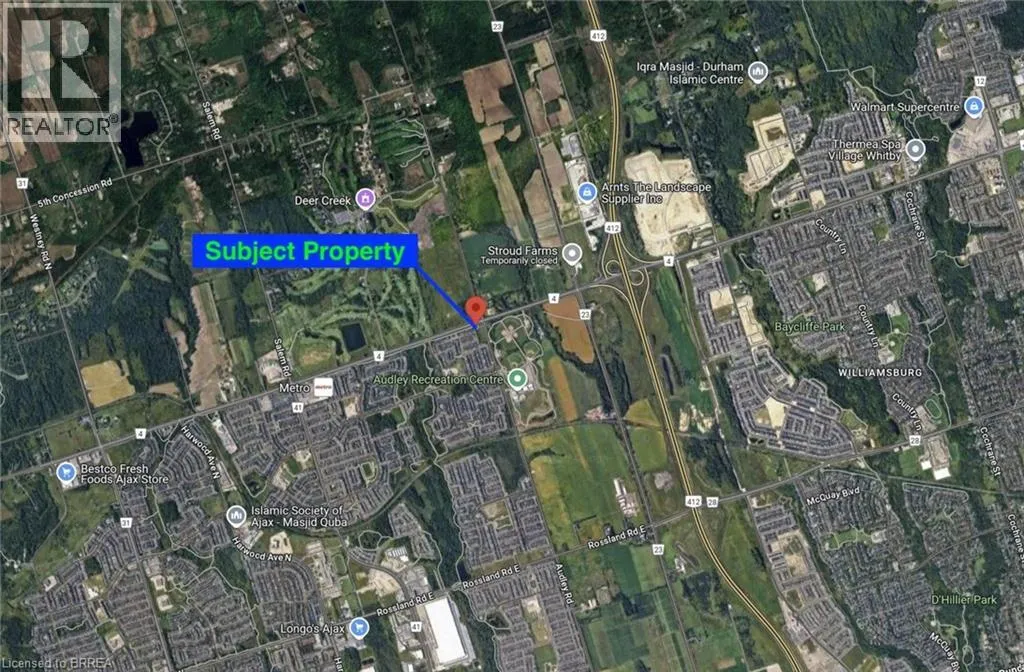 Corner of Taunton Road East and Audley Road Great opportunity to purchase a 2.3 acre development parcel with zoning in place allowing for 88 stacked townhouse units and 8 traditional row townhomes. Located in the southwest corner of Taunton Rd E & Audley Rd. Prime Ajax location, close proximity to Highways 412, 401 and 407. Easy access to transit, near Deer Creek Golf Course, rec center, great local area amenities and huge residential development nearby. Property sold under Power of Sale on an 'as is, where is' basis, land value only. Comprehensive deliverable package available with signed confidentiality agreement. (id:27476)