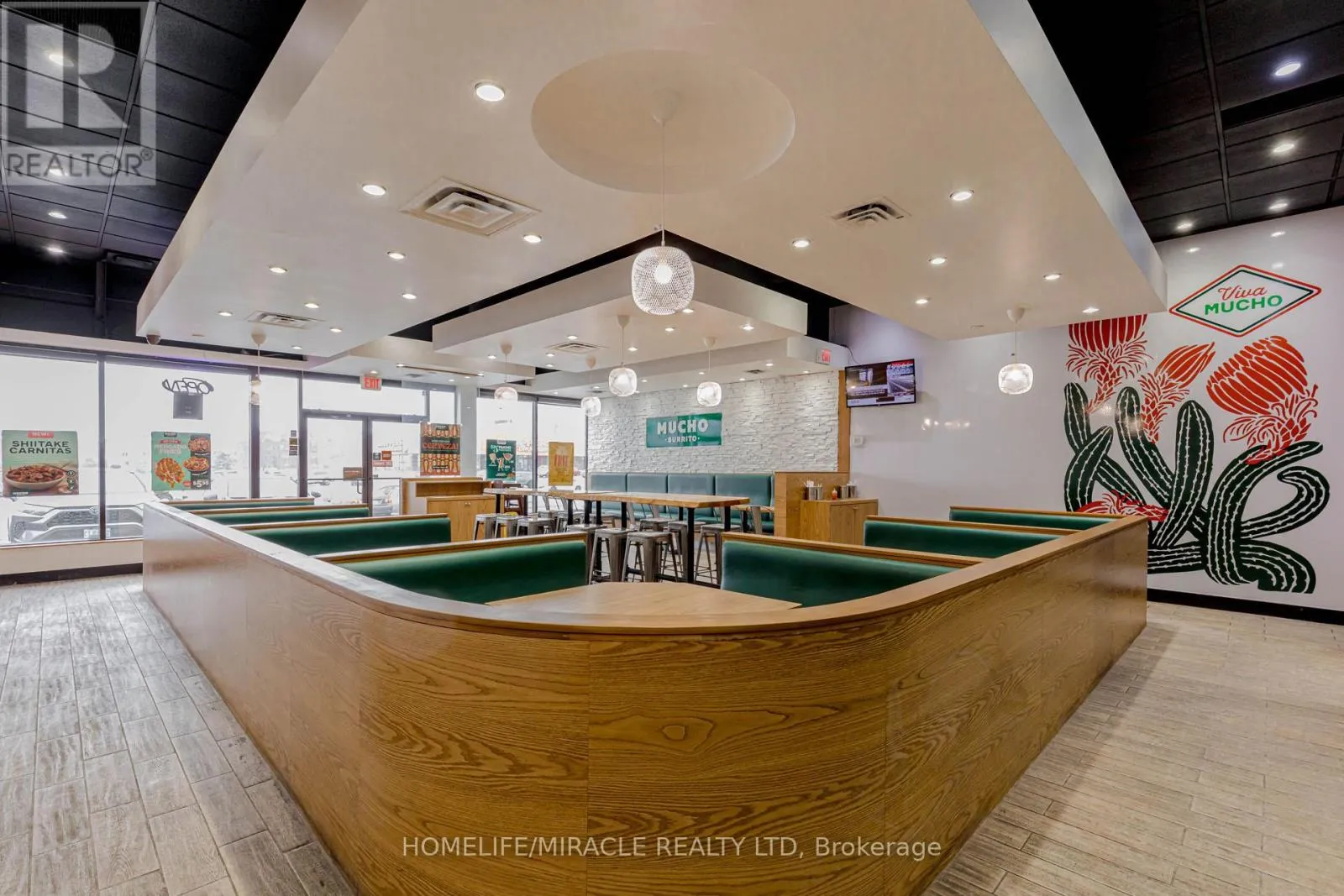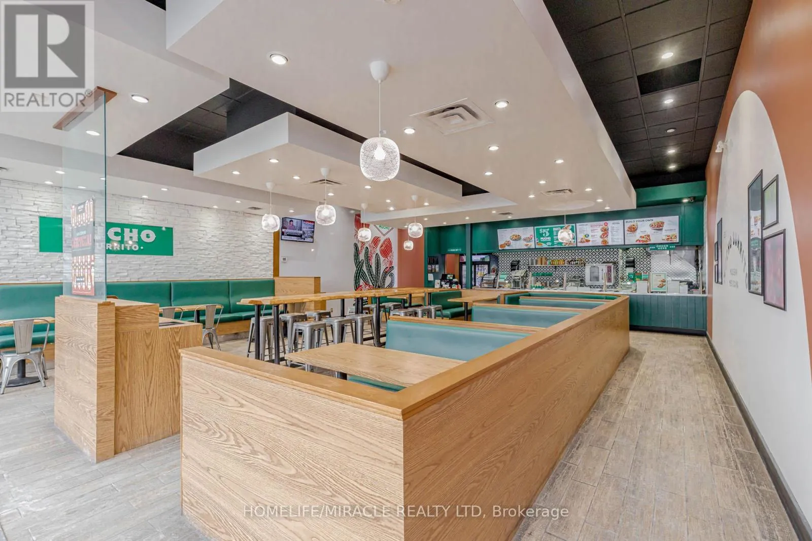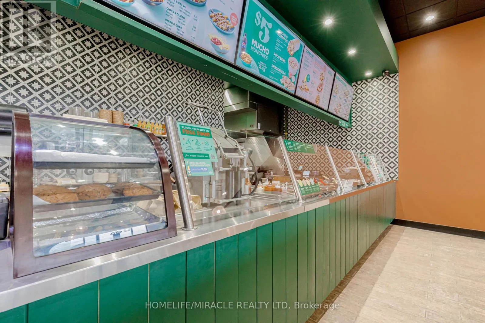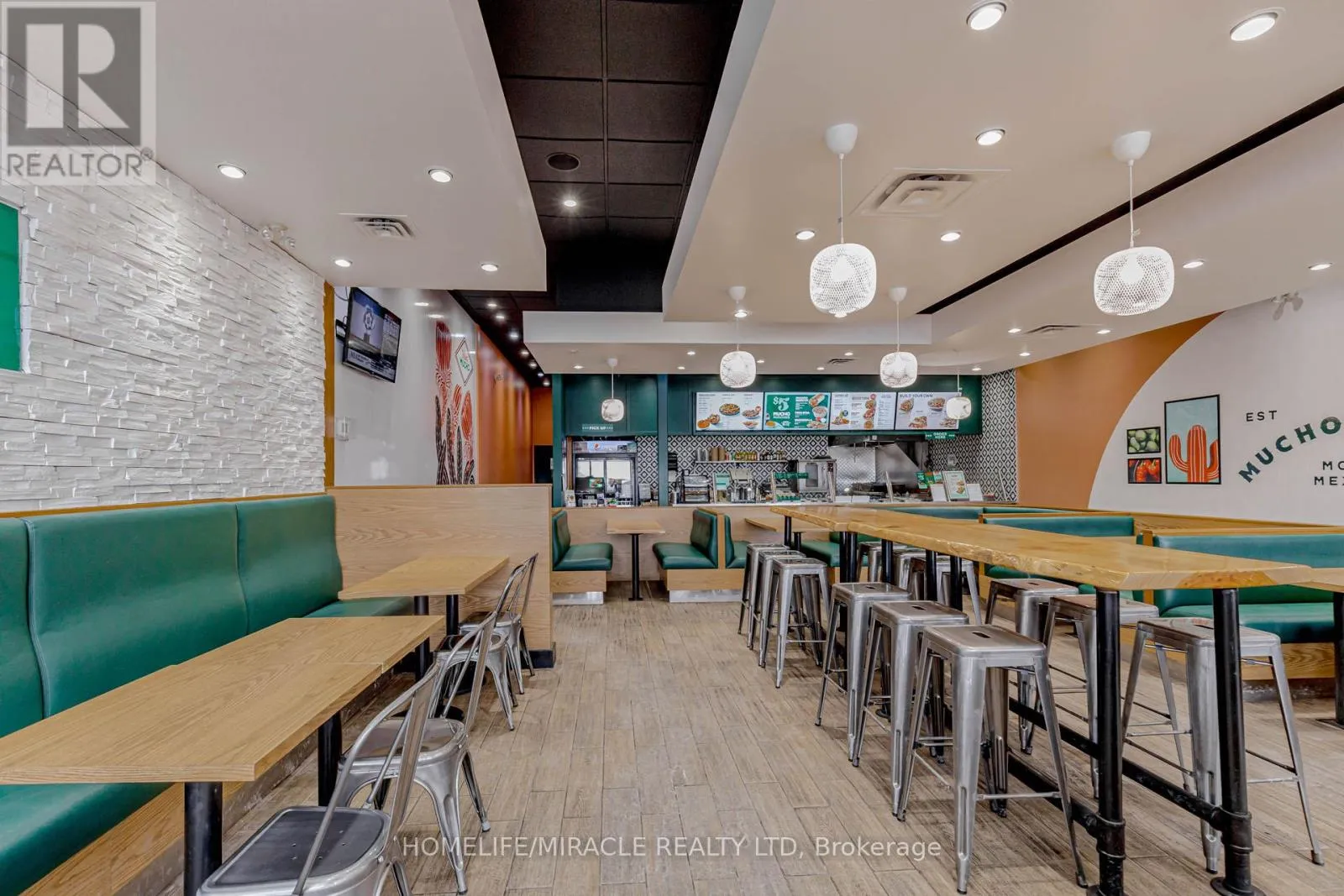 Cross Streets: Harwood Ave / Bayly St. ** Directions: Take Right From Harwood Ave. MUCHO BURRITO Business in Ajax, ON is For Sale. Located at the busy intersection of Bayly St W / Harwood Ave S, Surrounded by fully residential neighbourhoods. Close to schools, highways, offices, banks, and major big-box stores. Operating since 2014 with strong sales and growth potential. Avg. Monthly Sales: $53,650, Rent: $8721.71/m incl. TMI. Lease Term: Existing till May 2026 + 5 + 5 years option to renew, Royalty: 6%, Advertising: 4%, 68 seating with Turnkey operation. This store has been FULLY Renovated as per Franchisor requirements in Sept 2024 (id:27476)