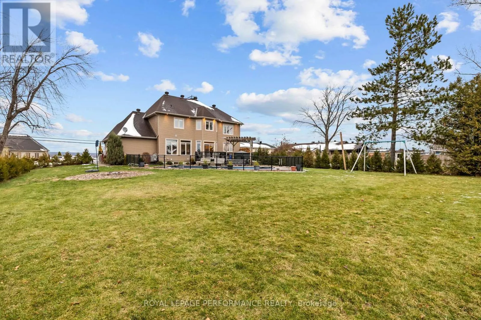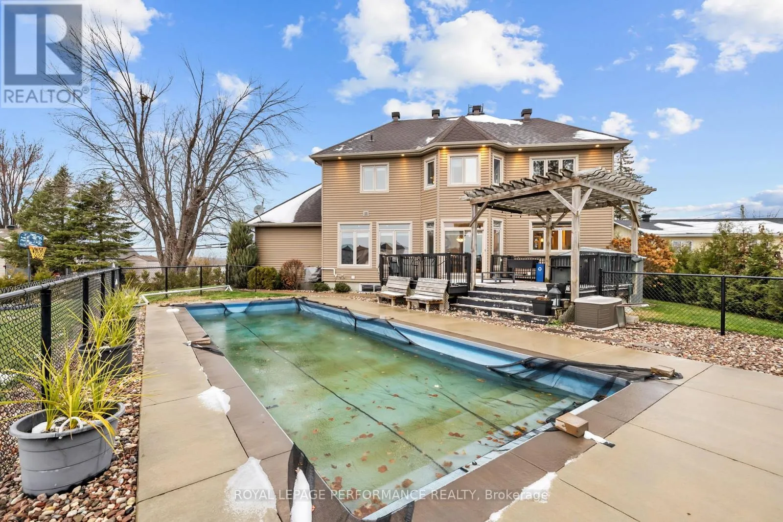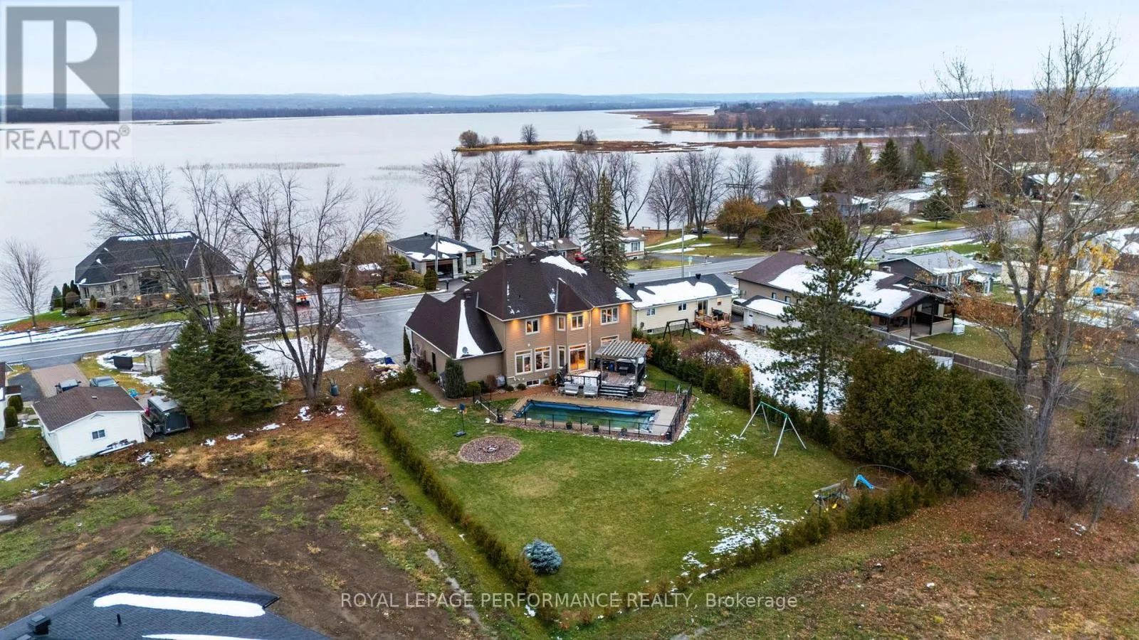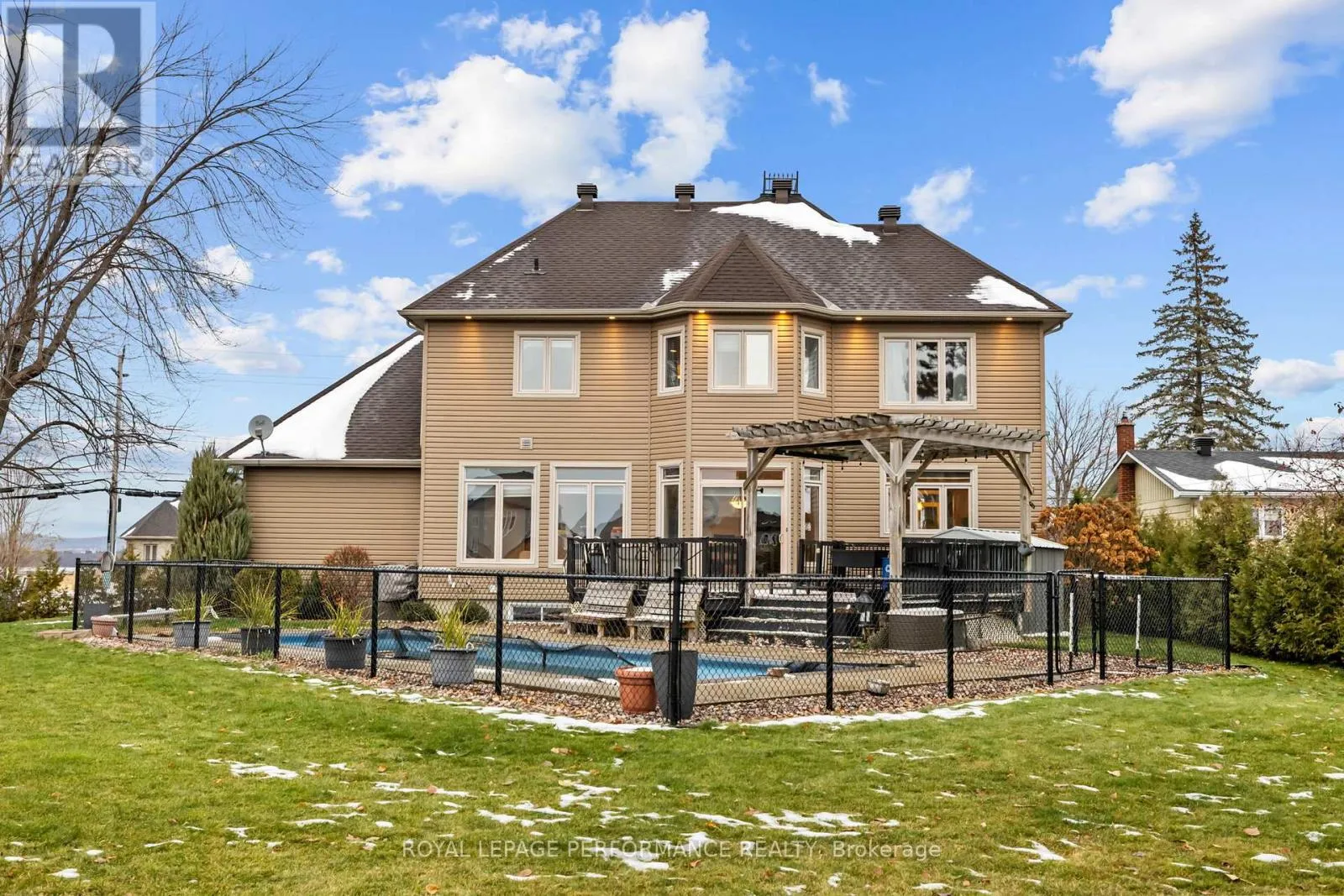 Cross Streets: Principale St/County Rd 17. ** Directions: From Hwy 174, take the exit toward Wendover and turn right onto County Rd 17. Continue straight into Wendover, then turn left onto Principale St. Welcome to this stunning 4-bedroom, 3-bathroom home offering over 3,200 sq/ft of refined living space, set on a one-of-a-kind lot fronting onto breathtaking sunset views over the river. Featuring 9 ft ceilings throughout and soaring vaulted ceilings up to 14 ft, this home blends grand architecture with warm, timeless finishes. A spacious foyer opens into an inviting living room highlighted by a striking stone fireplace extending to the ceiling. The dream kitchen boasts granite countertops, ample cabinetry, and direct access to the outdoors-perfect for entertaining. Enjoy two dining areas: a bright breakfast/dining nook with patio access, plus a formal dining room featuring charming columns. A versatile room adds flexibility for a home office, playroom, or quiet retreat overlooking your backyard oasis. The ideal family layout continues upstairs with four generous bedrooms. The primary suite includes a luxurious 5-piece ensuite & makeup vanity, and a large walk-in closet. Three additional well-sized bedrooms and a full bath complete this level. The partially finished lower level offers incredible potential, complete with a rough-in for an additional bathroom-ready to customize. Your private backyard features a 33' x 12' heated saltwater pool, pergola, interlock patio, firepit area, storage shed, and plenty of green space for kids to play. Hedges add privacy, while the front of the home showcases unmatched curb appeal with its grand covered porch, double-entrance oversized driveway, and extended 2-car garage. Bonus: a full volleyball court for summer fun. All municipal services, outdoor generator outlet, hardwood and tile throughout, exceptional layout, and views that make every sunset feel like home. (id:27476)
