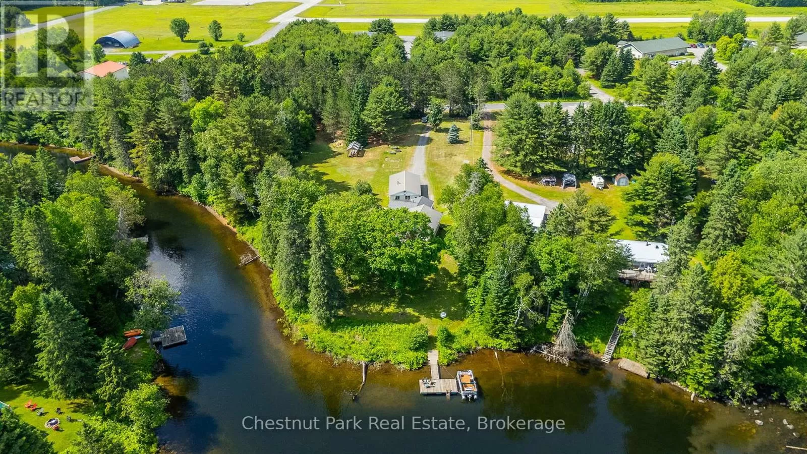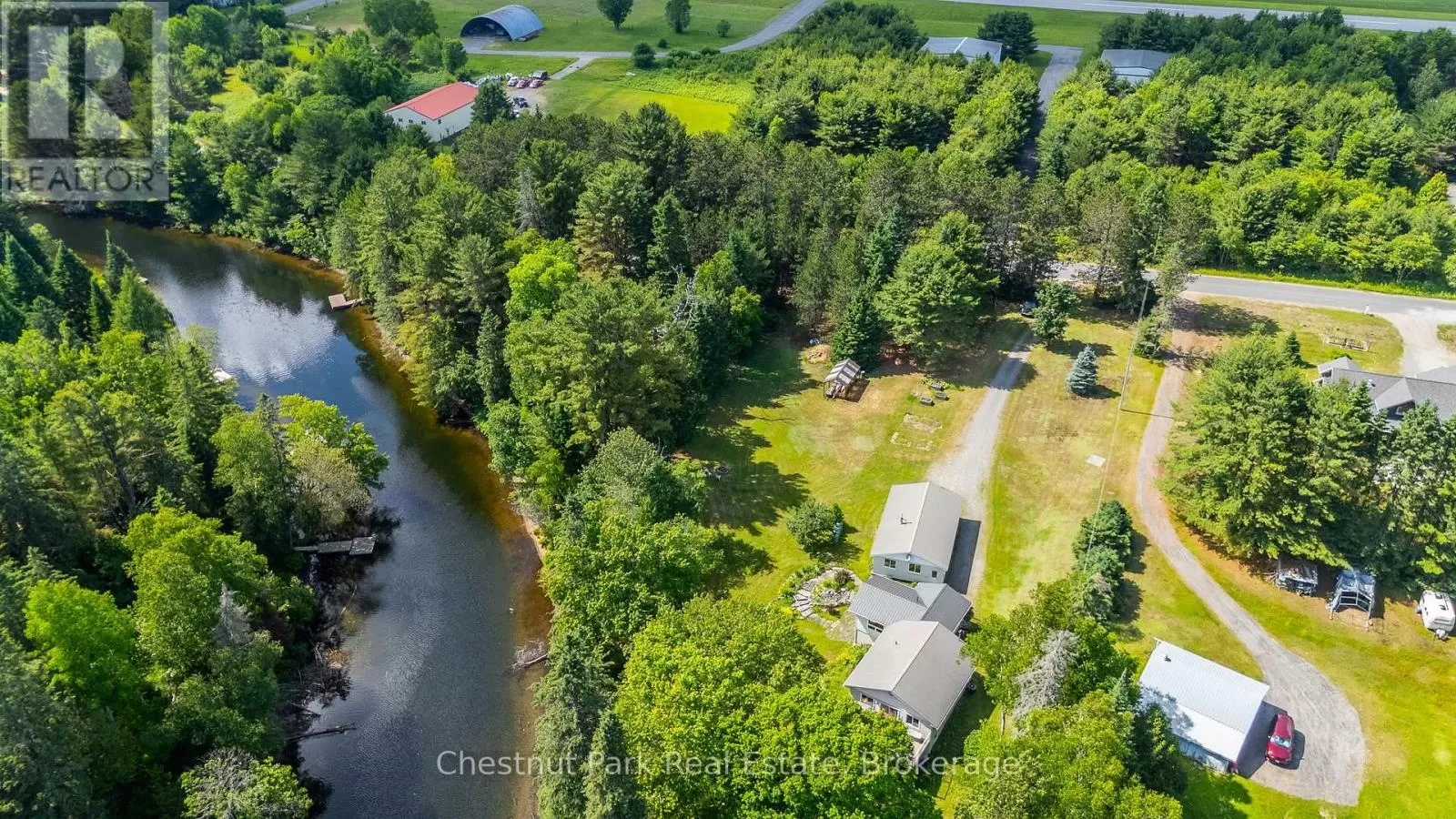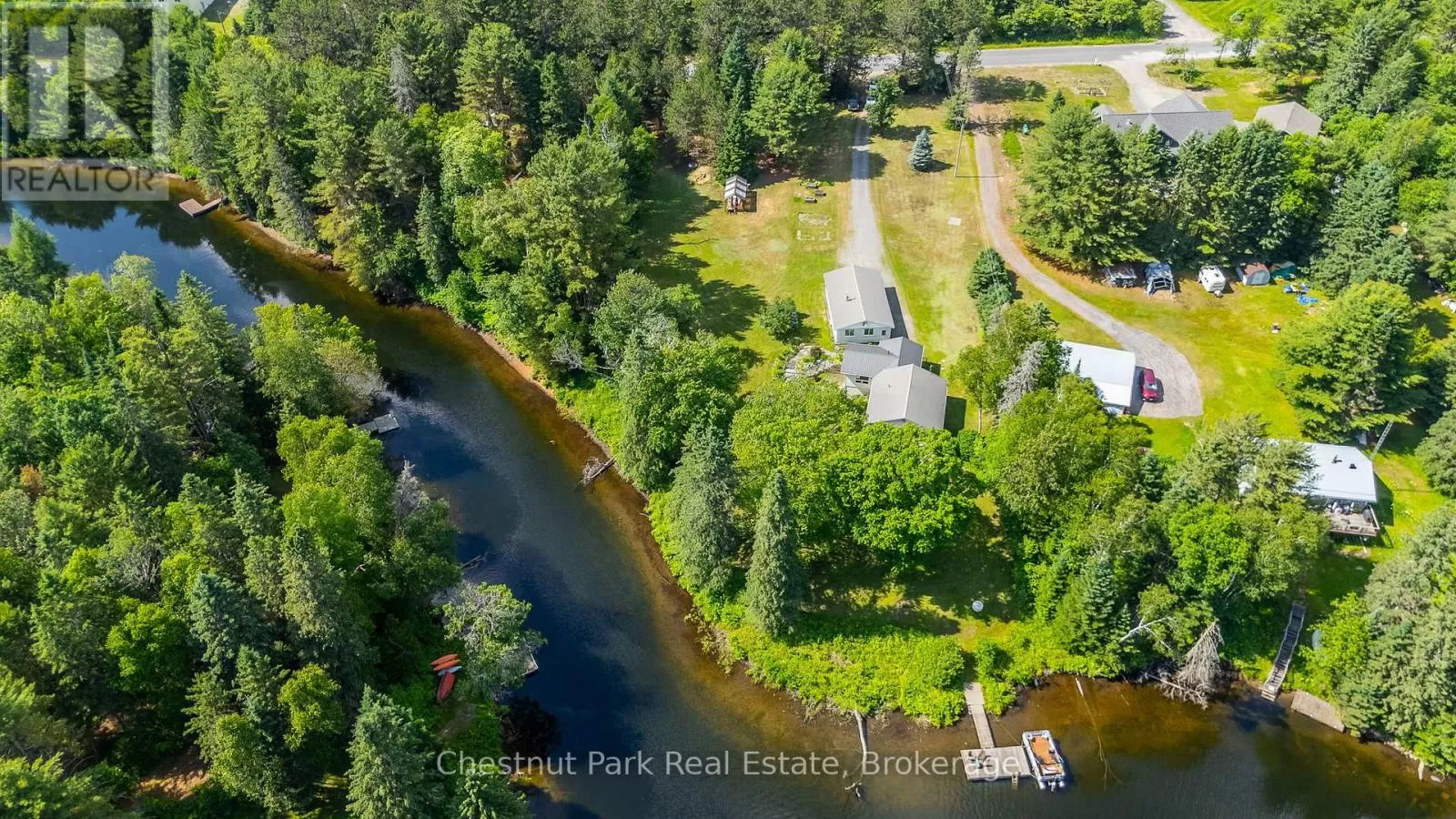 Cross Streets: Stanhope Airport Rd and Green Lk Rd. ** Directions: Hwy 118 to Stanhope Airport Road to Green Lake Road. Escape to this serene waterfront property on the Gull River, offering access to Maple, Grass, and Pine Lakes. A true haven for nature lovers and boating enthusiasts. This well-maintained total 2510 sf, 2-bedroom, 3-bathroom home is situated on a year-round municipal road and offers everything you need for comfortable four-season living. Step inside to a spacious great room featuring rich oak kitchen cabinetry, sleek black appliances, and a large central island. The open concept living and dining areas walk out to a generous deck with stunning views of the river, your private dock, and the peaceful surroundings. The main level is complete with a spacious primary bedroom, with a 2-piece ensuite and river views, a second bedroom, a modern 3-piece bath with convenient laundry facilities and a bright, welcoming foyer. Downstairs, a fully finished walk-out lower level includes a large recreation room, a 2-piece bathroom, a utility/workshop area, and a large storage room with exterior access, ideal for stowing outdoor gear or potential to be converted into extra living space! Outside, enjoy a gently sloping lot leading to the waters edge, perfect for swimming, paddling, or a leisurely boat ride to explore the interconnected lakes. Relax on the patio, soak in the tranquility, and embrace the best of country living. Additional features include forced-air propane heating (less than a year old), central air conditioning, R/O water treatment and high-speed internet. Also features a spacious 4-bay, insulated and heated garage, ideal for a year-round workshop, boat storage, and all your recreational toys. Situated in a prime location with Sir Sam's Ski & Ride & Spa, and the towns of Haliburton and Minden only a few minutes away this property is a must see! (id:27476)