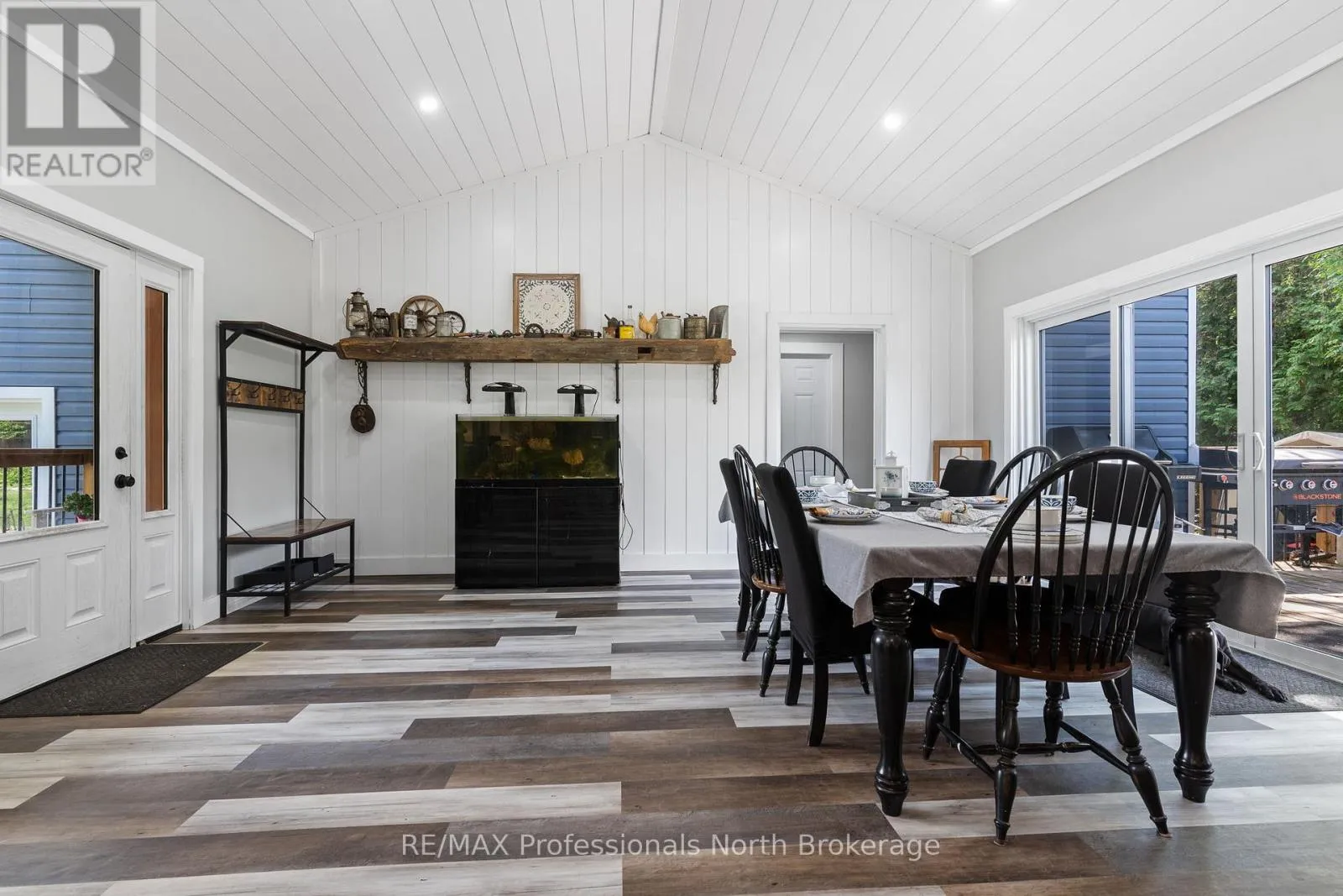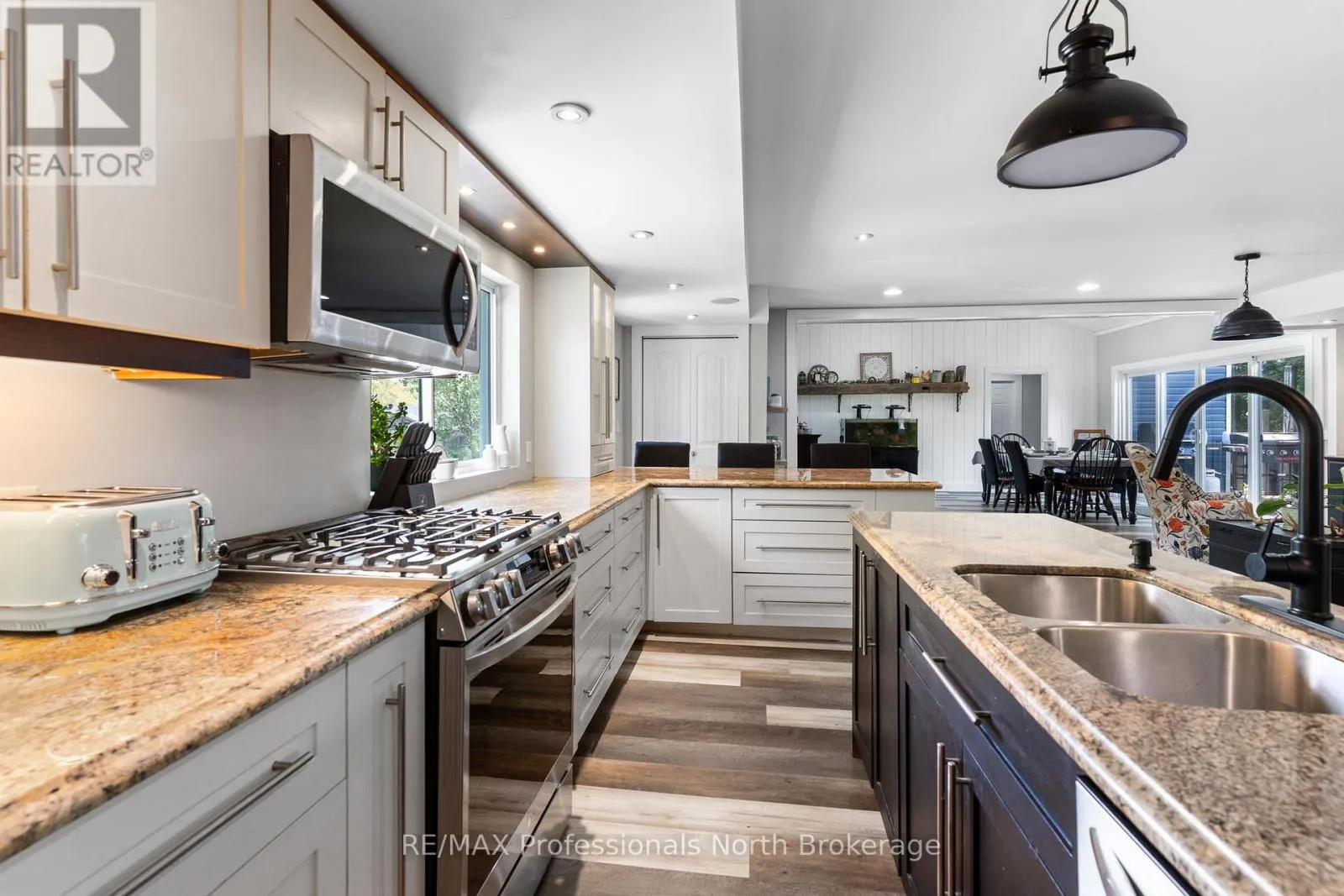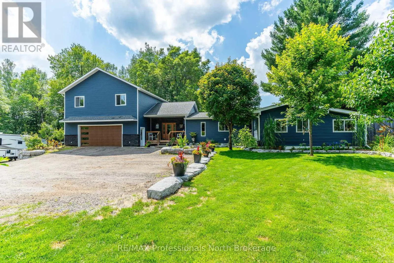 Hwy 118 to Airport Rd to All Seasons to sign Welcome to this stunning executive home located on a quiet road with shared deeded access to the Gull River! Renovated from top to bottom with a garage and loft addition, there's plenty of space for a large or extended family. The lot is beautifully landscaped with a peaceful koi pond, creating a unique park like setting. The main floor boasts an open kitchen and living space with plenty of storage cupboards, brand new 3pc bath with walk in shower, laundry room and primary bedroom. A formal dining space w/ walkout to deck creates the perfect ambience for entertaining family and friends. The upper level loft addition with two bedrooms, den, office, and family room would make the perfect living space for extended family members or a live-in caregiver. The lower level with new flooring features a rec room, guest room, office space and 4 pc bath. Enjoy fishing, swimming and kayaking from the Gull River. Easy access to West Guilford and Haliburton and all the amenities. Upgrades include full interior renovation, A/C, garage with in floor heating and full loft, siding, shingles, windows, flooring, doors, decks, landscaping, irrigation system and more! A truly exceptional offering for the whole family! (id:27476)