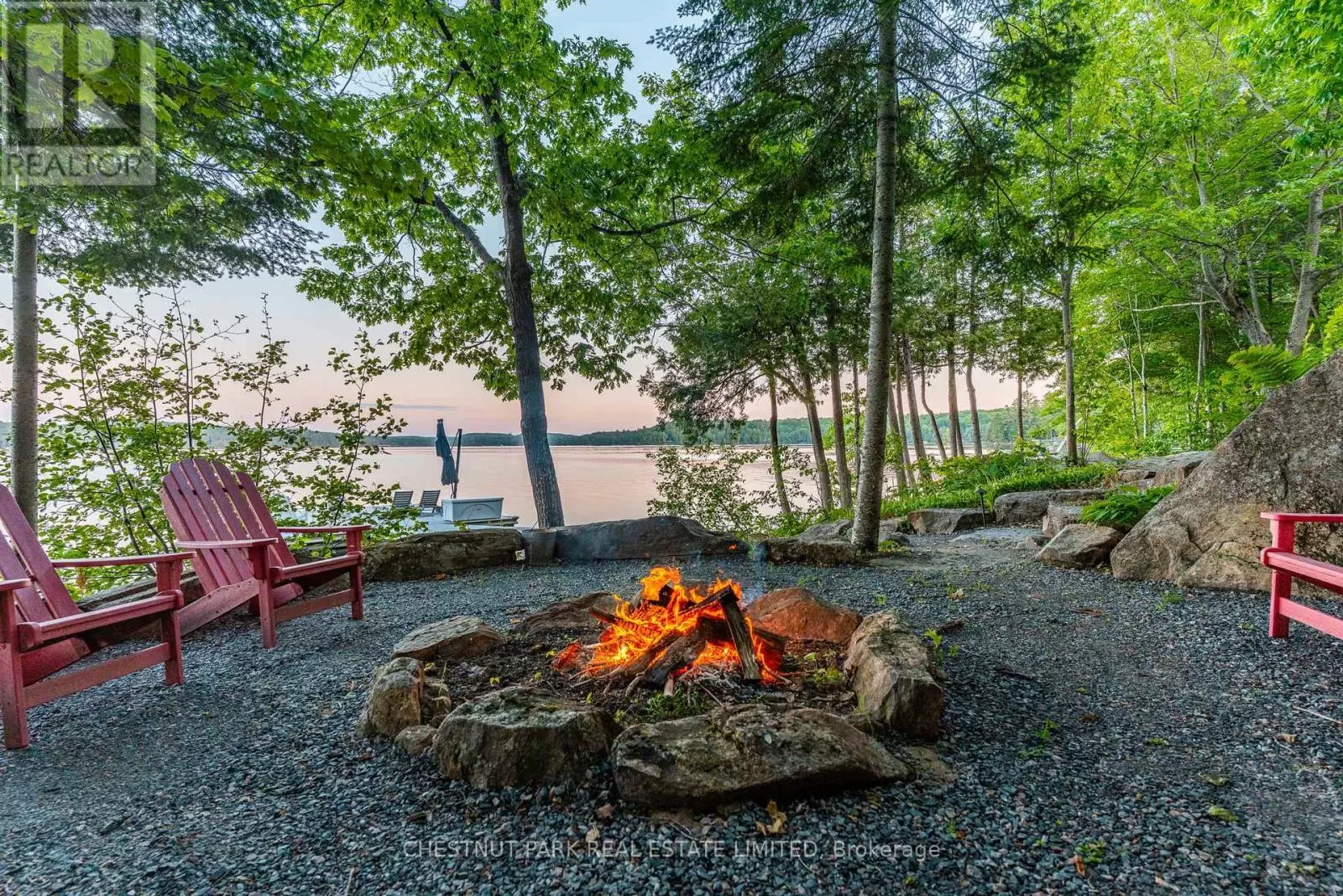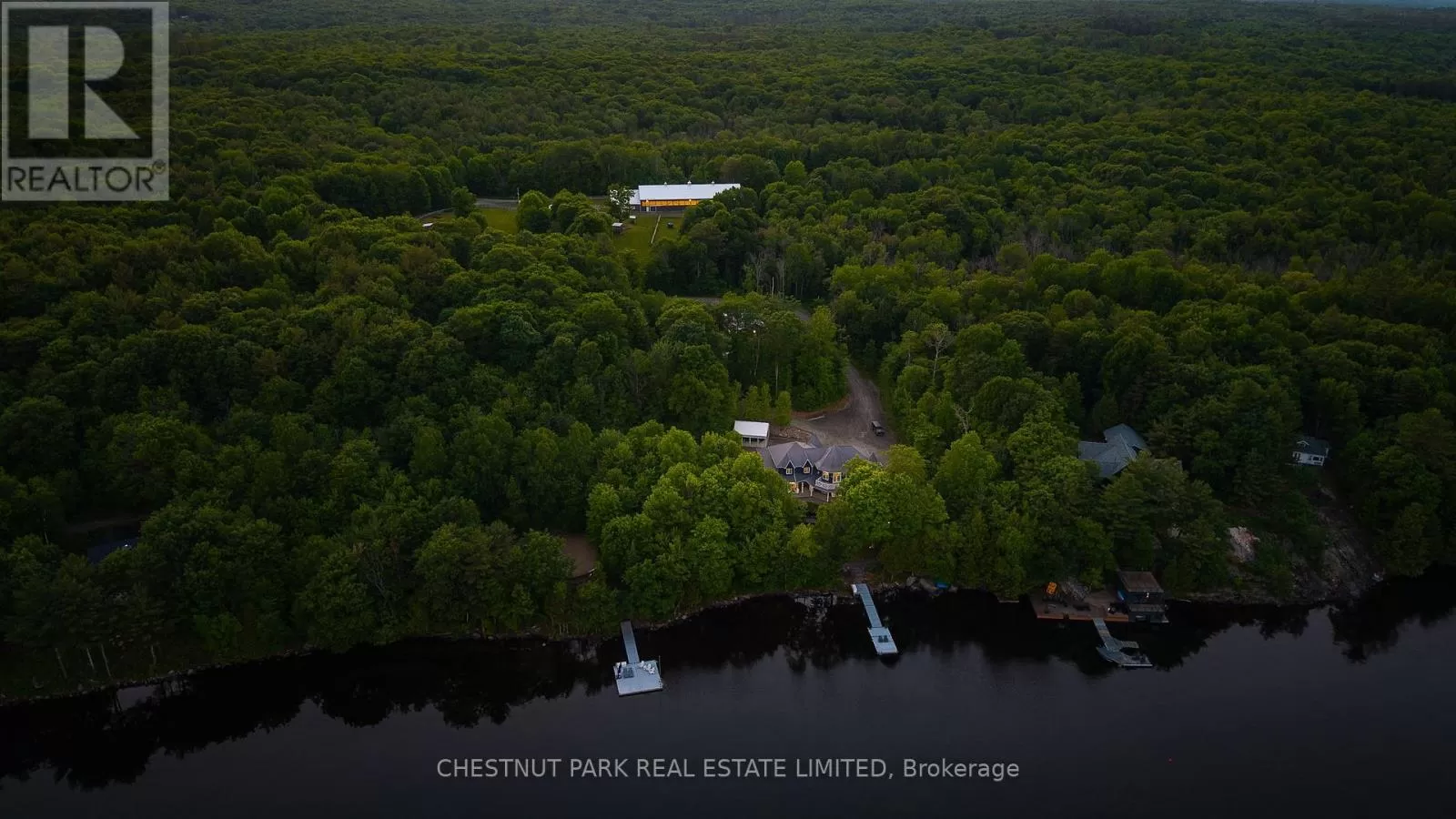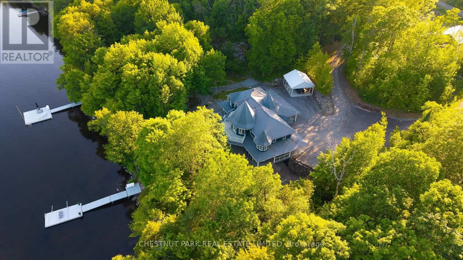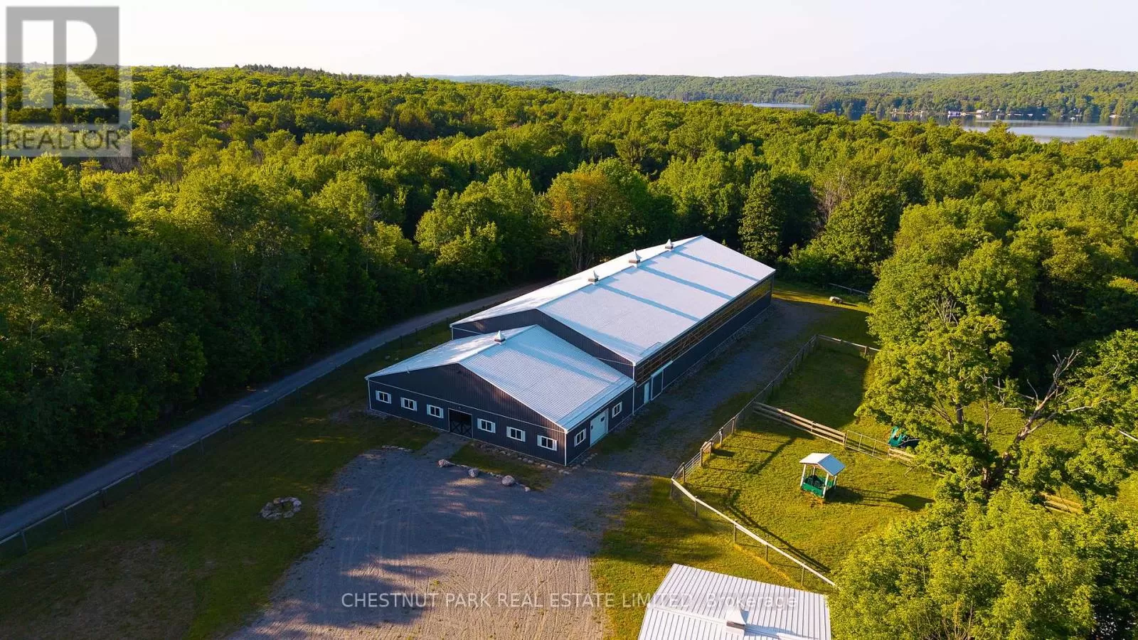 Cross Streets: Hwy 118 & Kushog Lake Road. ** Directions: Hwy 118 to Kushog Lake Road to Buckslide to Nu Ne. A once-in-a-generation offering on prestigious Boshkung Lake in the Haliburton Highlands, this private estate blends luxury waterfront living with distinguished equestrian amenities. With over 100 acres, 440 feet of deep clean shoreline, and 7000 sq ft of thoughtfully designed space, this exceptional property offers privacy, sophistication, and natural beauty. The custom home features 4 bedrooms, including a show-stopping primary suite with fireplace, soaker tub overlooking the water, an exceptional walk-in closet, and a private deck with sweeping lake views. The elegantly appointed eat-in kitchen is a true centrepiece featuring premium appliances, custom cabinetry, expansive prep surfaces, and a sunlit breakfast area perfect for casual dining. A butlers pantry adds function and flair for effortless entertaining. The kitchen opens to an expansive dining room with additional seating and a striking fireplace, ideal for memorable gatherings. Multiple living areas throughout offer spectacular water views, and walkouts lead to maintenance-free decking that extends living space outdoors. The property features several outdoor lounging, dining, recreation and entertaining areas designed to maximize lakefront serenity and privacy. A media/games room with wet bar, home gym, and generous indoor-outdoor flow enhance year-round living. For the discerning equestrian, the estate includes a 70 x 140 indoor riding arena, multiple paddocks, and well-appointed stalls, providing the infrastructure for year-round riding, training, and care. Private trails wind through the forested acreage ideal for horseback riding, hiking, or peaceful exploration. With a 4-car garage, beautifully landscaped grounds, and complete privacy, this rare waterfront estate unites refined living, outdoor recreation, and timeless elegance in one of Ontarios most coveted lakefront settings. (id:27476)