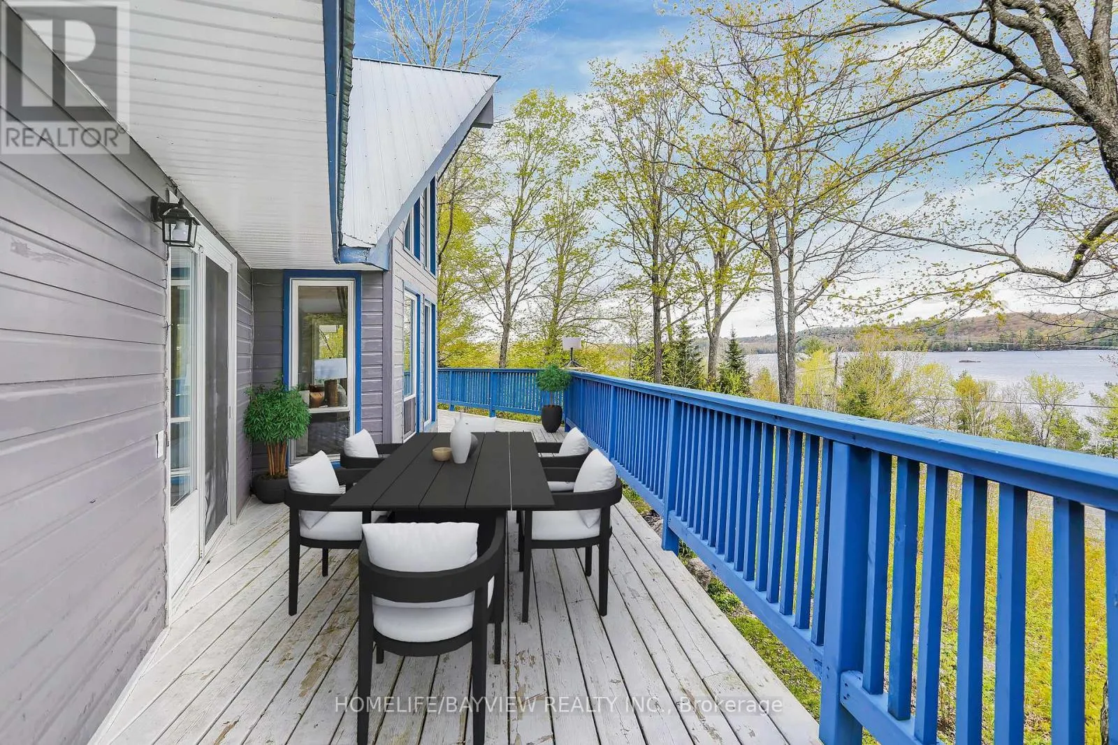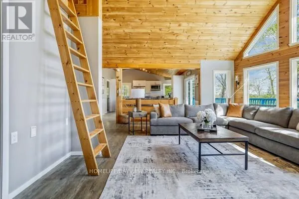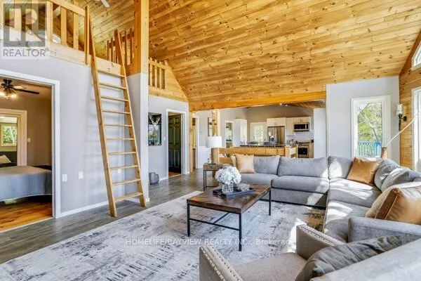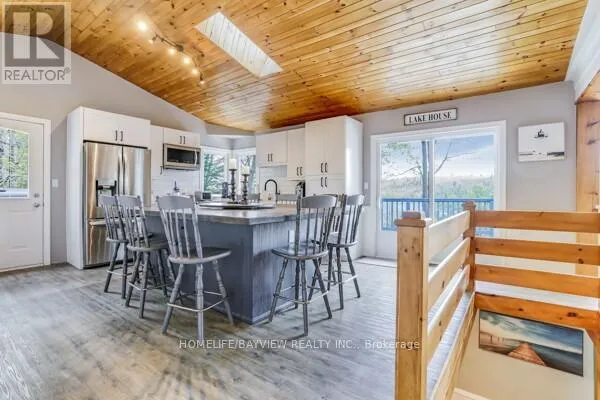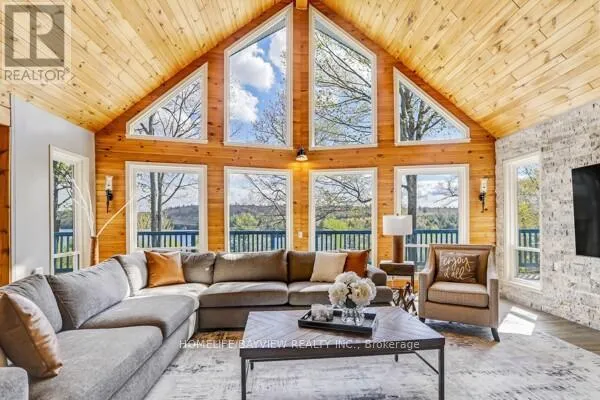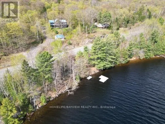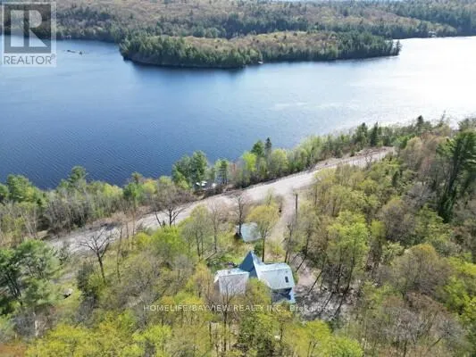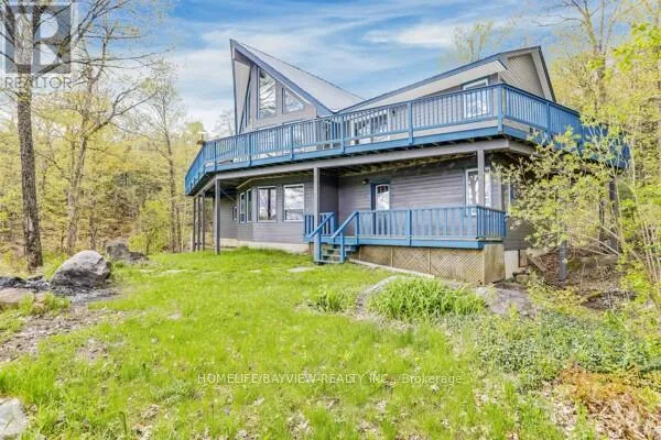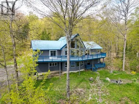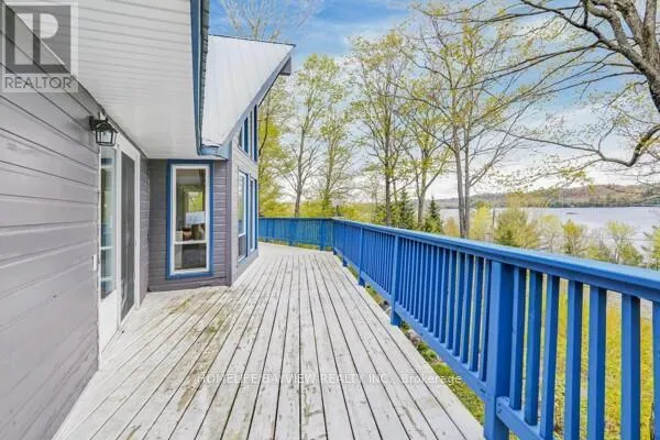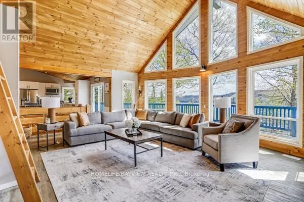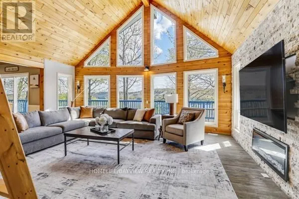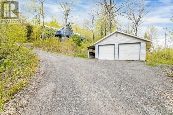 Cross Streets: Hwy 35 North Of Ox Narrows. ** Directions: google maps. Gorgeous 5 Bedroom + Loft Four Season A Frame Chalet Overlooking the Shores of Kushog Lake Nestled on 2.33 Acres in Picturesque Algonquin Highlands! Spanning approximately 3,000 sq. ft. across two levels, this inviting retreat offers private direct access to the lake, complete with a two-level deck and dock! The property showcases soaring vaulted ceilings, warm wooden accents, and rustic charm, highlighted by a new stone wall & Electric Fireplace that creates a cozy ambiance throughout. As you enter, you're welcomed by a spacious open-concept living area, boasting expansive floor-to-ceiling windows that frame magnificent views of the lake. The open-concept kitchen features a vaulted ceiling with skylights, an island perfect for gatherings, and a walkout to a wraparound deck offering stunning, unobstructed vistas of the lake and trees. This exquisite home includes five generously sized bedrooms, highlighted by a luxurious master suite with a private ensuite that features a skylight and access to a balcony to enjoy your morning coffee. Additionally, there are two more full washrooms, each beautifully appointed with modern fixtures and elegant finishes. For convenience, the property includes a spacious detached two-car garage with electricity. A separate double-car covered carport and 3rd bay provide great storage for boats/trailers. A quick stroll across the road grants you immediate access to the shores of Kushog Lake, complete with dock access. This is a fantastic opportunity for a family retreat that's both quiet and relaxing, located just minutes from Minden and Dorset, and within easy reach of ski hills, ATV, and snowmobile trails, restaurants, and shops. (id:27476)