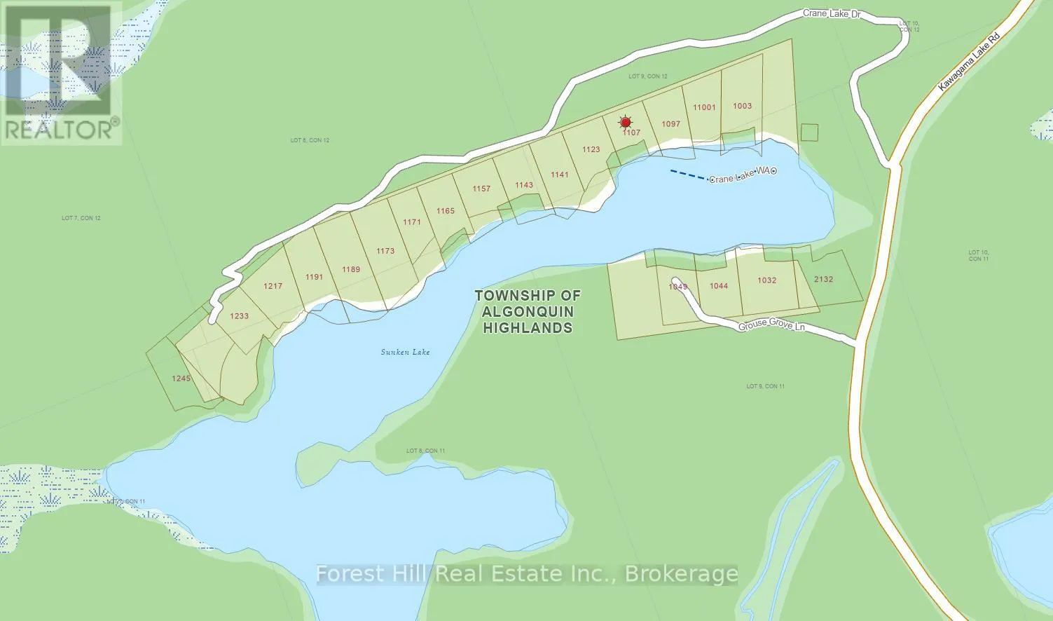 Cross Streets: Highway 35 and Kawagama Lake Road. ** Directions: Highway 35 to Kawagama Lake Road to Crane Lake Road to Fire Route #1107. Maturely treed, sloping parcel of waterfront land with 170 feet of natural shoreline, 0.82 acre, sunny south exposure and located in the heart of Algonquin Highlands with a short 3-season, privatey maintained road off a 4-season municipal road. There is an existing cabin on the property, but it is in a poor state of repair that many refer to as a TEARDOWN due to wood rot, mold, etc. There is an existing septic system on the subject property, but was never hooked up to the cabin. The Original Shore Road Allowance is owned. Given the Estate sale status of this property, all aspects of the property, septic system and deteriorated building are to be sold in an "as-is, where is" condition without any representation or warranty made by the Seller. Sunken Lake is also known as Crane Lake, which has a considerable amount of crown land wilderness along its shore and behind the waterfront properties. A vast network of trails on CROWN LAND is located close by for public enjoyment, including hiking, ATVing, snowmobiling, snowshoeing, hunting, etc. Private road access is governed by a private road committee, where annual fees are approximatekly $300. Located approximately 10 minutes from the charming town of Dorset, or 2.5 hours from Toronto. (id:27476)