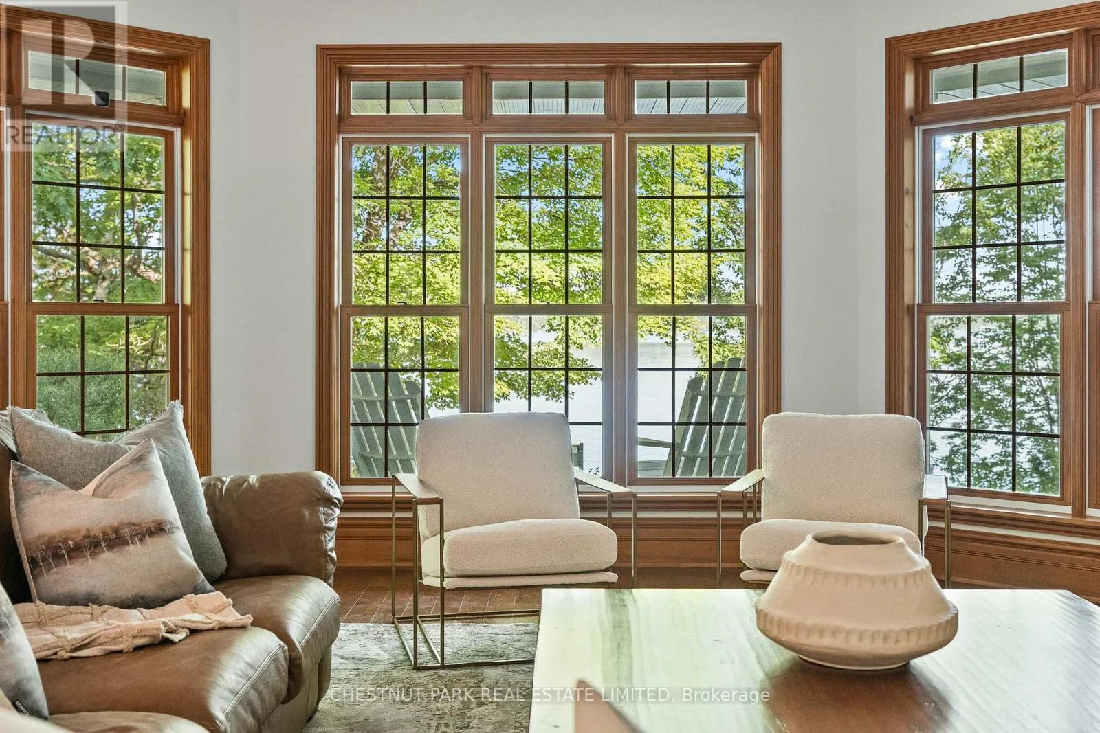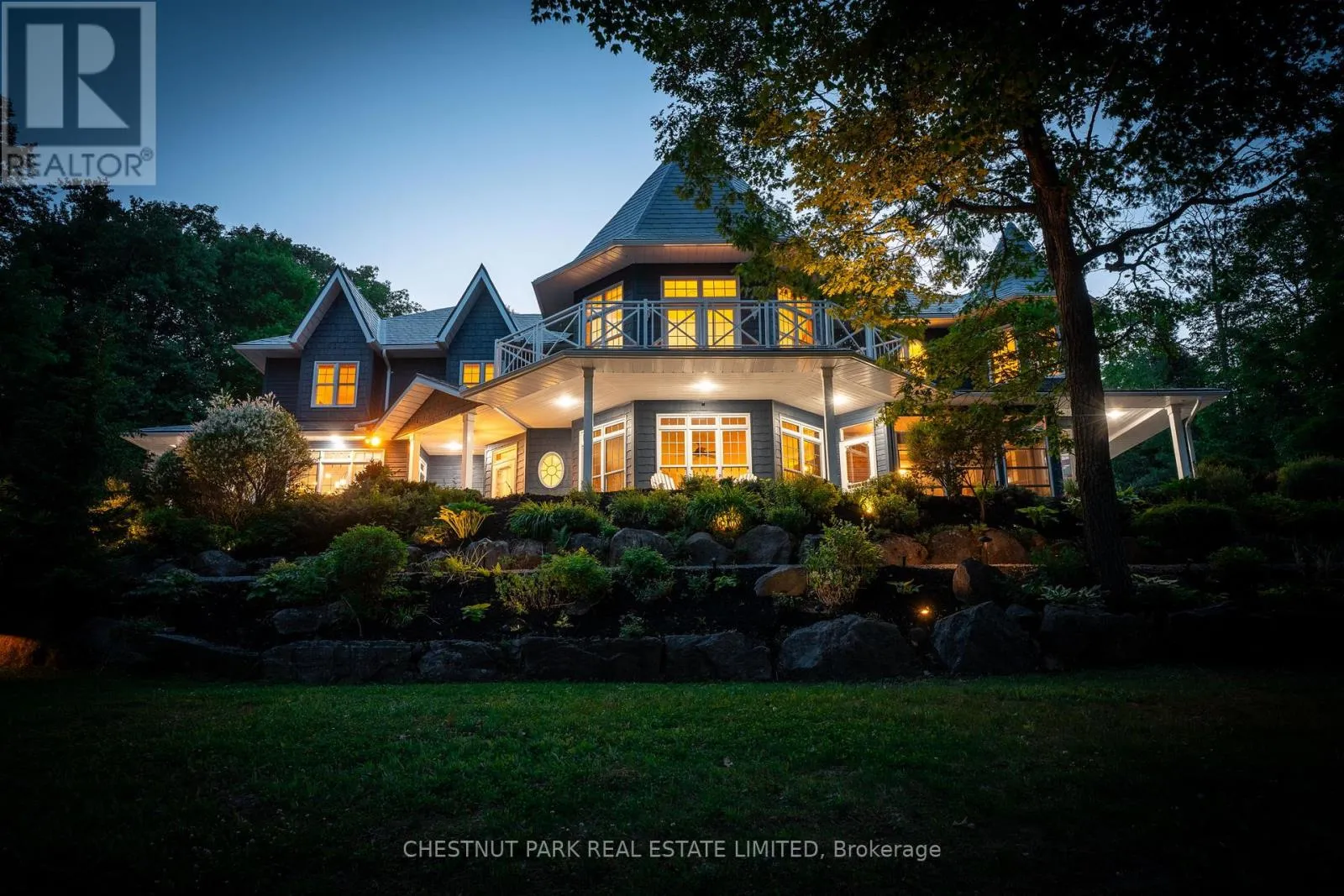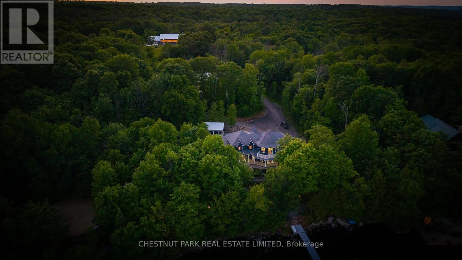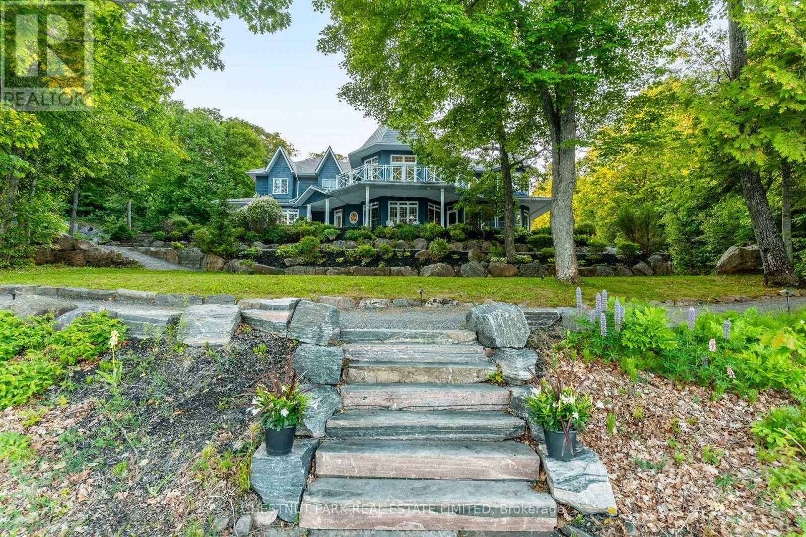 Cross Streets: Hwy 118 & Kushog Lake Road. ** Directions: Hwy 118 to Kushog Lake Rd to Buckslide to Nu Ne. Landmark estate on Boshkung Lake with 440 ft of pristine shoreline and just under five acres of unmatched privacy. Located in the heart of the Haliburton Highlands, this luxury waterfront property offers over 7,000 sq ft of finished living space and an exceptional four-season lifestyle. The custom-built home features 4 bedrooms, including a breathtaking primary suite with fireplace, spa-inspired ensuite with soaker tub overlooking the lake, walk-in closet, and private lakeside deck with panoramic views. The gourmet eat-in kitchen is designed for both everyday living and entertaining, with premium appliances, custom cabinetry, expansive prep space, and a sunlit breakfast area, complemented by a butler's pantry. A grand dining room with fireplace creates a perfect setting for hosting, while multiple living areas capture uninterrupted lake views and provide seamless indoor-outdoor flow. The fully finished walkout lower level offers a home theatre and games area, fitness room, additional flex space, and a spa-like bath for year-round enjoyment. Outdoor living is elevated with maintenance-free Trex decking, hot tub, and professionally landscaped grounds featuring tiered gardens, lakeside pathways, irrigation system, and ambient lighting, creating a private resort-style setting. A secondary driveway, carport, and 4-car insulated garage add convenience and functionality. Two composite docking systems provide excellent access for boating, swimming, and watersports on one of Haliburton's most sought-after lakes. A rare opportunity to own a generational waterfront estate in one of Ontario's premier cottage country destinations. (id:27476)
