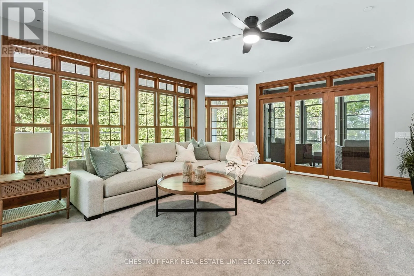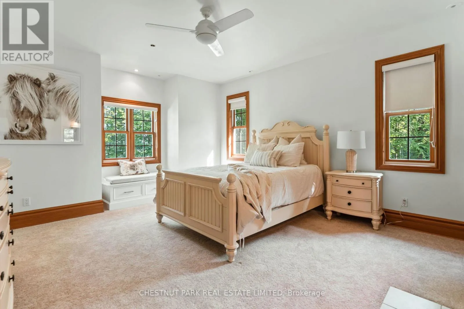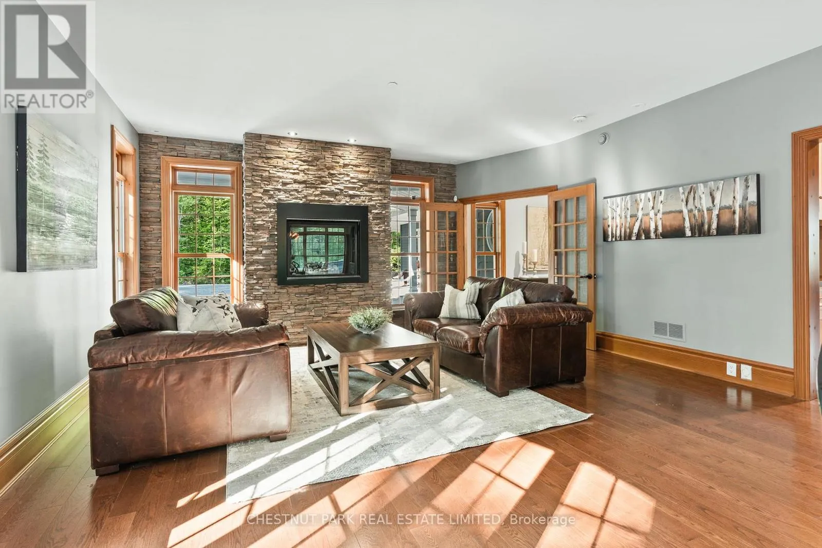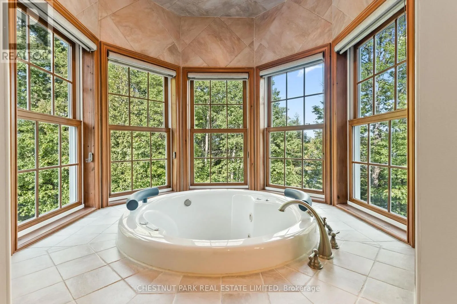 Cross Streets: Hwy 118 & Kushog Lake Road. ** Directions: Hwy 118 to Kushog Lake Rd to Buckslide to Nu Ne. Landmark estate on Boshkung Lake with 440 ft of pristine shoreline and just under five acres of unmatched privacy. Located in the heart of the Haliburton Highlands, this luxury waterfront property offers over 7,000 sq ft of finished living space and an exceptional four-season lifestyle. The custom-built home features 4 bedrooms, including a breathtaking primary suite with fireplace, spa-inspired ensuite with soaker tub overlooking the lake, walk-in closet, and private lakeside deck with panoramic views. The gourmet eat-in kitchen is designed for both everyday living and entertaining, with premium appliances, custom cabinetry, expansive prep space, and a sunlit breakfast area, complemented by a butler's pantry. A grand dining room with fireplace creates a perfect setting for hosting, while multiple living areas capture uninterrupted lake views and provide seamless indoor-outdoor flow. The fully finished walkout lower level offers a home theatre and games area, fitness room, additional flex space, and a spa-like bath for year-round enjoyment. Outdoor living is elevated with maintenance-free Trex decking, hot tub, and professionally landscaped grounds featuring tiered gardens, lakeside pathways, irrigation system, and ambient lighting, creating a private resort-style setting. A secondary driveway, carport, and 4-car insulated garage add convenience and functionality. Two composite docking systems provide excellent access for boating, swimming, and watersports on one of Haliburton's most sought-after lakes. A rare opportunity to own a generational waterfront estate in one of Ontario's premier cottage country destinations. (id:27476)