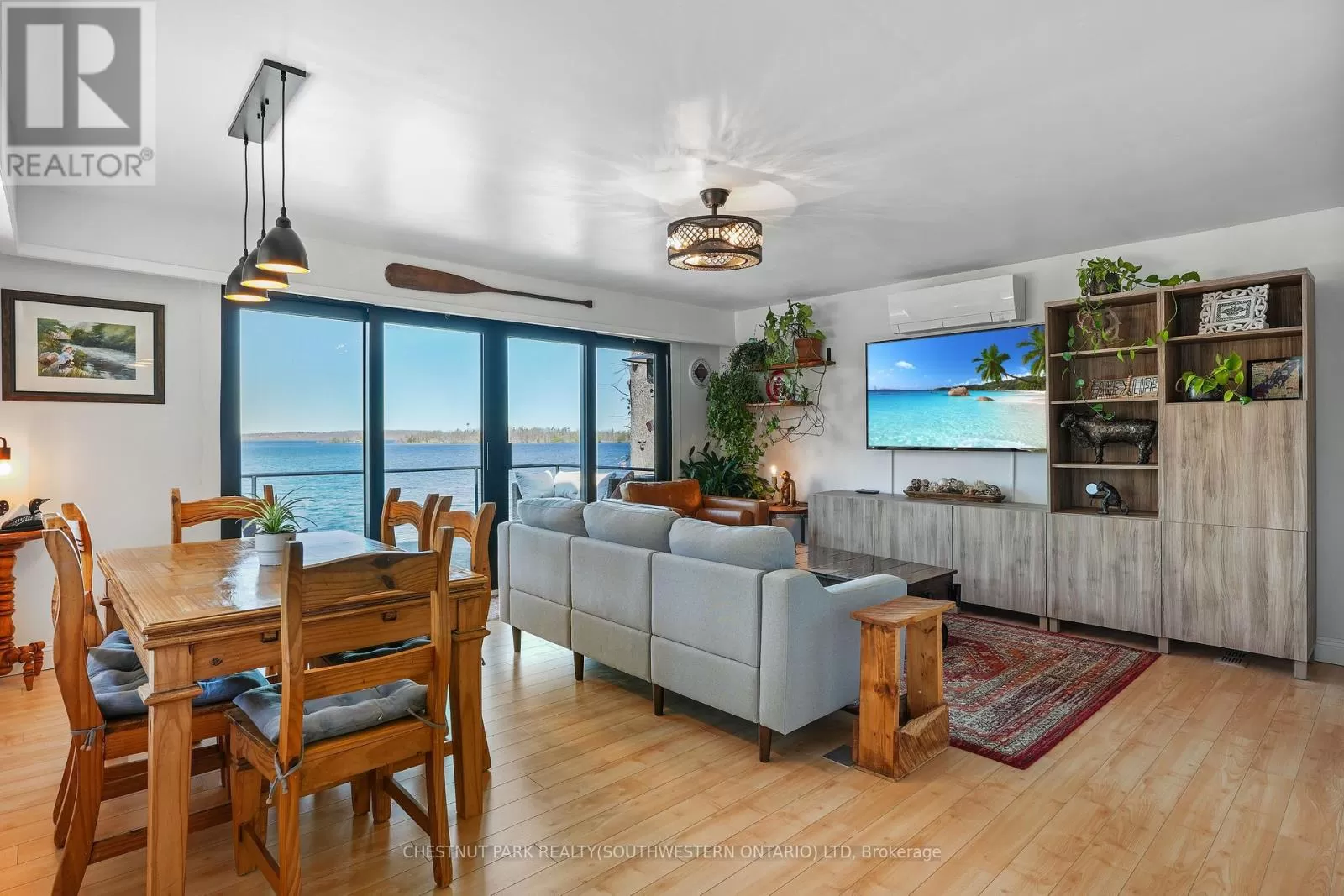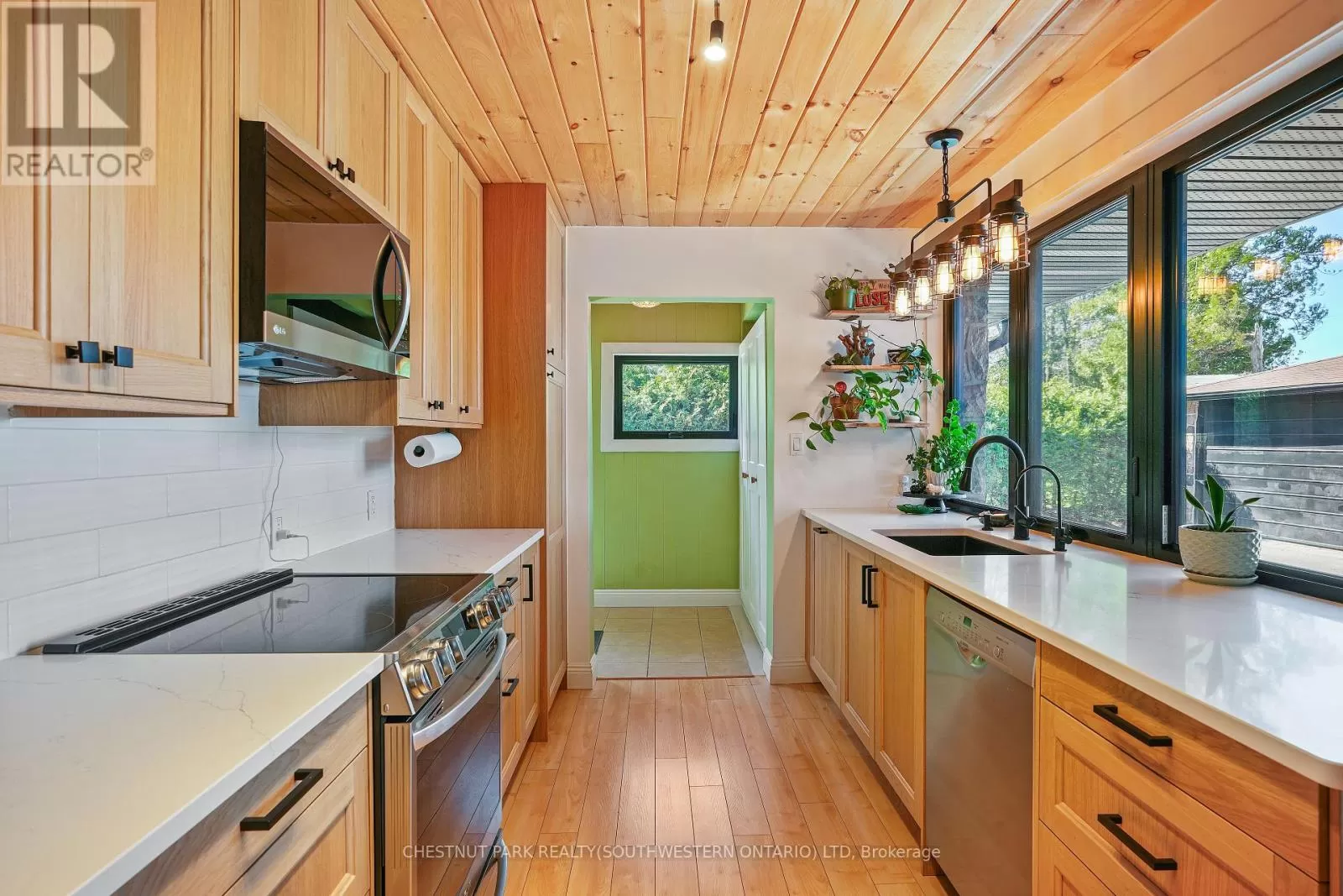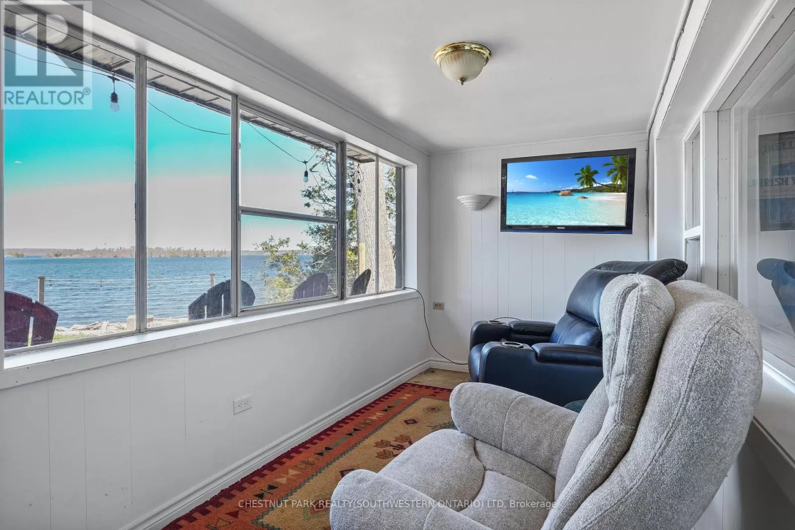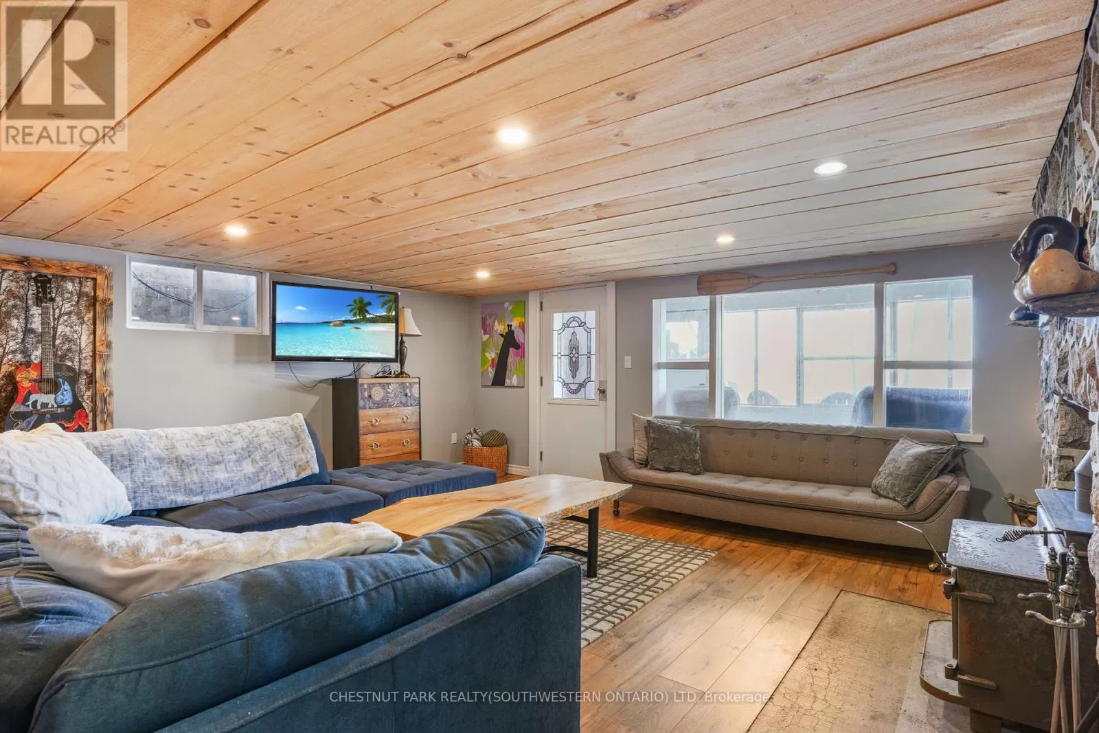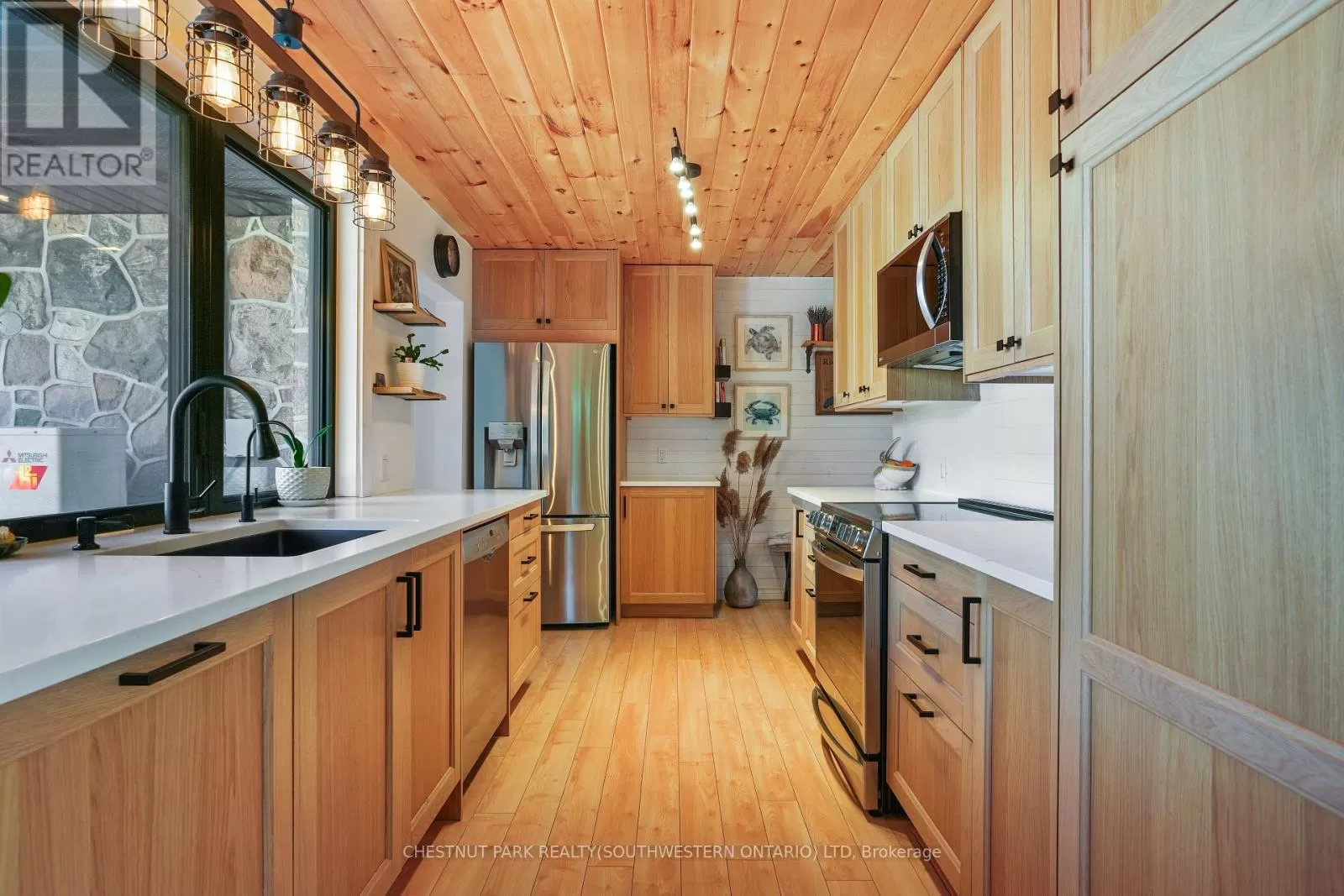 Cross Streets: Robins Road. ** Directions: Turn left on Rolling Banks Road, stay to the right and follow around going west to number 41B on the waterfront side. Your Waterfront Escape Awaits! Nestled on the serene south shores of Rice Lake, this property offers 75 feet of sparkling, west-facing waterfront - the perfect backdrop for unforgettable sunsets and year-round relaxation. Whether you're searching for a permanent residence or a four-season cottage getaway, this beautifully updated stone bungalow has it all. Inside, you'll find 3+1 bedrooms and 2 full bathrooms, including a finished walkout basement complete with a wood burning fireplace, sunroom and spacious rec room ideal for hosting family and friends. Enjoy the convenience of main-floor laundry, a brand-new kitchen with appliances (2024), and extensive updates including new windows, doors, soffit, fascia, and eavestroughs (2023). Efficient and comfortable living is ensured with three heat pumps and UV water filtration (2023). Step outside and explore the meticulously maintained grounds. A detached 3-car garage with a wood-burning fireplace offers extra storage or a great workshop space, while two fire pits set the scene for cozy summer nights under the stars. Water enthusiasts will appreciate the dry double-slip boathouse equipped with rails, electric winches, and cables, plus a 50' aluminum Ritley dock system featuring a swim ladder and sandy/rocky shallow entry into the clear waters. A concrete seawall provides long-term shoreline protection. Eco-conscious buyers will love the owned 10 KW solar panel system, supplying power directly to the home and R60 attic insulation. Located at the quiet end of a dead-end road, this once in a lifetime opportunity promises peace, privacy, and the ultimate waterfront lifestyle. (id:27476)