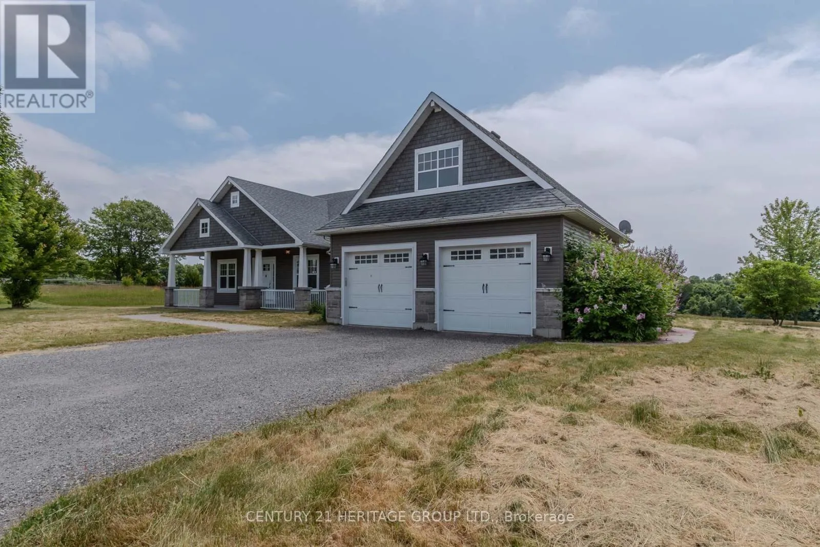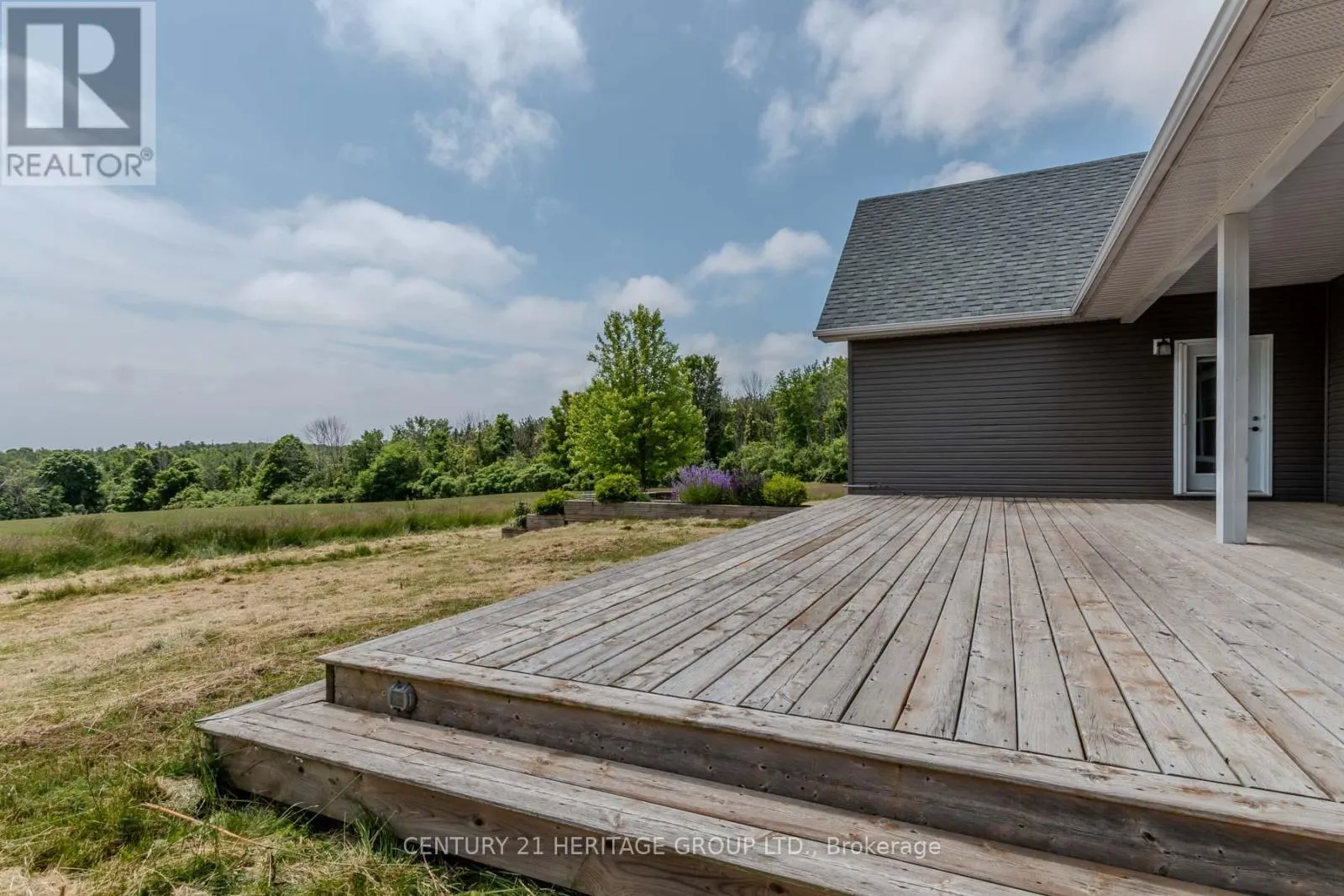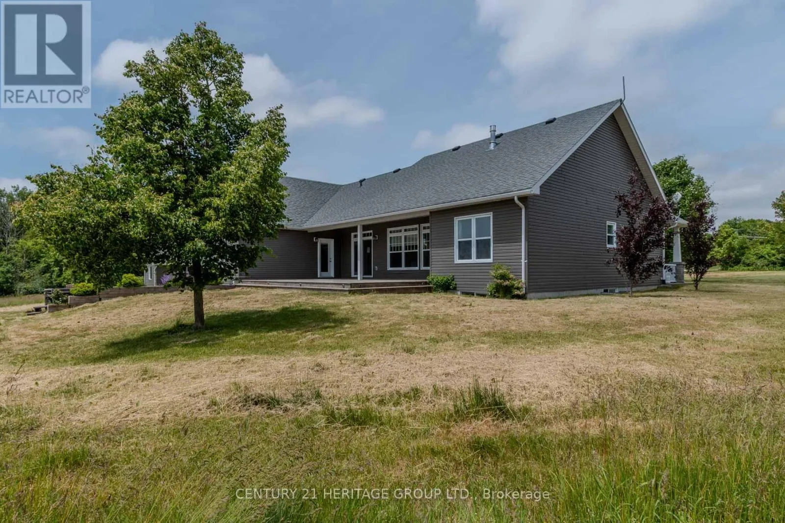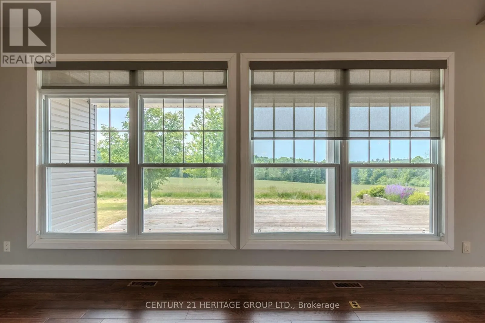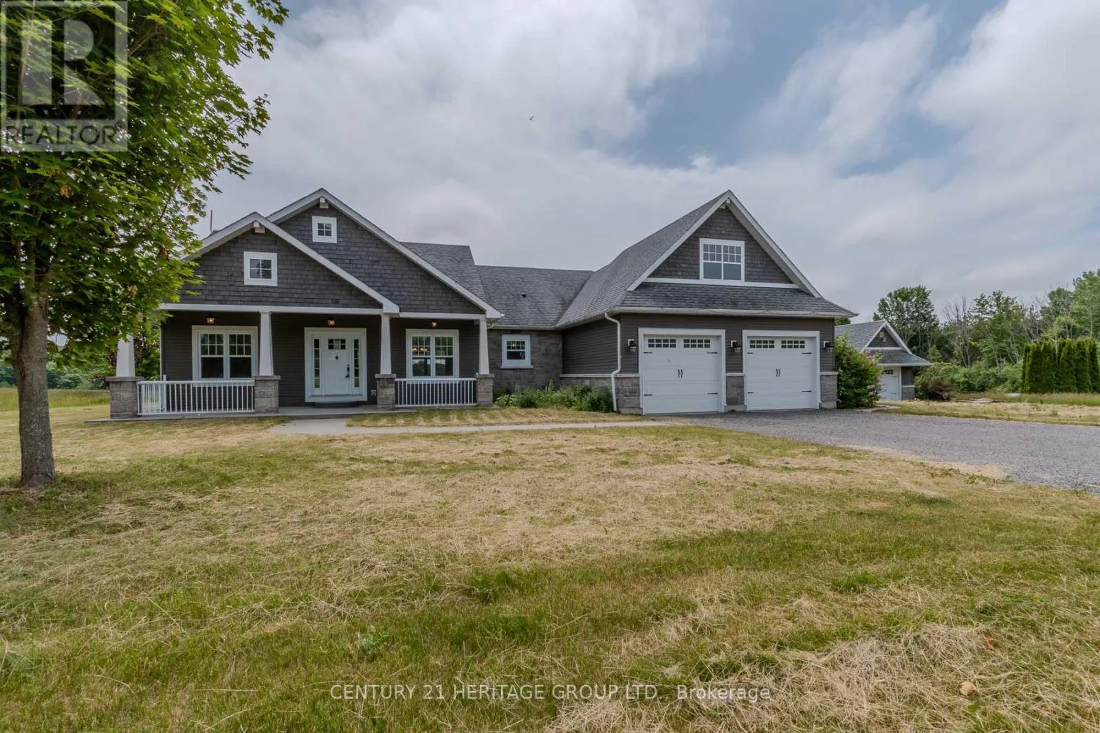 Cross Streets: 401 & 23 (north of Grafton). ** Directions: about 1km north from 401 on 23/Lyle St. East on Boyle about 500m. Property on South Side. Address marker on north side. Stunning bungalow on over 7.5 acres of peaceful, private countryside, just 5 minutes to Grafton and Hwy 401. This beautifully maintained home offers incredible views of forests and farm fields, with southern exposure filling the home with tons of natural light. The open-concept layout features a split-bedroom floor plan, hardwood and tile flooring throughout the main level, and a vaulted ceiling with wood beam accent in the living room. Enjoy the cozy ambiance of a stone surround propane fireplace and expansive windows framing the scenic landscape. The kitchen boasts a functional layout with a centre island and breakfast bar, stone countertops, crown molding, pendant lighting, and ample cabinetry and drawers for storage. The spacious primary suite includes a walk-in closet, luxurious 5pc ensuite, and a private walk-out to the deck. Main floor laundry with powder room and direct access to an attached 2-car garage adds convenience. A separate oversized 1-car garage provides extra storage or space for equipment. The bright lower level is mostly finished with large windows, an additional bedroom, 3pc bath, and flexible space for recreation, office, or hobbies. (id:27476)