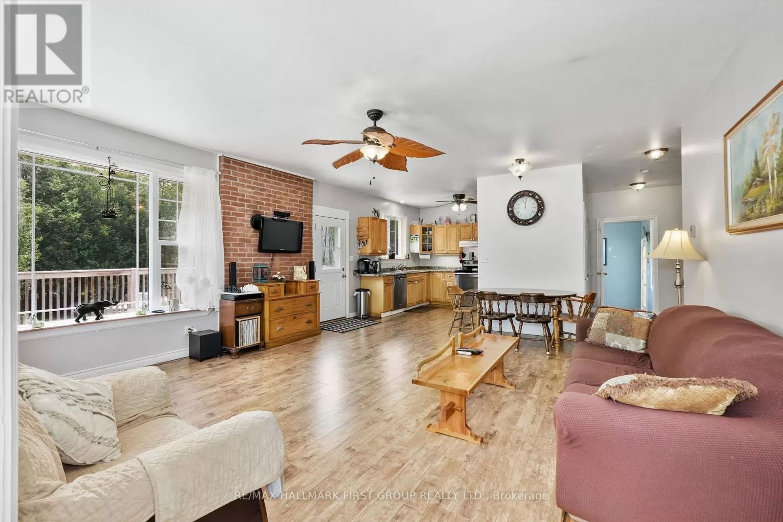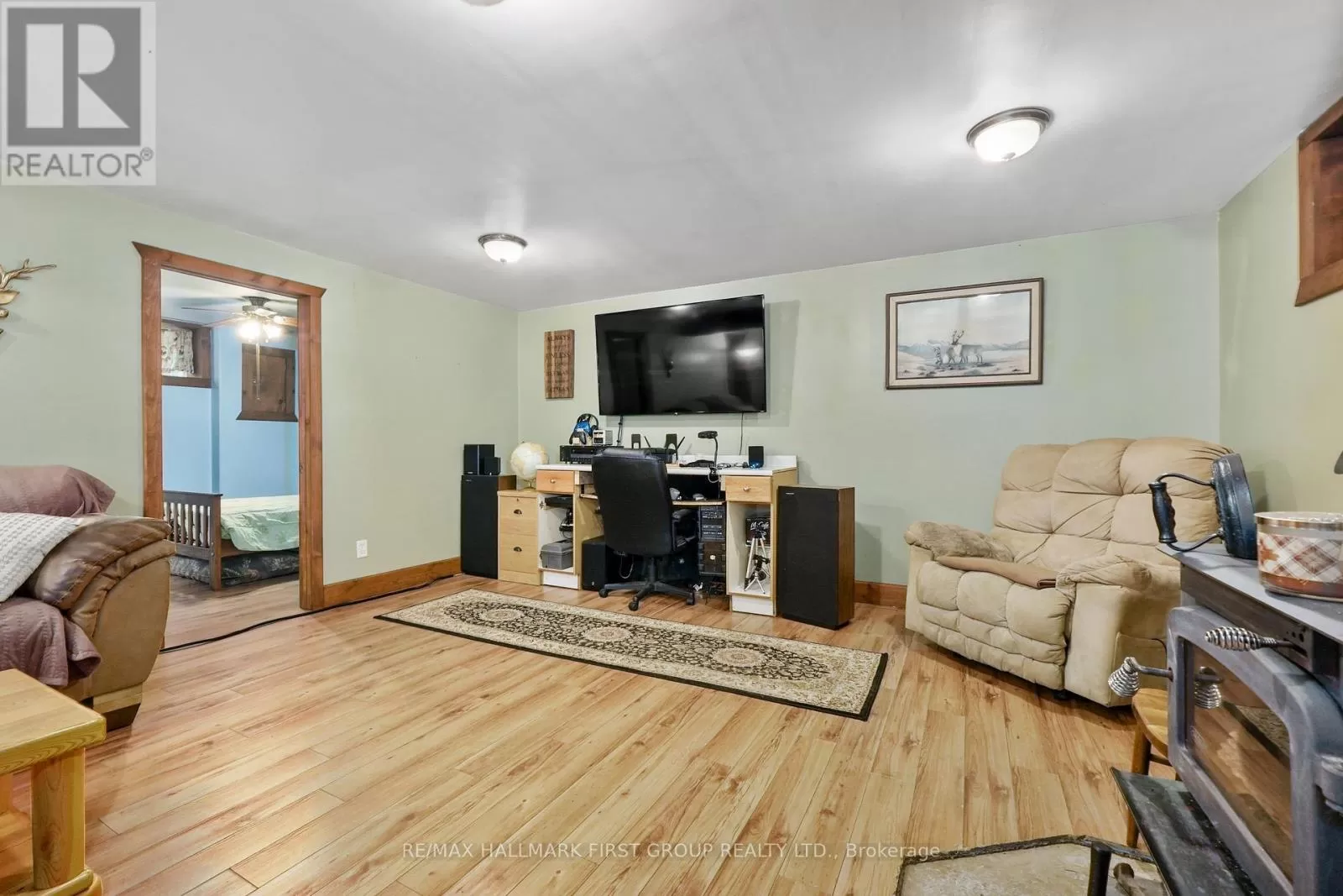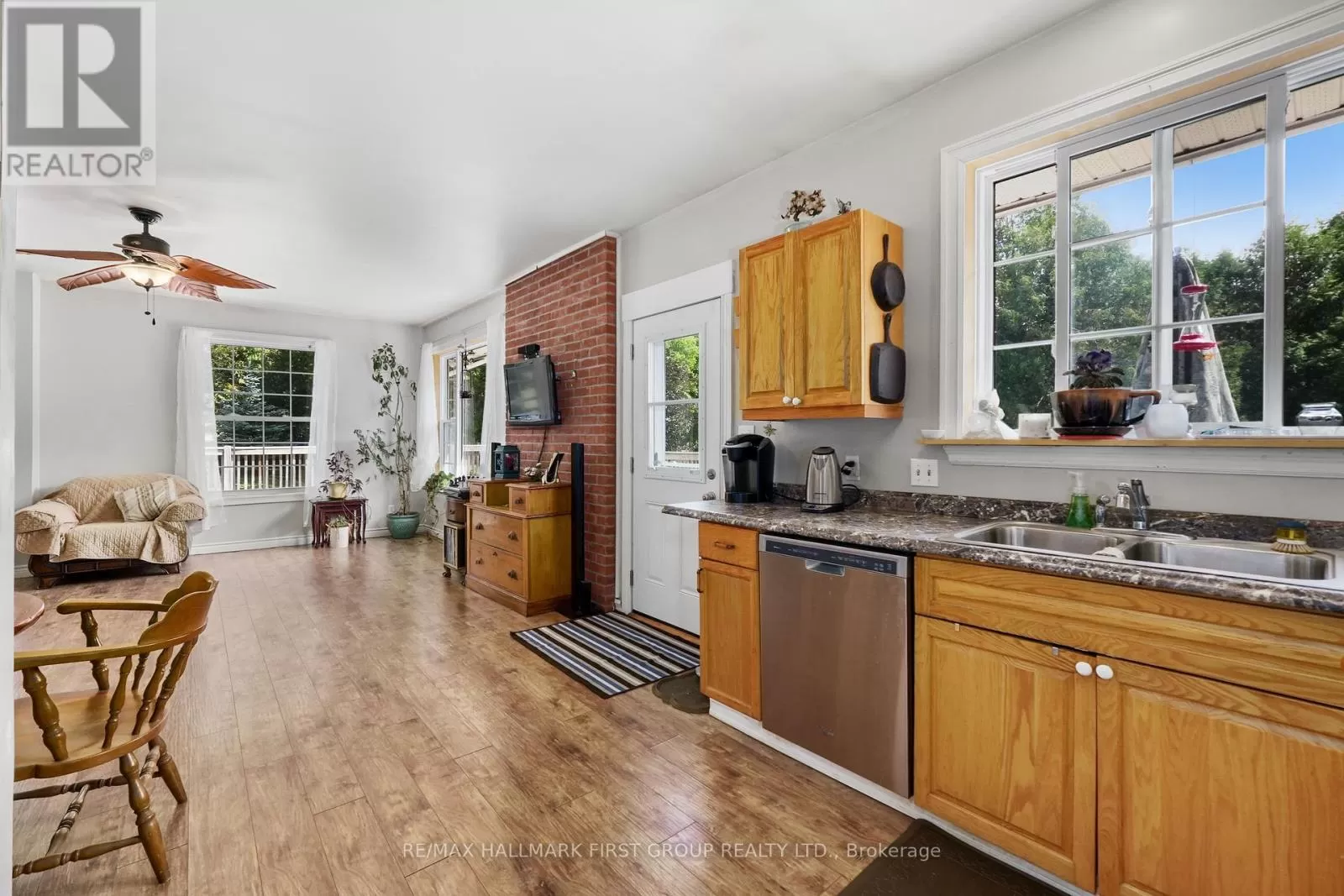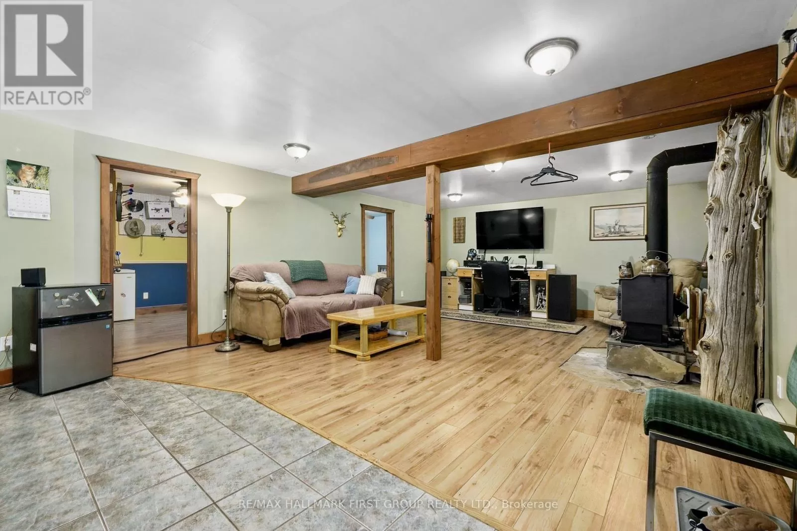 Cross Streets: 1st Line Rd & Packer Rd. ** Directions: CR45 heading North, Left onto Roseneath Landing Rd, Left onto 1st Line Rd. This charming bungalow sits on over an acre, just minutes from Rice Lake, and offers more than meets the eye. It features a large shop ideal for a home-based business, workshop, or car enthusiast, as well as a potential in-law suite with a separate entrance. Inside, the bright and airy main floor boasts a carpet-free layout, featuring large windows, an exposed brick accent wall in the living room, and an open-concept design that is ideal for everyday living and entertaining. The kitchen is equipped with stainless steel appliances, ample cabinetry, and a convenient walkout, perfect for alfresco dining on warm evenings. A generous primary bedroom, a full bath, and laundry complete the main level. The lower level expands your living space with a sprawling rec room warmed by a wood stove, featuring a walkout to a covered patio, a games area, a bedroom, an office, and a bathroom, offering comfort and flexibility for family or guests. Outside, enjoy the serenity of a wraparound deck, mature trees, a garden space, and ample room for outdoor enjoyment. A large detached shop and a separate shed to keep lawn tools organized and out of sight. Peaceful and private, yet still within reach, this is a place to spread out, settle in, and make your own. (id:27476)