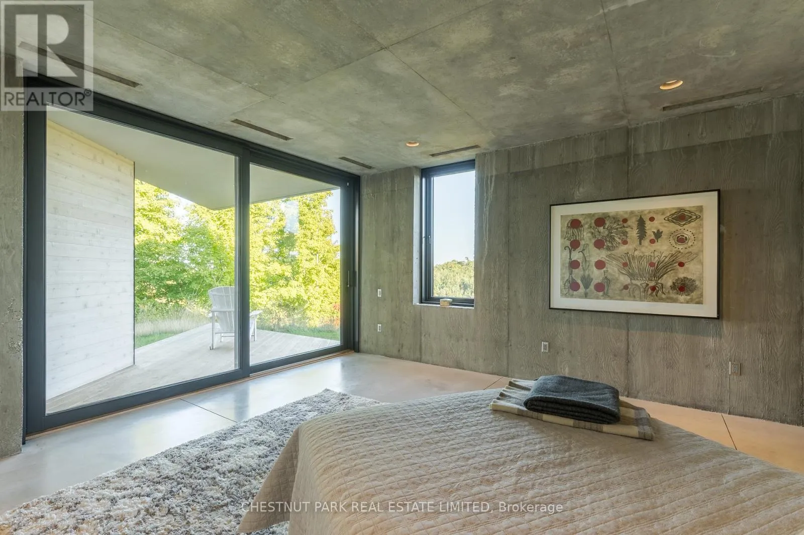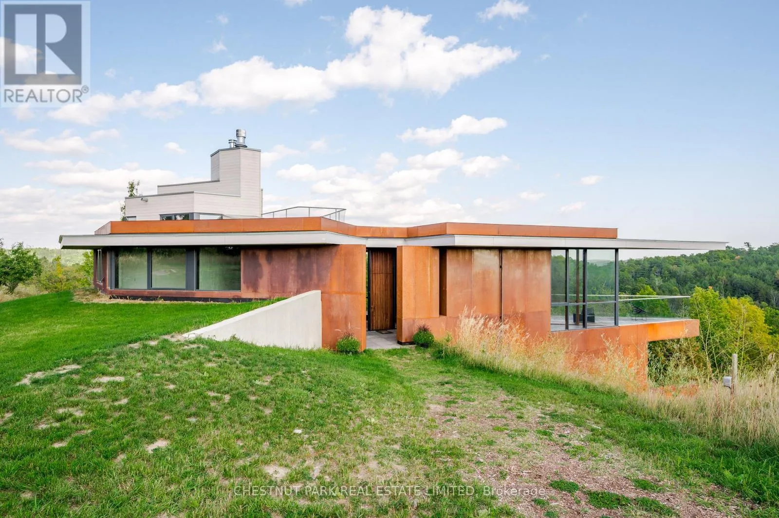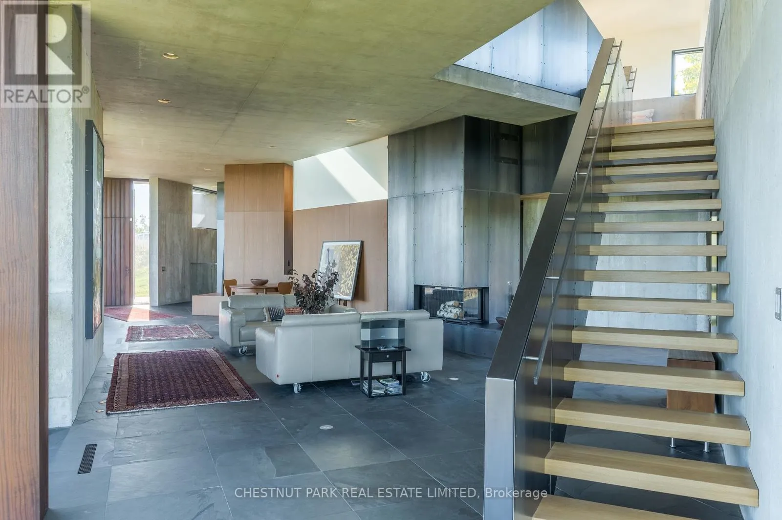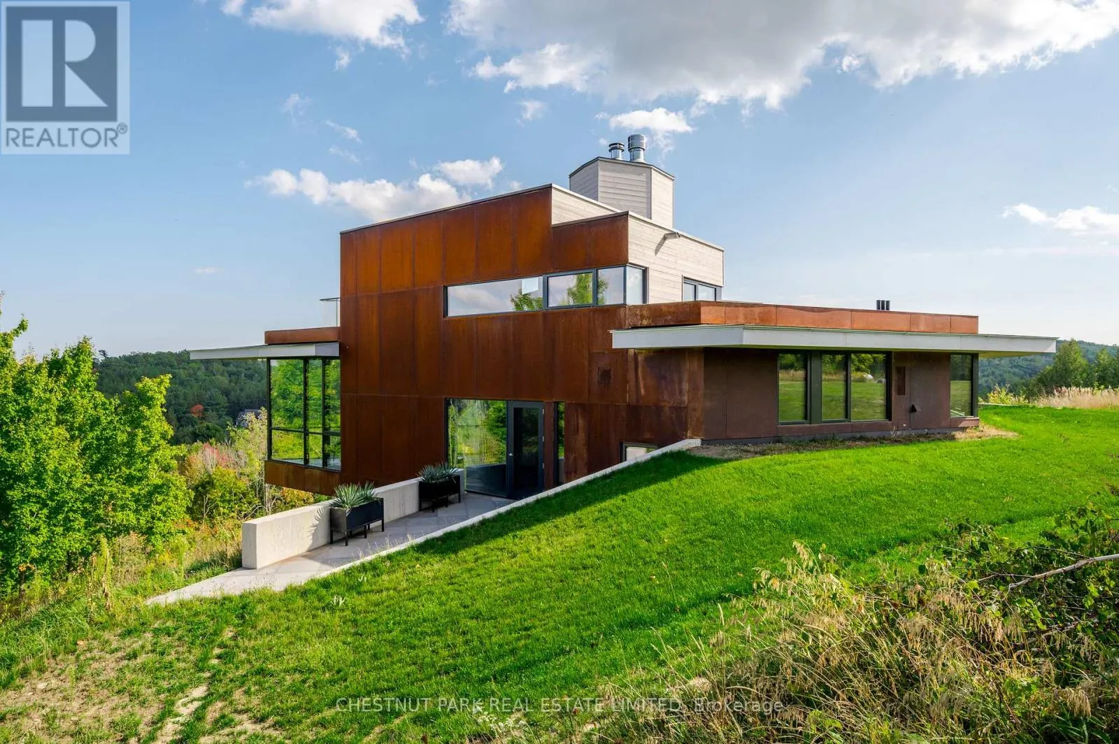 Cross Streets: Massey Rd. & Clouston Rd. ** Directions: N. from Massey Rd at St. Anne's Spa, N on Clouston to Helen's Lane. The Brillinger House. Architecture and nature harmonize in a magical setting with this stunning 2024 build, designed by Adam Thom. The structure brings the hills, forest, field and light into this contemporary home. The landscape is intended to stay as natural as possible, the terrain just mildly tamed. One is welcomed through a unique entrance, with shelter and open sky. No disappointment upon entering. The open concept living area invites you in, a magnificent expanse of doors, windows reaching from the floor to the soaring ceiling mirror natures earth to sky magic. Slate floors, wood textured concrete and warm teak walls all work in balance with the vistas. This main level is graced with The Great Room and fireplace, a subtle minimalist bar kitchen, massive deck, two bedrooms, and a sublime bathroom with a walk-in shower & separate 2nd 2 pc. One can also ascend a staircase to a sunlit quiet reading or meditating area that leads to a deck with 360 views of the countryside. Use the elevator or the grand open staircase to the ground level where a den/office space, with doors open to the glorious countryside. A grand master bedroom with a walkout stands as another opportunity to let nature in. Separate from the water closet, an open shower area leads to an open deck, outdoor shower and sauna. A 2nd potential kitchen, laundry are next to the room holding the state of the art heating and cooling system. Two homes sit on this, private, secluded 63 acres property, 5 min north of St. Anne's Spa in Grafton. The 2nd home, also included, Petit Brillinger, perfect as a guest home or rental, while a totally different design concept, offer 3 bedrooms, 2 baths and a warm open concept living, dining, kitchen. Offering the same private views and surroundings, each unseen by the other. Paths circle the property and take you to a natural spring fed pond, perfect for swimming, skating and picnics or a summer cocktails. This is your perfect retreat. (id:27476)