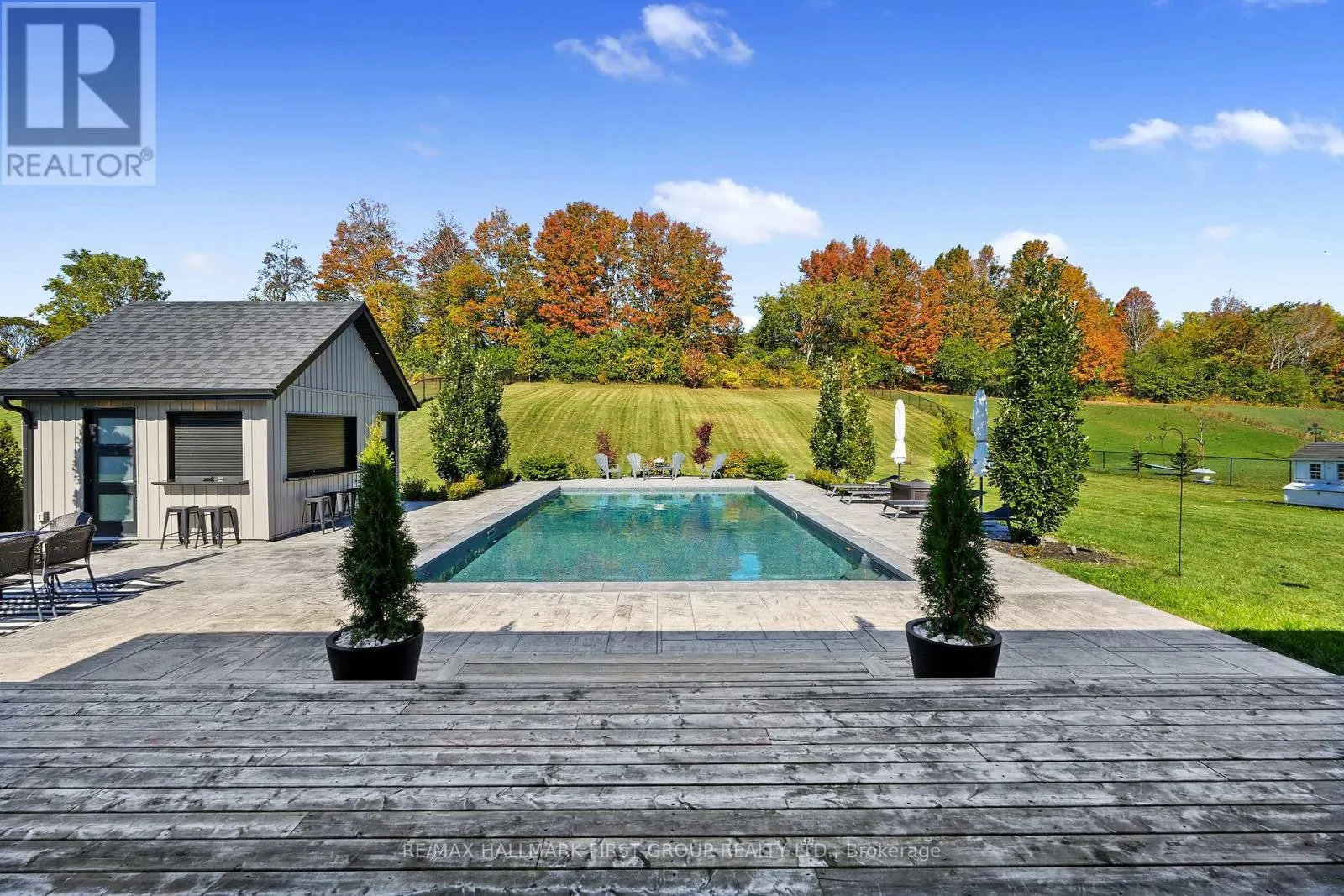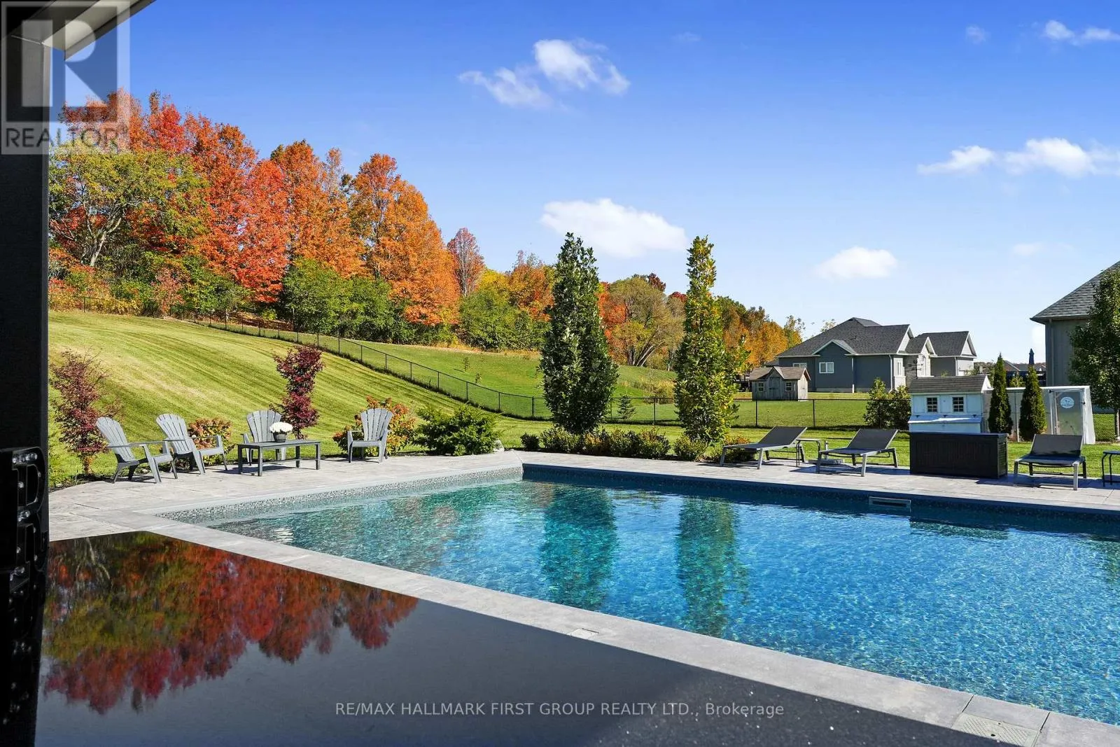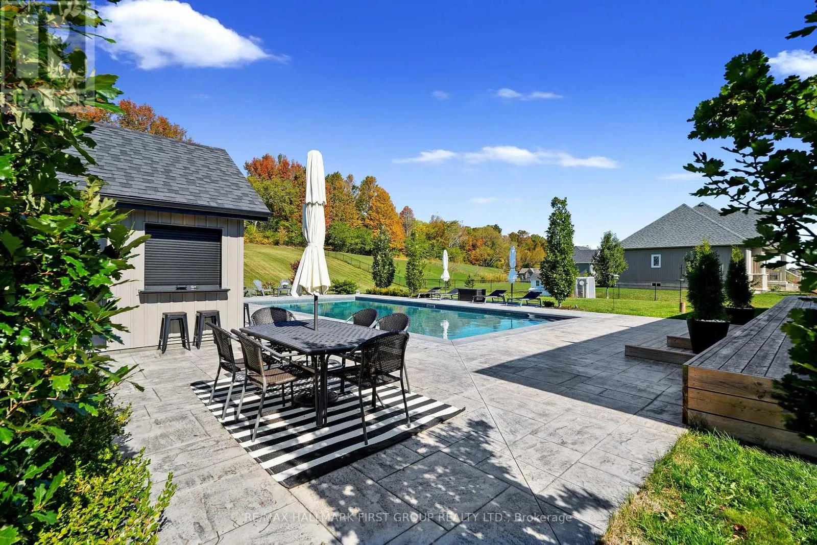 Cross Streets: Glens of Antrim Way & Brimley Rd S. ** Directions: CR2 heading East, Right onto Brimley Rd S, Left onto Glens of Antrim Way. Crafted as the builder's show home, this stunning property blends elegance and design across 1.28 acres. Designed for entertaining, this home features in-ceiling speakers in the kitchen, living room, and outdoor area, and is wired for sound in the poolside bar, the perfect setting for gatherings both large and small. A covered front porch leads into an open entry where craftsmanship and attention to detail are immediately evident. Throughout the home, 8" baseboards, high ceilings, and upgraded window and door casements enhance the sense of space and sophistication. The living room impresses with its recessed waffle ceiling, crown moulding, custom built-ins with integrated lighting, and a beautifully detailed fireplace mantel. The open-concept kitchen offers ceiling-height cabinetry, under-cabinet lighting, stainless steel appliances, and large island with breakfast bar. The adjoining dining area features a recessed ceiling, ample room for large gatherings, and a walkout to the backyard. The primary suite offers a tranquil retreat with a tray ceiling, crown moulding, private walkout, walk-in closet, and a luxurious ensuite featuring heated floors, dual vanity with quartz counters, freestanding tub, and glass-enclosed shower. Two additional bright bedrooms and a full bathroom are situated on the opposite side of the home for added privacy. Completing the main level is a powder room, convenient laundry, and access to the double car garage with 13' ceilings. The lower level expands the living space with a generous rec and media area, built-ins, a games area, guest bedroom, and full bathroom. Step outside to your backyard oasis featuring a fenced yard, sprawling covered deck with added privacy, landscaped patio, inviting inground pool, lounging areas, and stylish pool house with bar and changing area. Ideally located just moments from amenities with easy access to Hwy 401, this property offers modern design, thoughtful details, and resort-inspired living all in one. (id:27476)