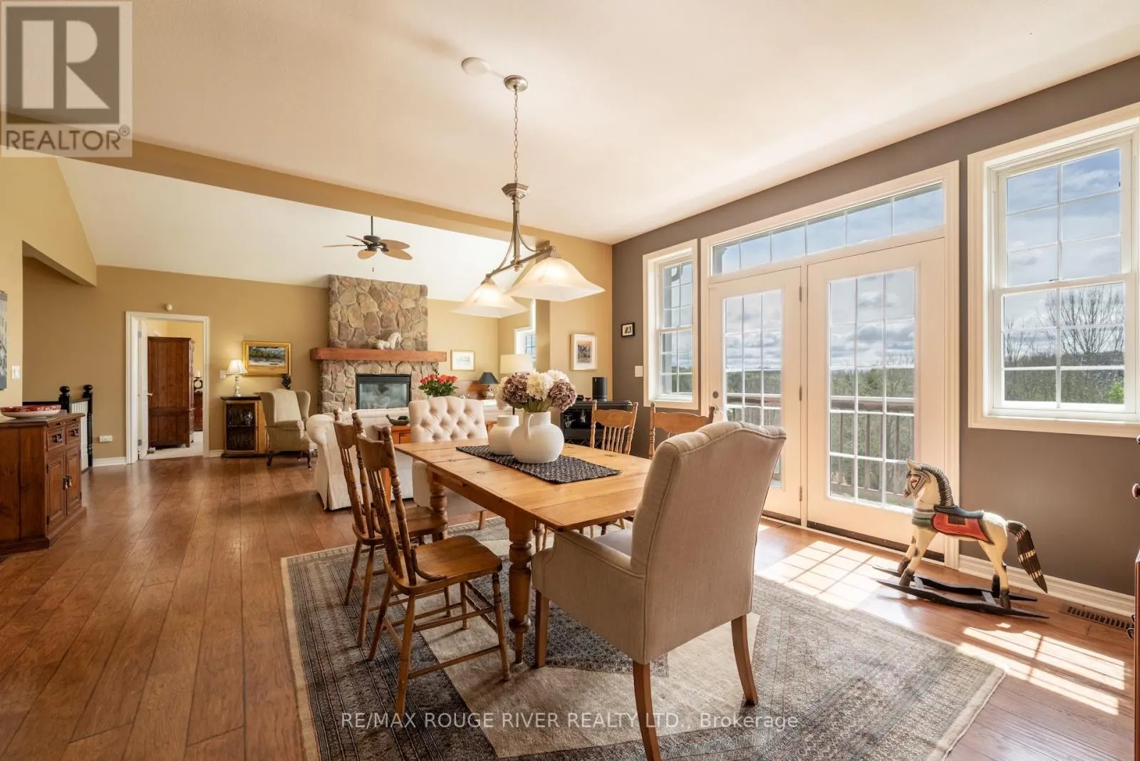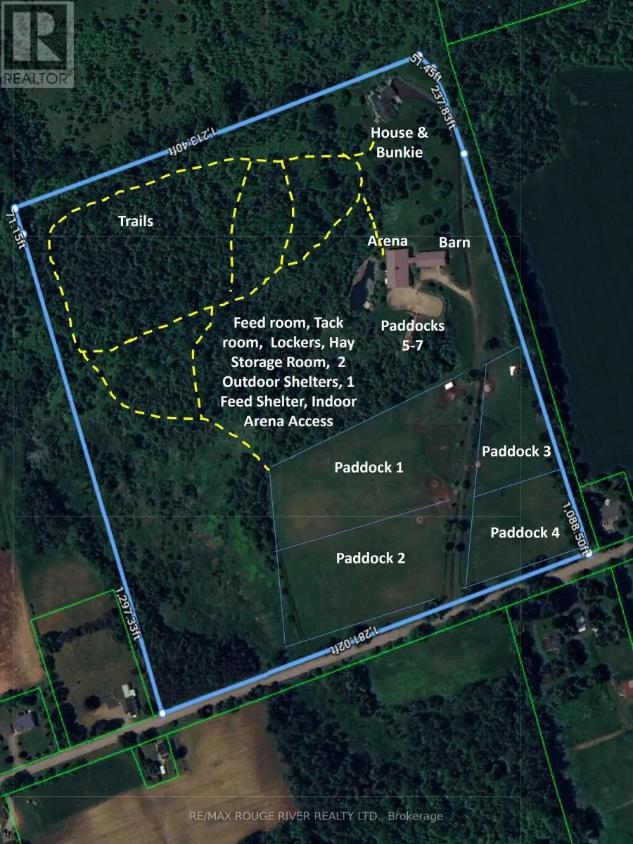 Cross Streets: CR 23. ** Directions: Off of CR 23. Perched atop 40 breathtaking acres in the rolling Northumberland Hills, this is a fully realized private equestrian centre offering panoramic views, refined living, and turnkey infrastructure rarely found east of the GTA. The custom-built residence is designed for elegant single-level living and effortless entertaining. Vaulted ceilings crown the great room, anchored by a striking stone fireplace. A gourmet kitchen opens seamlessly to an expansive dining area, ideal for hosting. The main-floor primary suite features a walk-in closet, spa-inspired ensuite, and private balcony capturing spectacular sunrise vistas. A welcoming den, sunroom, and beautifully finished lower level with walkouts provide exceptional space for family, guests, and recreation. A separate bunkie adds flexibility for extended family, or guests and a full backup generator provides peace of mind. What truly sets this estate apart is its professional-grade equestrian facility. The modern 8-stall barn includes tack, feed, and storage rooms and connects directly to a bright 6,000 sq ft indoor riding arena with excellent footing and ceiling height. The lower acreage is thoughtfully laid out with 7 paddocks, open pasture, woodland riding trails, and a bass-stocked pond, creating a private training and lifestyle environment. This offering represents a rare opportunity to acquire a complete equestrian operation within easy reach of the GTA - ideal for the serious rider, trainer, or investor seeking a turnkey rural enterprise without compromise. A property of this calibre is seldom available in Northumberland County. (id:27476)